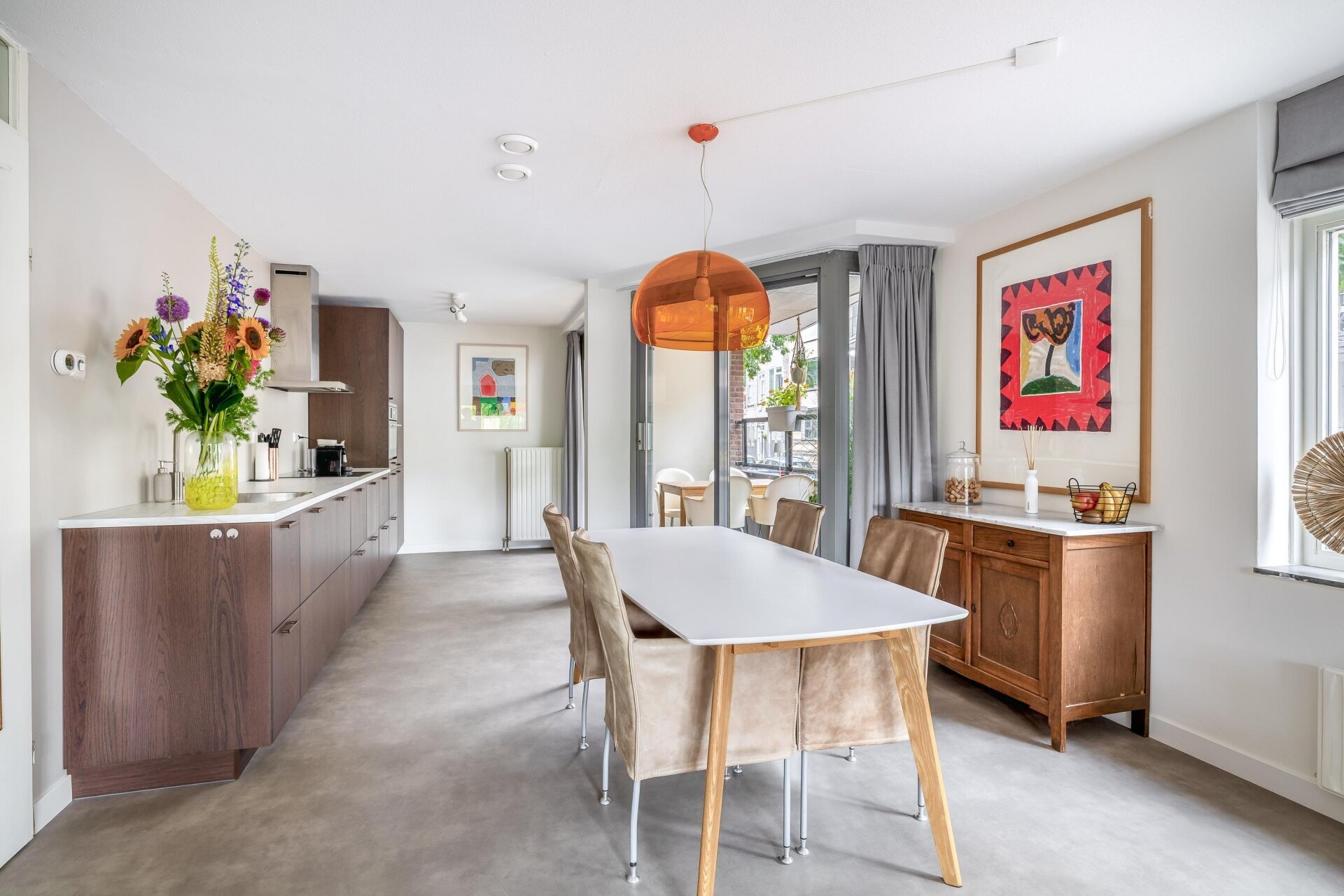 De woonkamer loopt over in de open keuken. Een ideale opstelling voor wie houdt van contact met huisgenoten of gasten tijdens het koken. De keuken is strak en stijlvol afgewerkt in warme houttinten, en voorzien van alle moderne gemakken. Denk aan een inductie kookplaat, oven, koel-vriescombinatie en genoeg opbergruimte, alles wat je nodig hebt binnen handbereik.