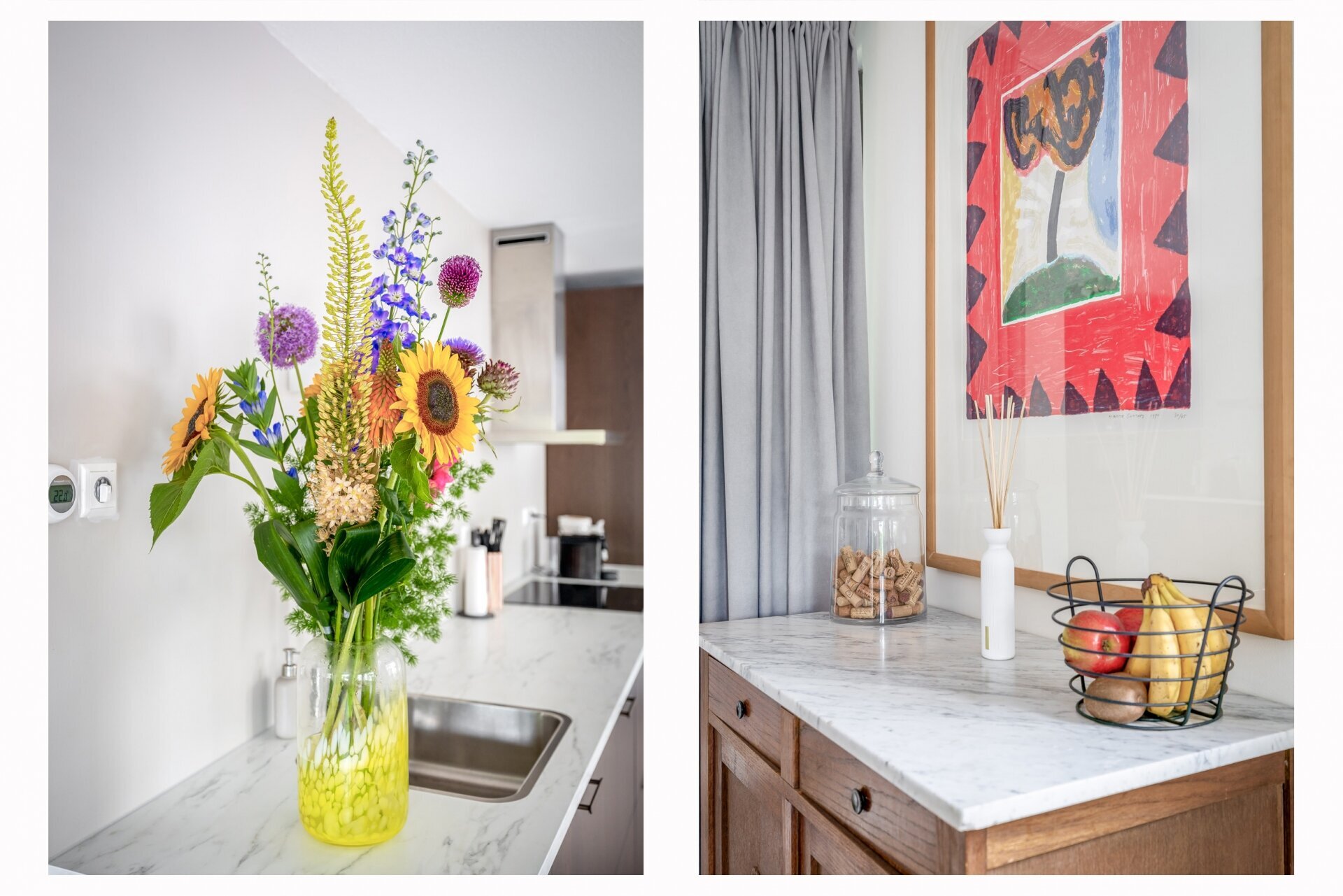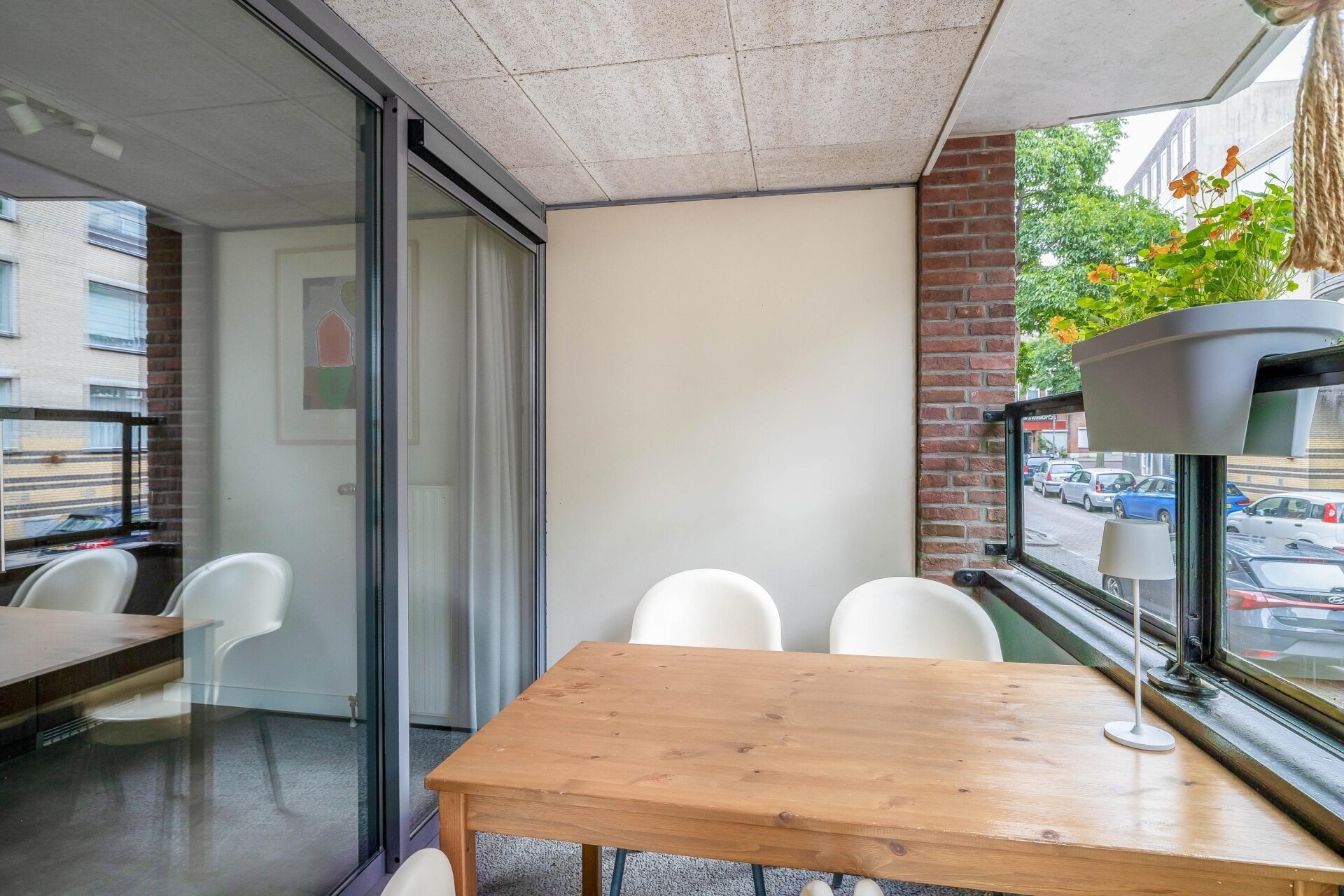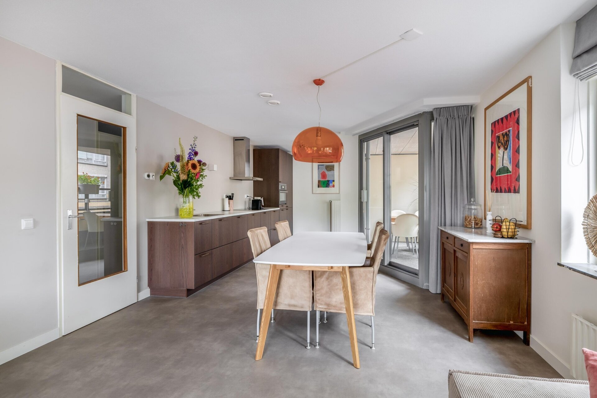 Vanuit de keuken stap je via een glazen schuifdeur zó het overdekte balkon op. Deze plek voelt als een verlengstuk van je woonkamer: een gezellige, groene buitenruimte waar je heerlijk beschut zit. Begin je ochtend hier met een kop koffie of sluit de dag af met een goed glas wijn, of het nu lente, zomer of herfst is, dit balkon maakt van elk moment iets bijzonders.