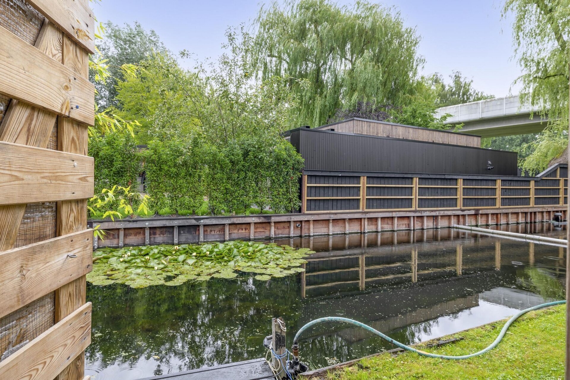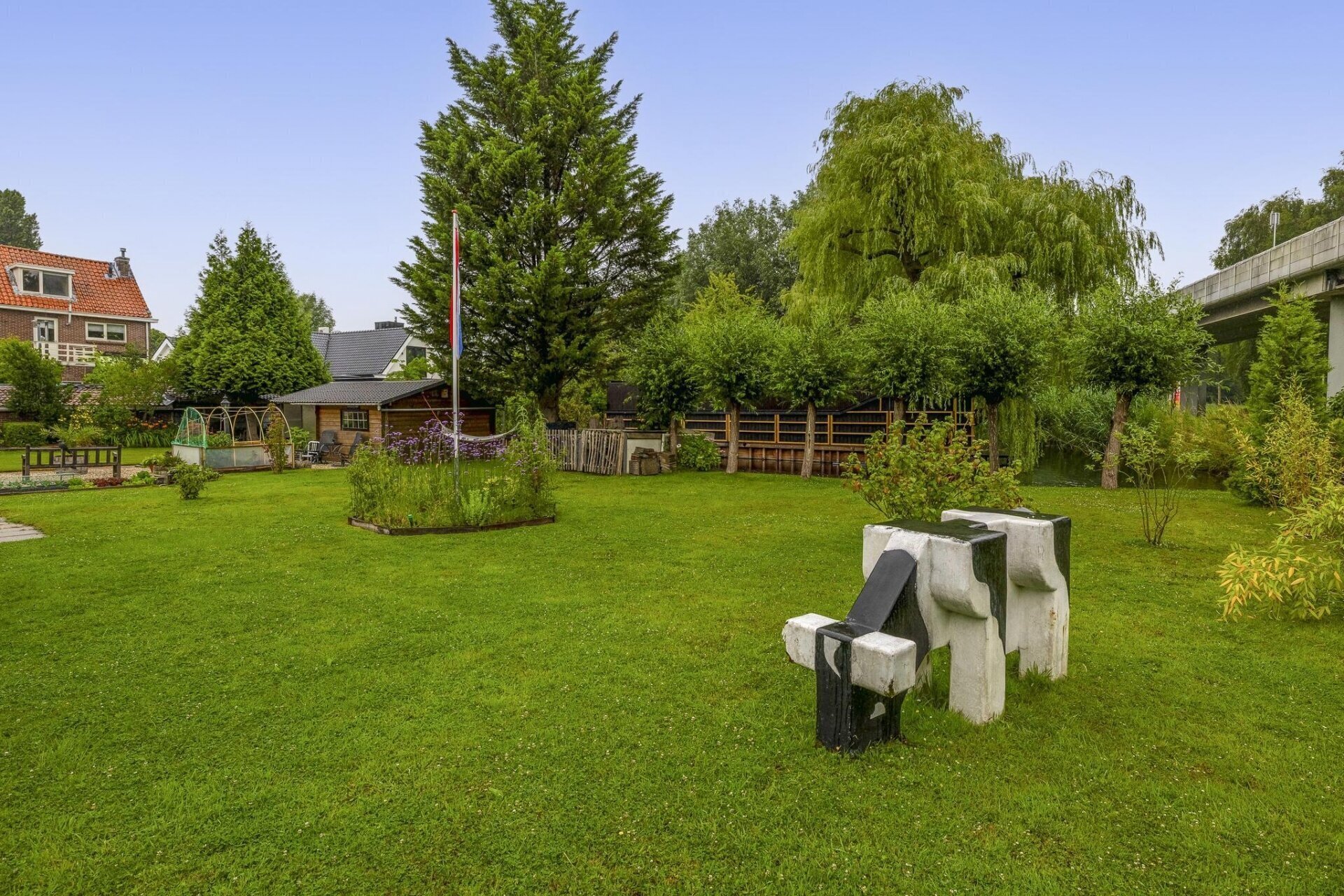De riante achtertuin is gelegen aan het water en bestaat grotendeels uit gazon.