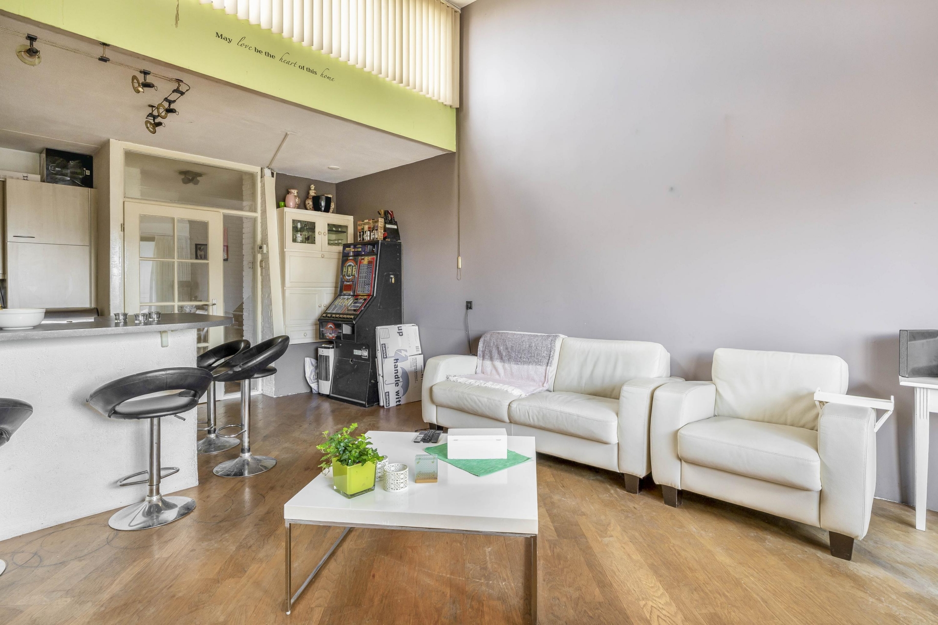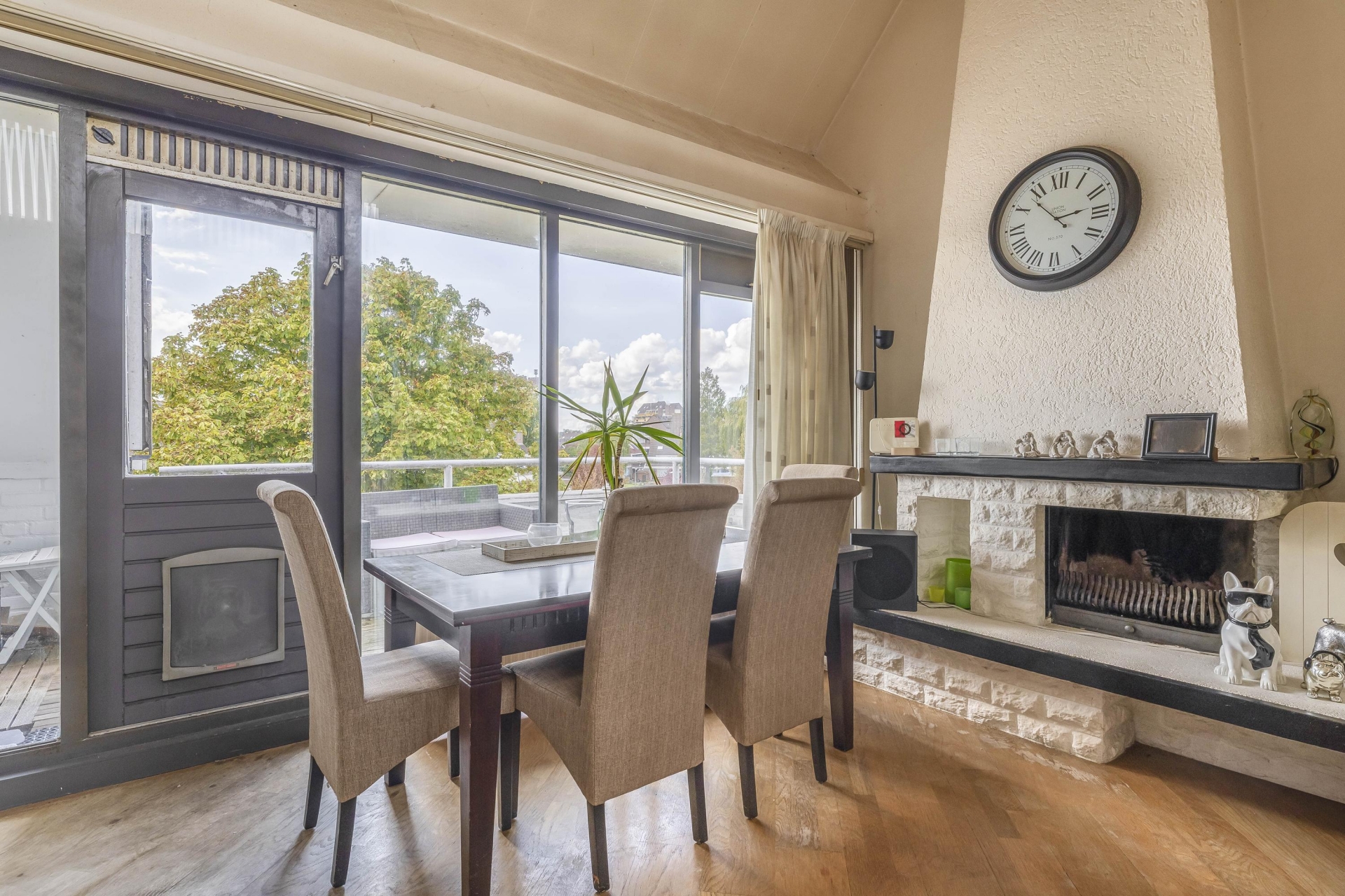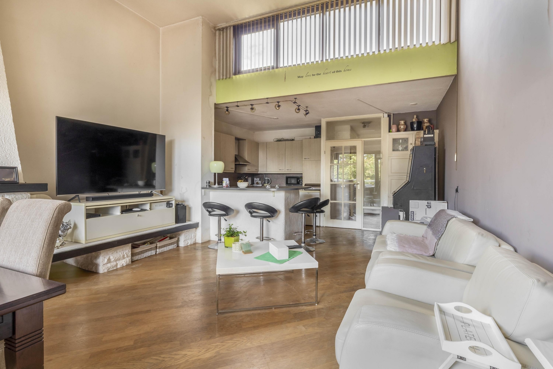 Een verdieping hoger is de woonkamer met hoog plafond en grote raampartijen te vinden. De keuken is functioneel opgezet in een hoekopstelling met veel kastruimte en inbouwapparatuur. De bar tussen keuken en woonkamer maakt het extra gezellig: ideaal voor een snel ontbijt of een drankje met vrienden. De ruimte is voorzien van een houten vloer en een neutrale afwerking die je eenvoudig naar je eigen smaak kunt stylen. Ook een openhaard ontbreekt niet: een sfeervolle toevoeging die voor extra warmte zorgt in de wintermaanden. Met wat liefde en (kleine) aanpassingen is hier een prachtige plek van te maken!
