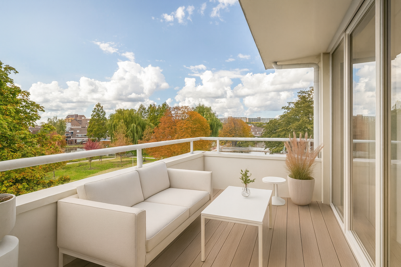 Grenzend aan de woonkamer ligt het terras van circa 10 m² op het zuidwesten. Hier geniet je van de middag- en avondzon met vrij zicht over het water. Dankzij de ligging op het zuiden én het ontbreken van directe inkijk is dit een heerlijke plek om te ontspannen of buiten te eten.