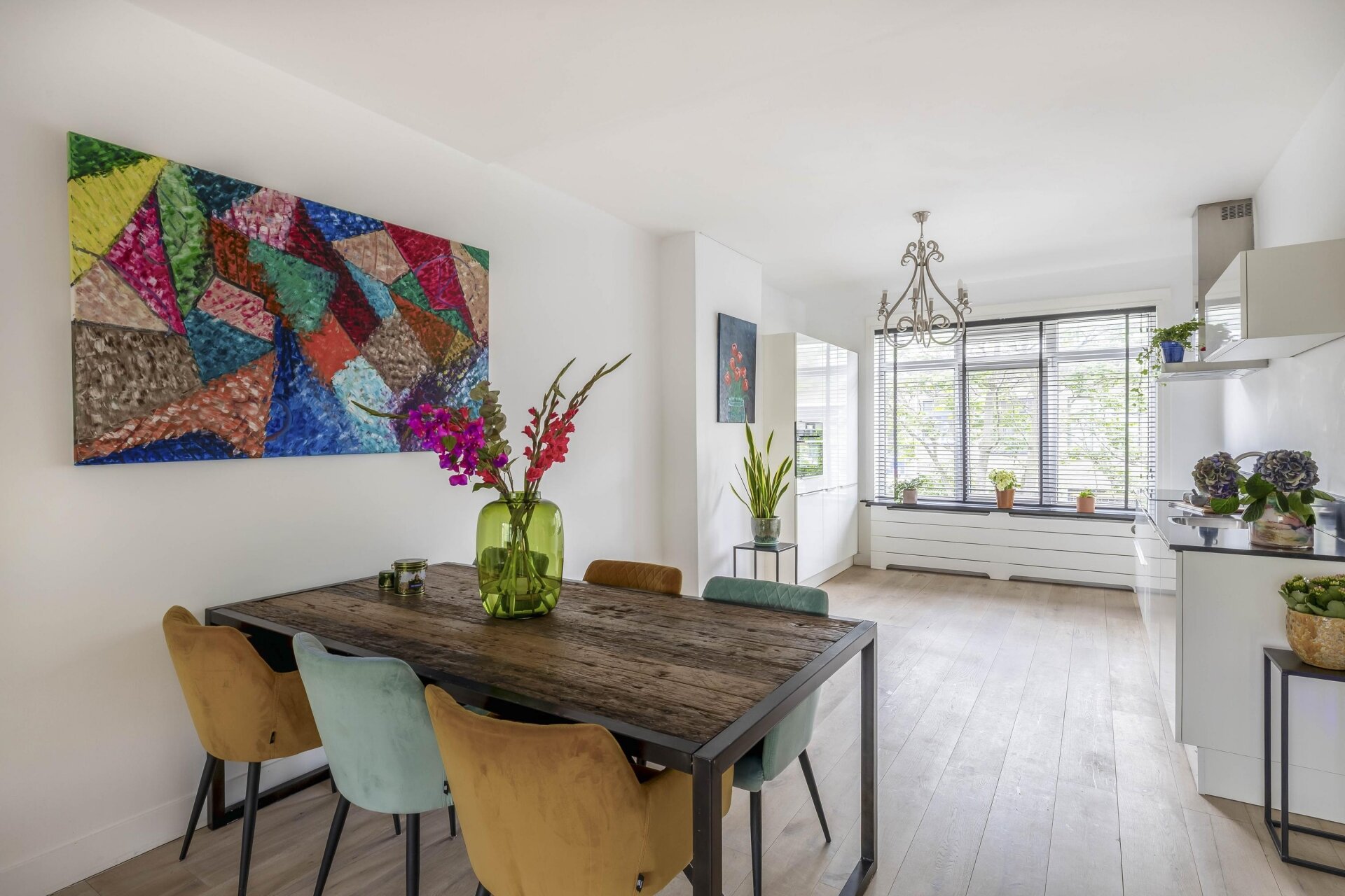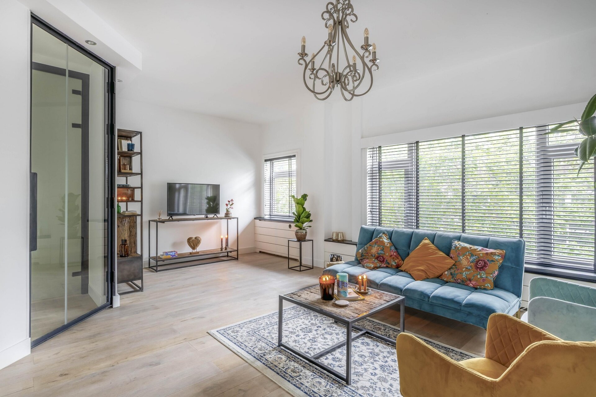 Via de stoere stalen deuren stap je binnen in de woonkamer die indruk maakt door ruimte en licht. Dankzij de grote ramen aan beide zijden heb je de hele dag zonlicht en een prachtig uitzicht op de groene straat. De houten vloer, strak gestuukte wanden en stijlvolle details maken dit de ideale plek om te ontspannen of gasten te ontvangen. Hier voel je je meteen thuis.