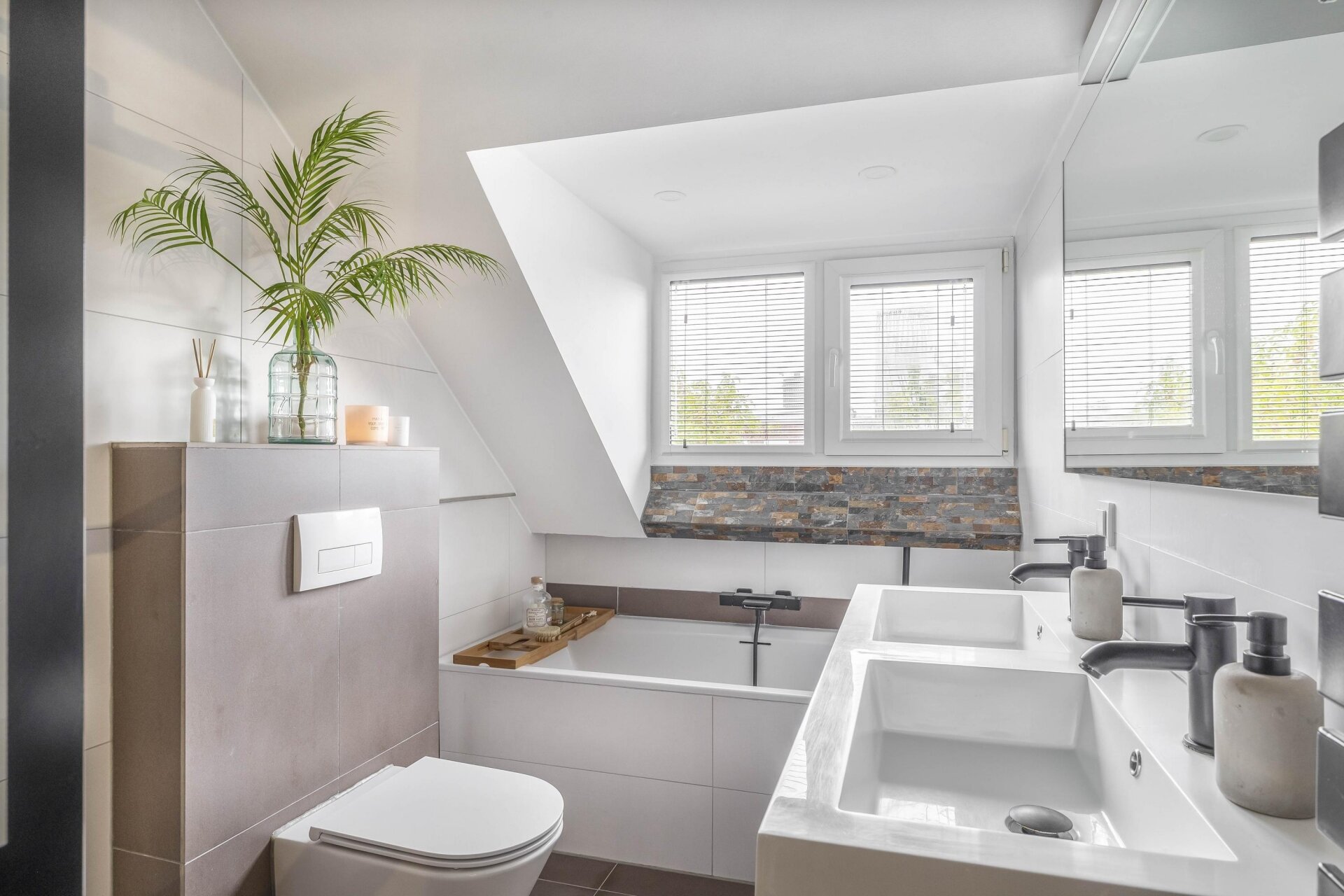 Op de derde verdieping vind je de luxe badkamer, ingericht met alles wat je nodig hebt om je dag goed te beginnen of juist ontspannen af te sluiten. Een ruime inloopdouche met glazen wand, een ligbad, een dubbele wastafel met modern meubel én een extra toilet maken dit een badkamer waar je elke dag blij van wordt.