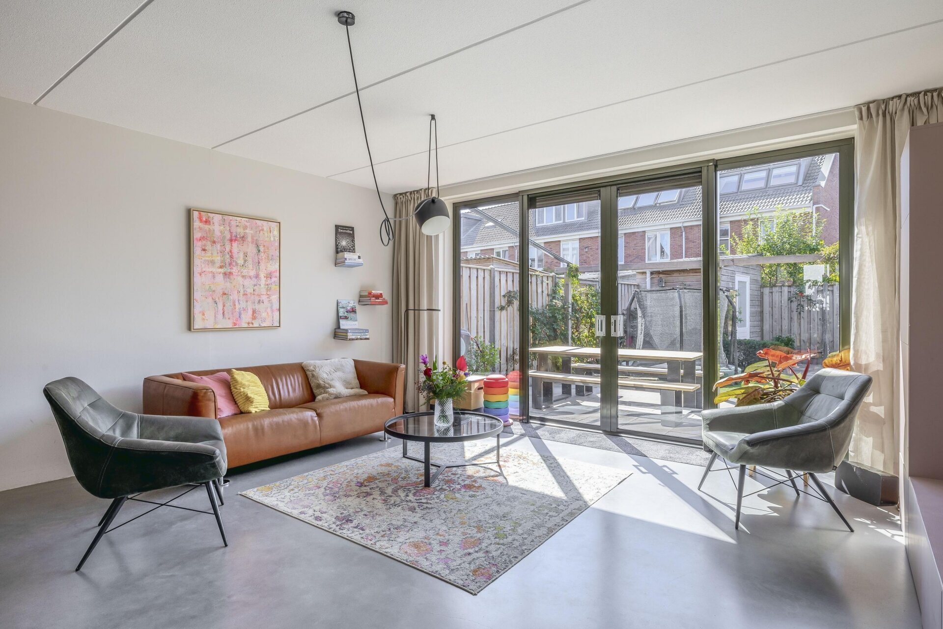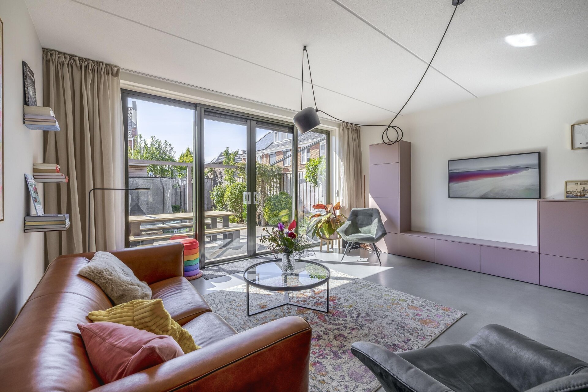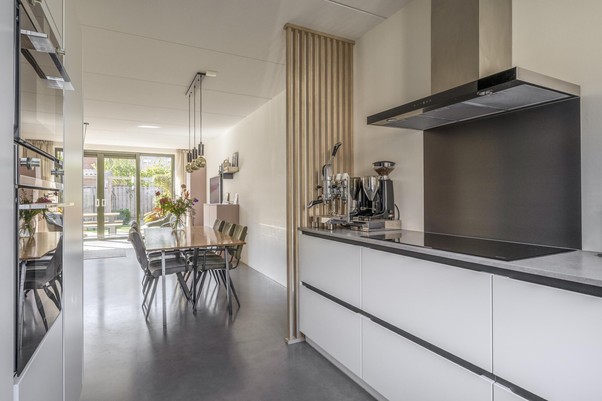 De woonkamer is tuingericht en valt direct op door de hoeveelheid licht en het strakke afwerkingsniveau. De grote schuifpui over bijna de hele achterzijde zorgt voor een prachtige verbinding tussen binnen en buiten. De vloer springt direct in het oog: een hoogwaardige woonbetonvloer van Concraft met een luxe uitstraling, naadloze afwerking en optimale duurzaamheid in combinatie met de vloerverwarming.