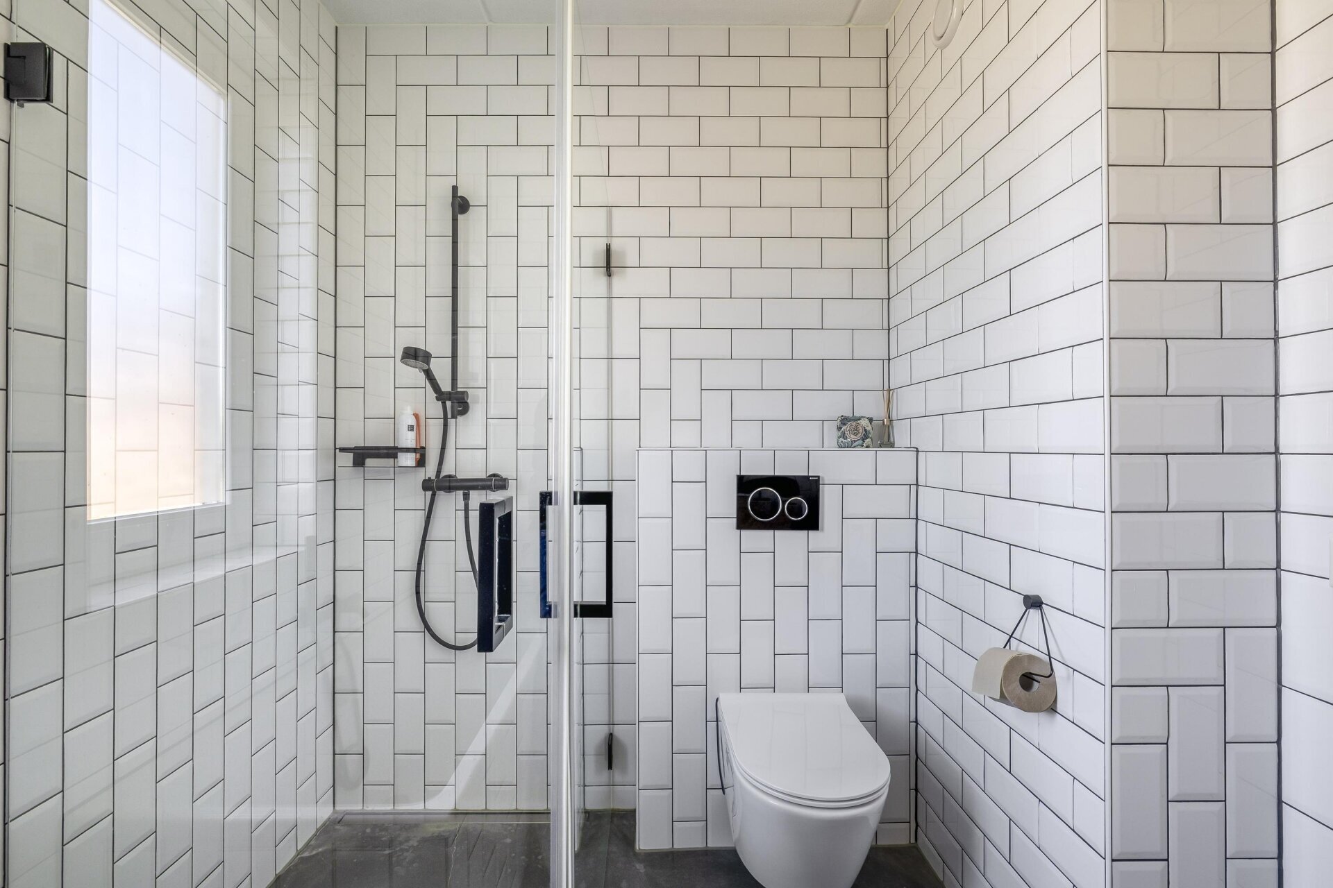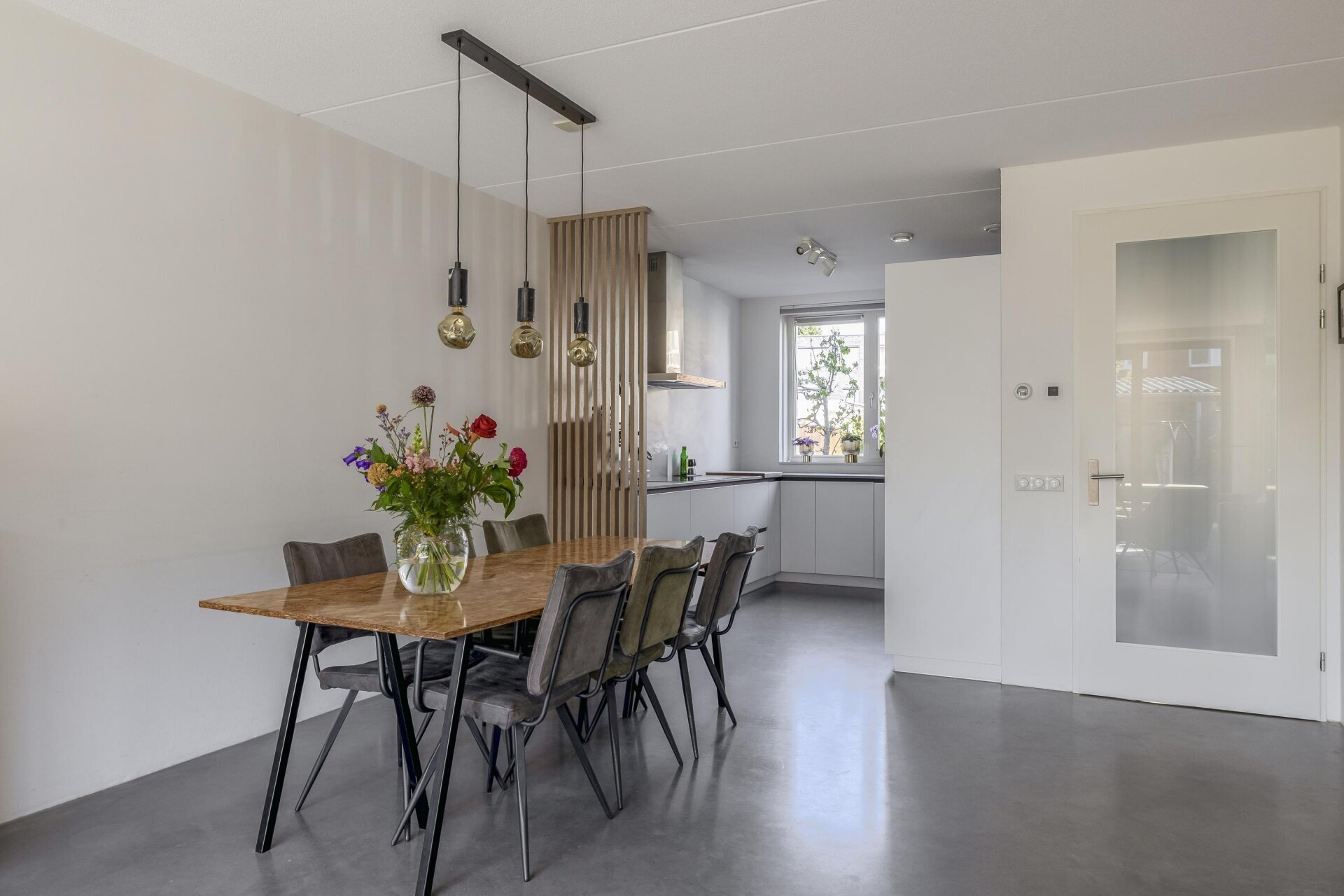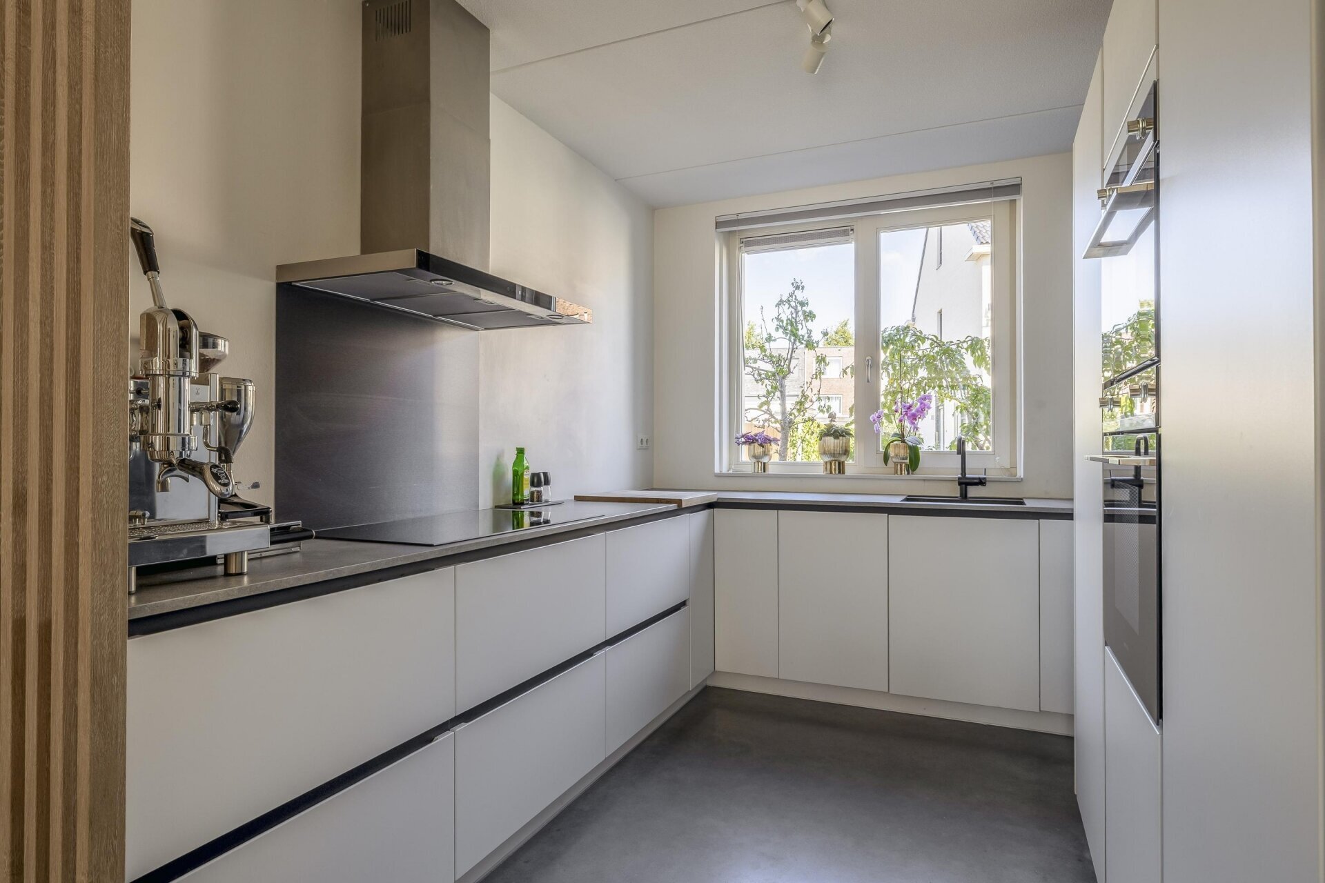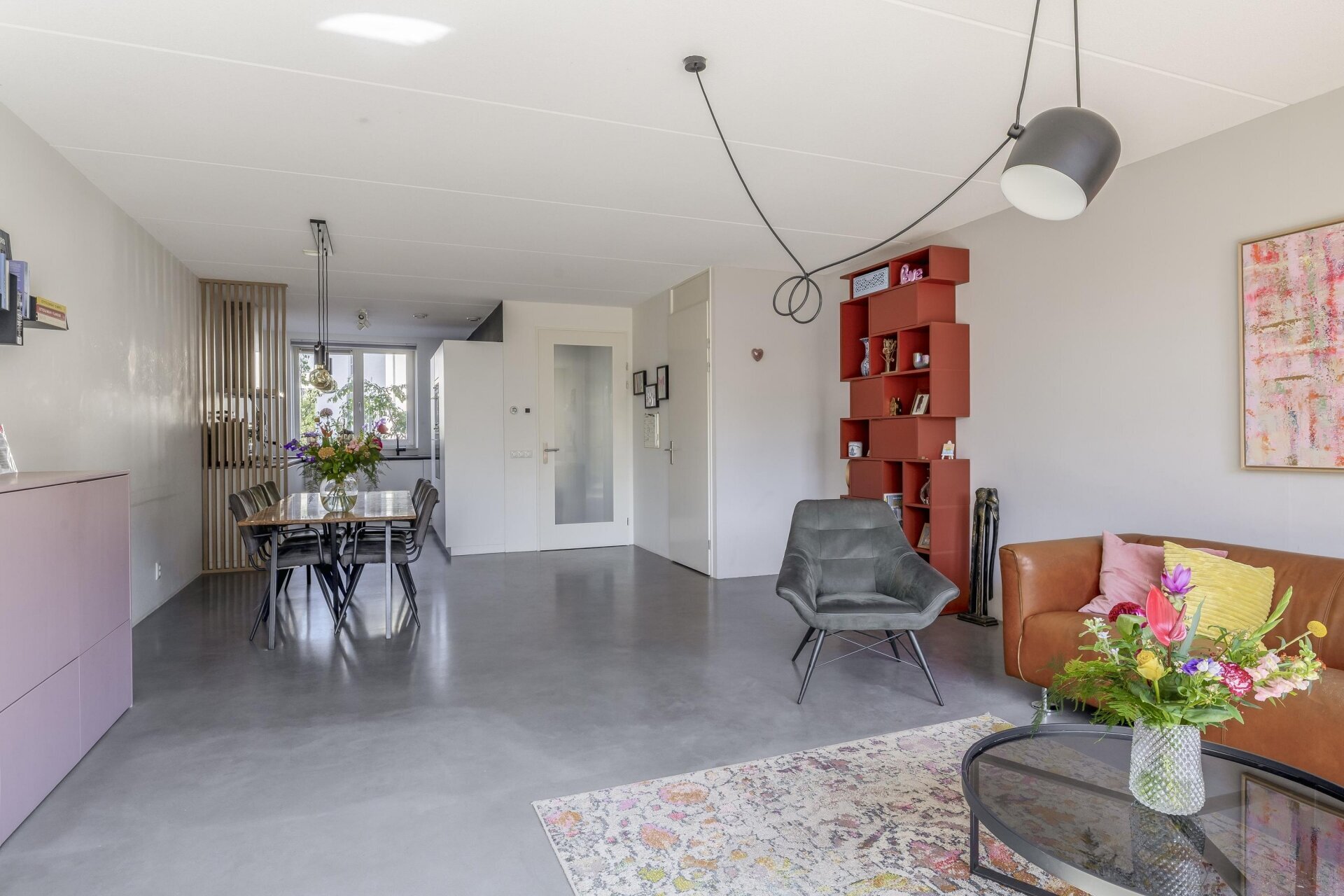 De woonkamer is tuingericht en valt direct op door de hoeveelheid licht en het strakke afwerkingsniveau. De grote schuifpui over bijna de hele achterzijde zorgt voor een prachtige verbinding tussen binnen en buiten. De vloer springt direct in het oog: een hoogwaardige woonbetonvloer van Concraft met een luxe uitstraling, naadloze afwerking en optimale duurzaamheid in combinatie met de vloerverwarming.