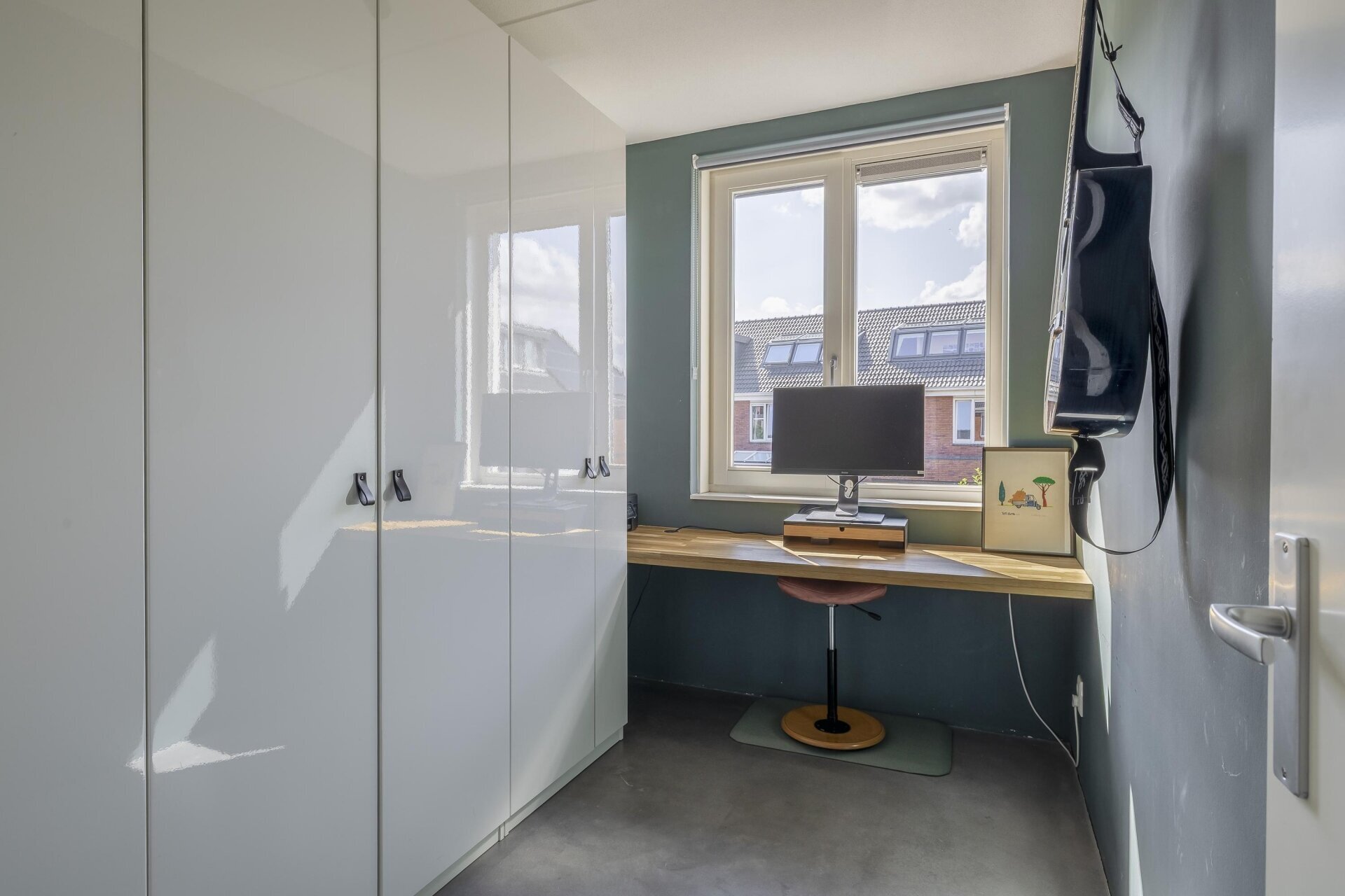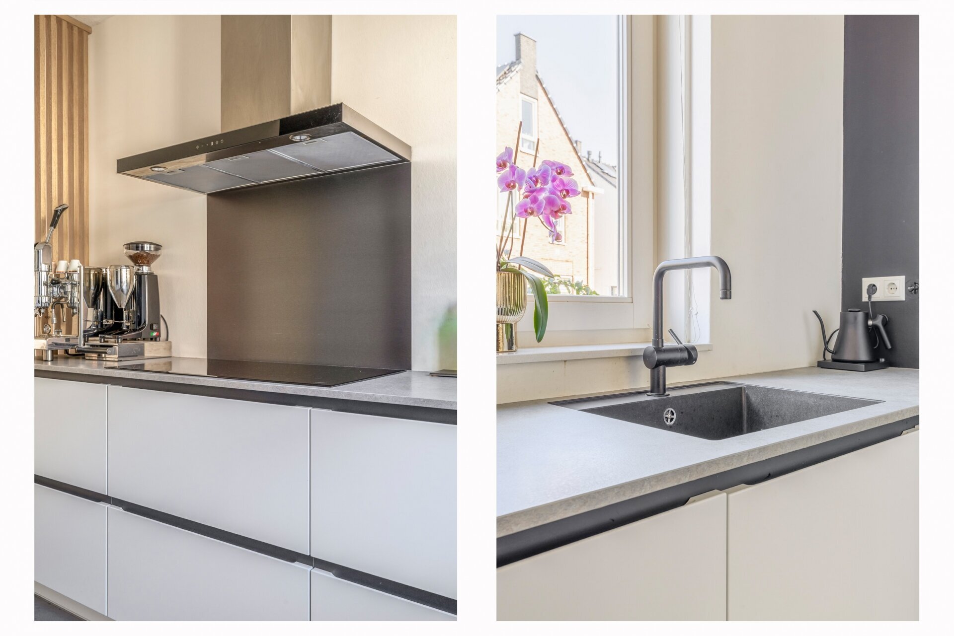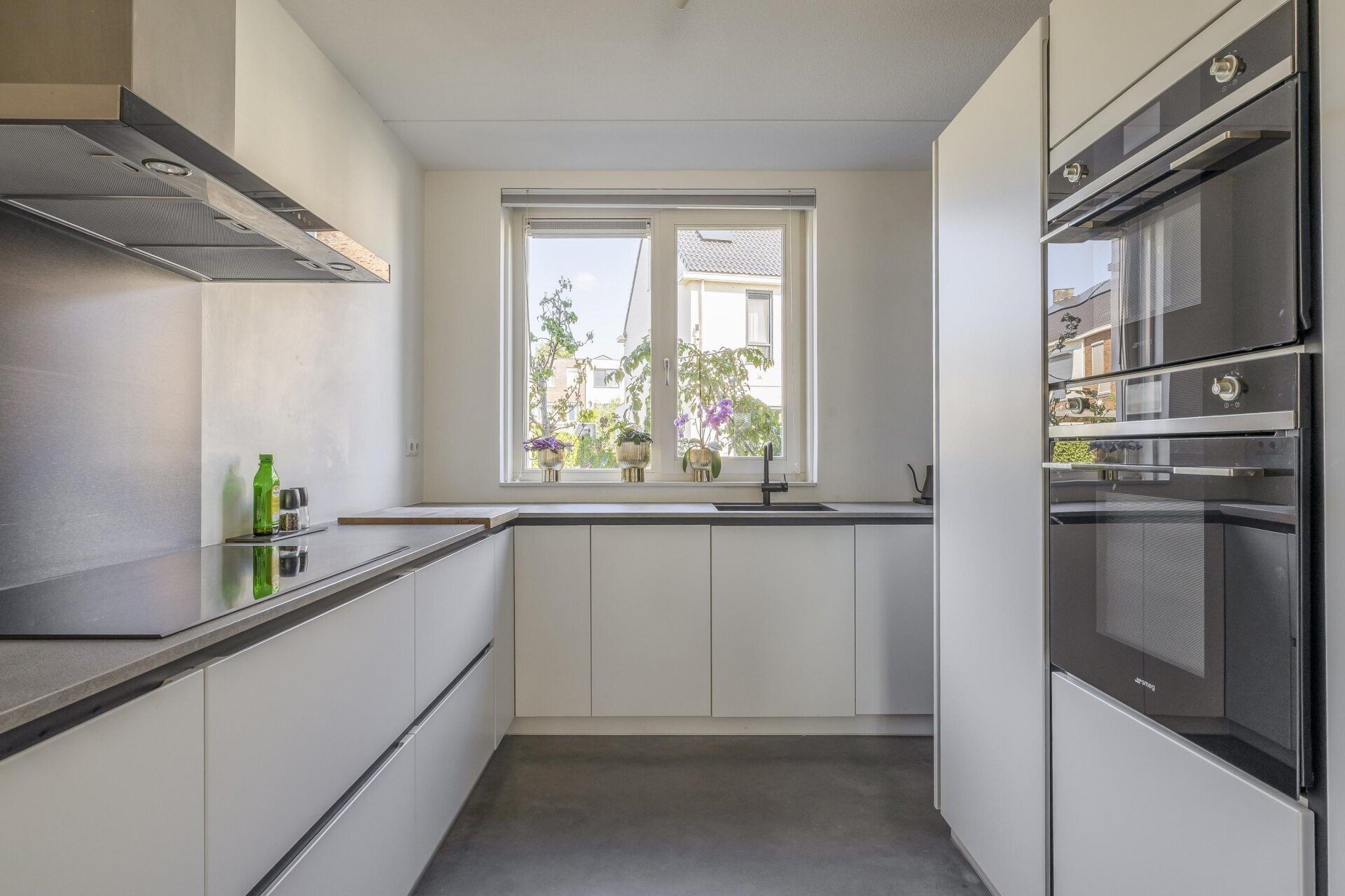 De open keuken aan de voorzijde is modern met greeploze fronten, veel bergruimte en alle benodigde inbouwapparatuur. Je kookt hier met plezier dankzij voldoende werkruimte en het uitzicht op het groen voor de woning. Alles is keurig afgewerkt en helemaal klaar voor gebruik.