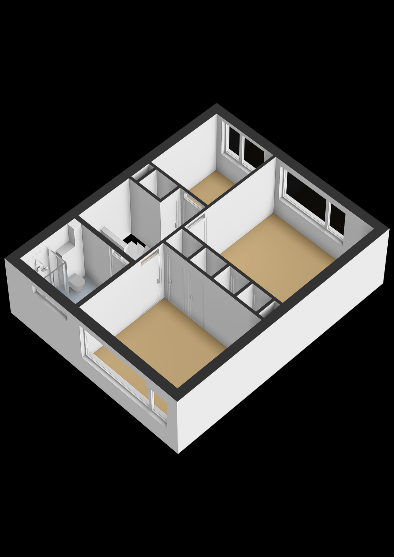 Overloop met slaapkamer 1 en slaapkamer 2 aan de achterzijde; bergkast; badkamer met douche, wastafel met meubel en een 2e toilet; 3e ruime slaapkamer aan de voorzijde van de woning. Slaapkamer 1 en 2 zijn voorzien van een vaste kast.