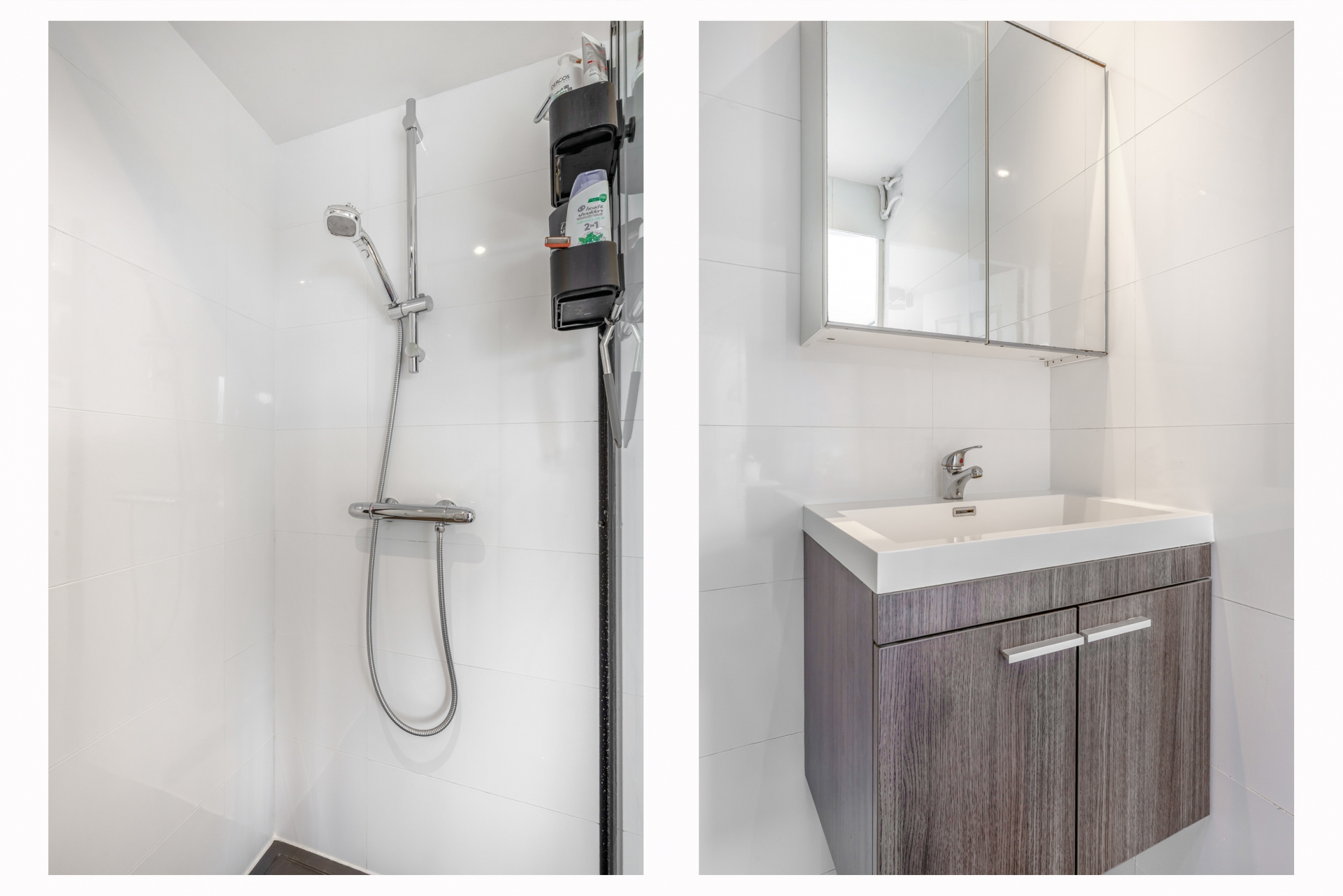Deze badkamer meet ca. 3m² en is voorzien van een wastafelmeubel en een douche cabine (vernieuwd in 2022).