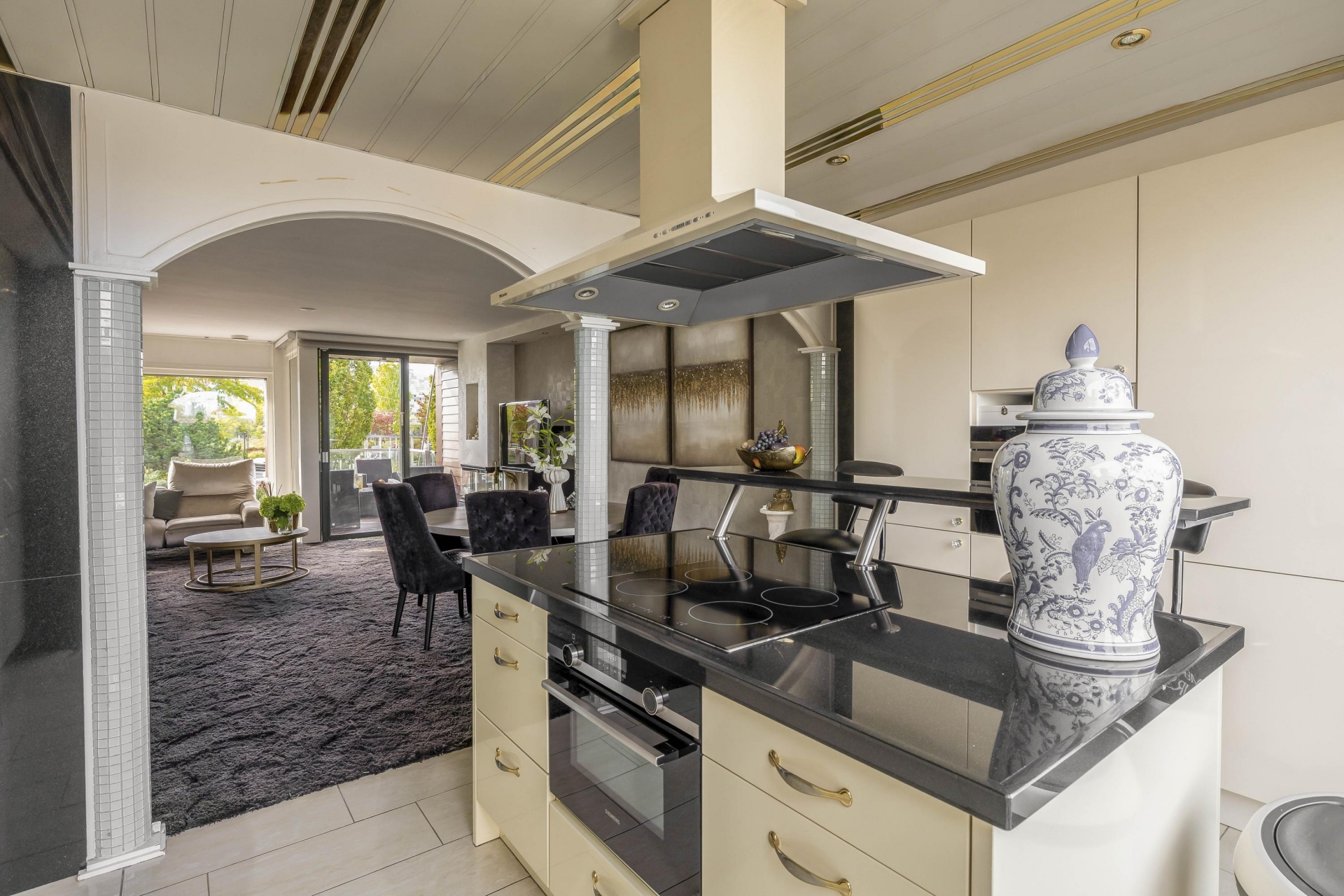 Middels een vaste trap vanuit de hal is er toegang tot de eerste verdieping. Hier bevindt zich de lichte woonkamer met open keuken. De moderne keuken is uitgerust met diverse inbouwapparatuur en een kookeiland met een sfeervol barretje. De woonkamer beschikt over een elektrische sfeerhaard en biedt toegang tot het balkon. Dit balkon is gelegen op het westen, waardoor het mogelijk is om tot laat van de zon te genieten.