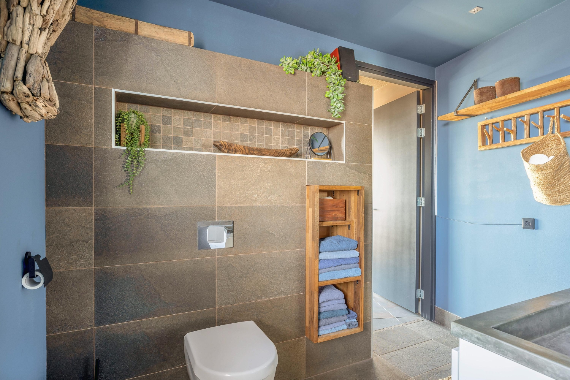 De masterbedroom heeft een inloopkast en luxe badkamer en-suite (met grote inloopdouche, badkamermeubel met hardstenen wastafel, 2e toilet en fraaie tegels).