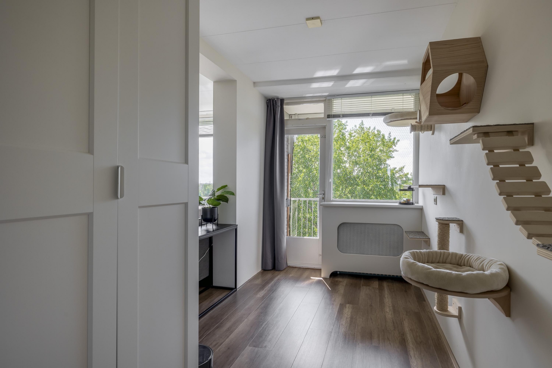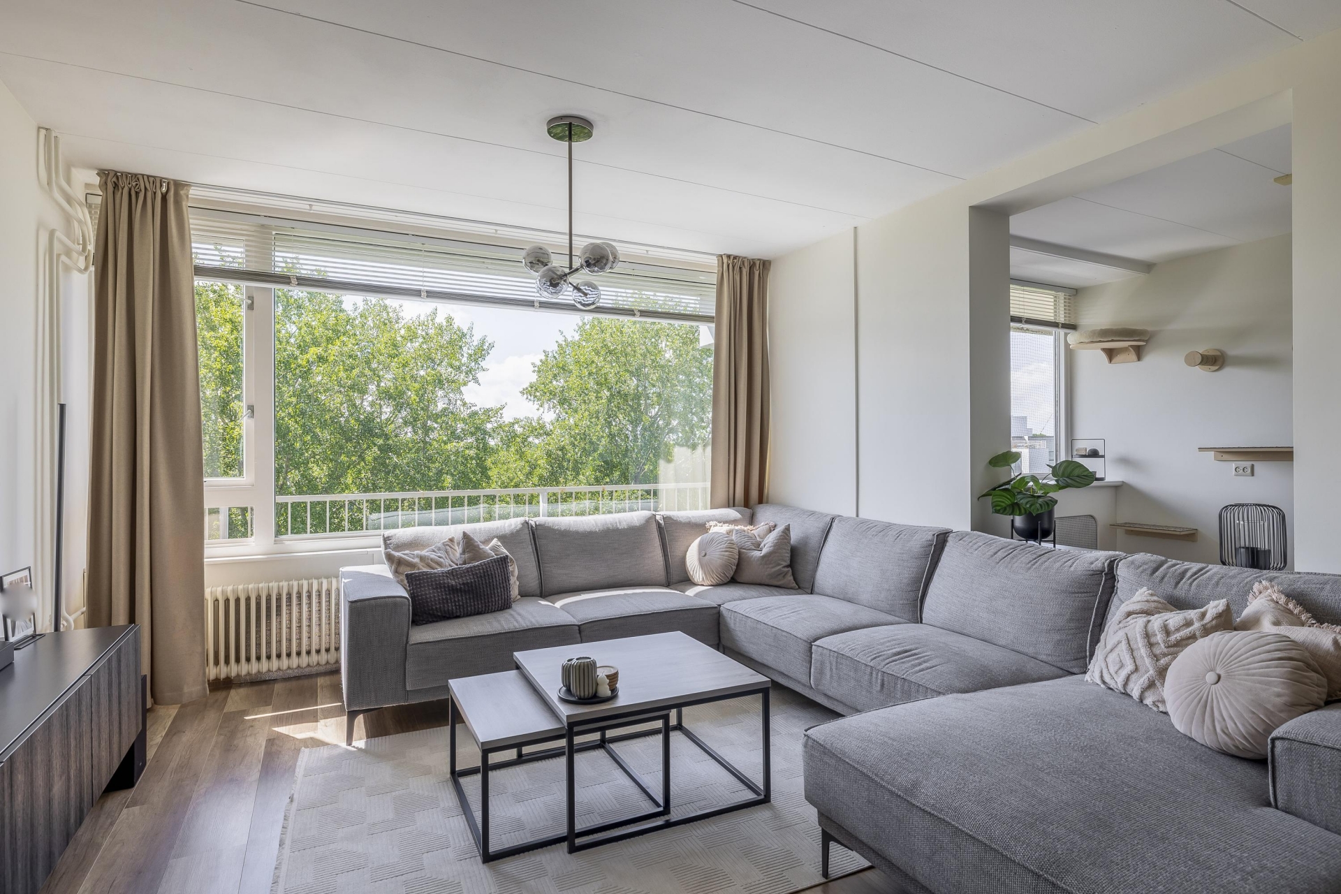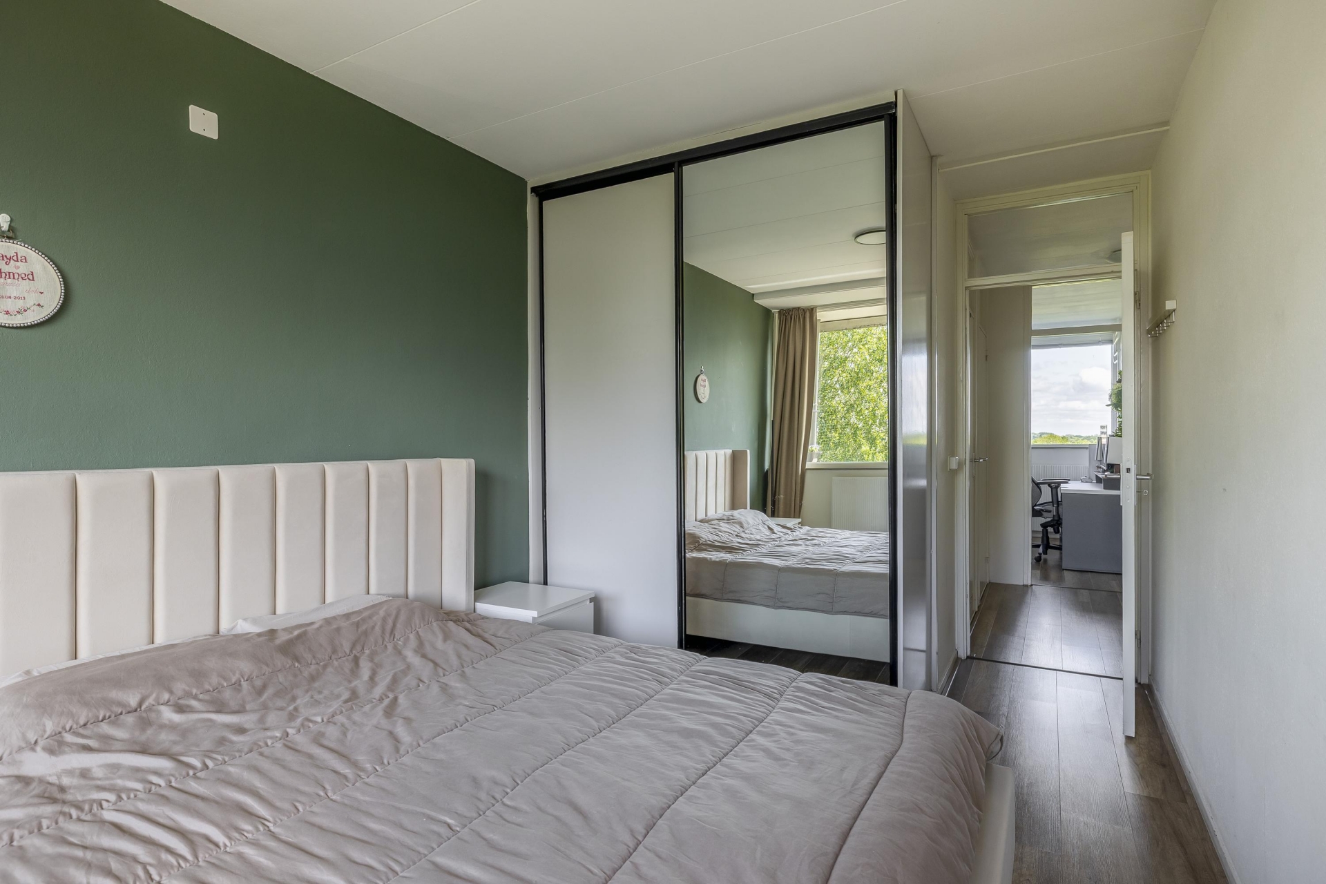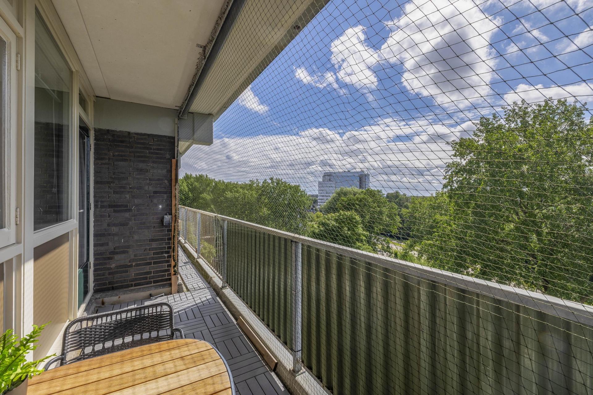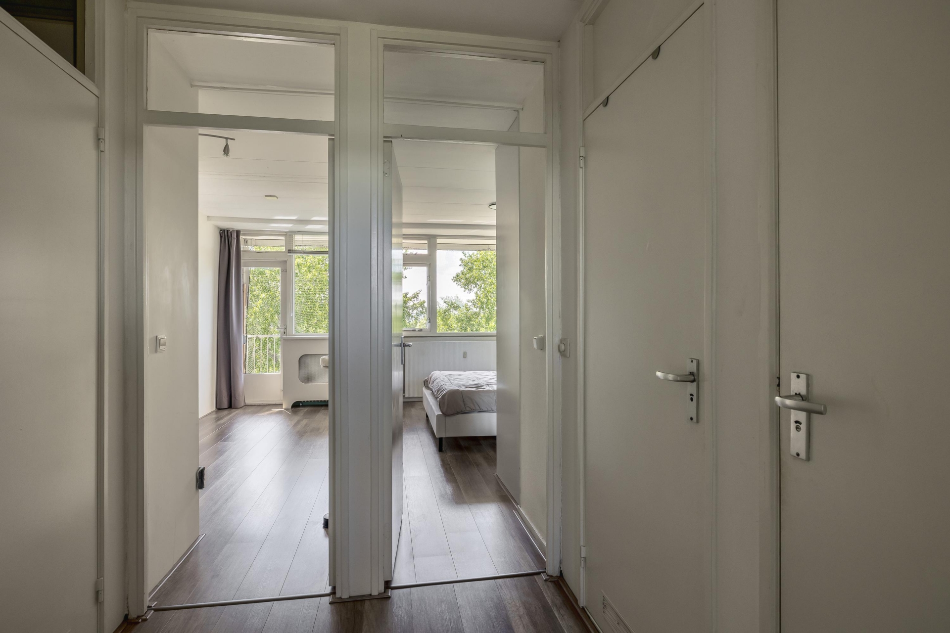 De woonkamer is heerlijk licht dankzij het grote raam en de doorloop naar de naastgelegen vierde (slaap)kamer. Deze is voorzien van een deur naar het balkon. De neutrale afwerking en nette vloer maken het makkelijk om je eigen stijl hier door te voeren. Het balkon ligt op het westen: dat betekent zon in de middag en avond, ideaal voor een ontspannen borrelmoment aan het einde van de dag, met uitzicht op de groene omgeving.