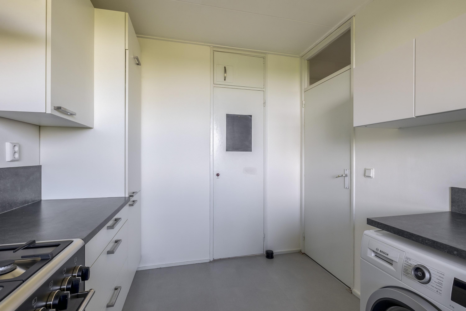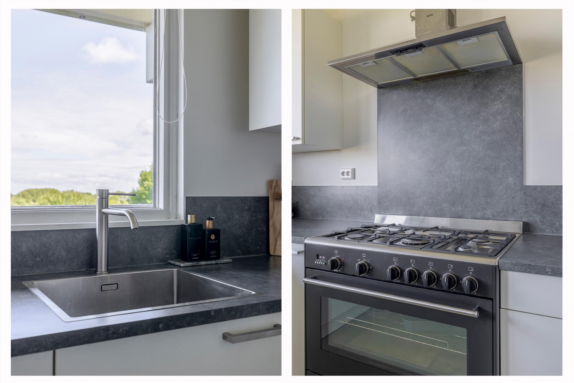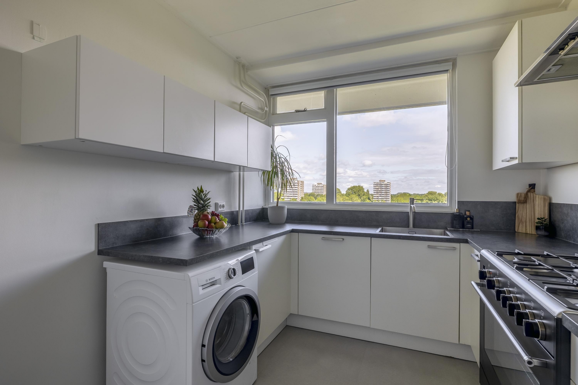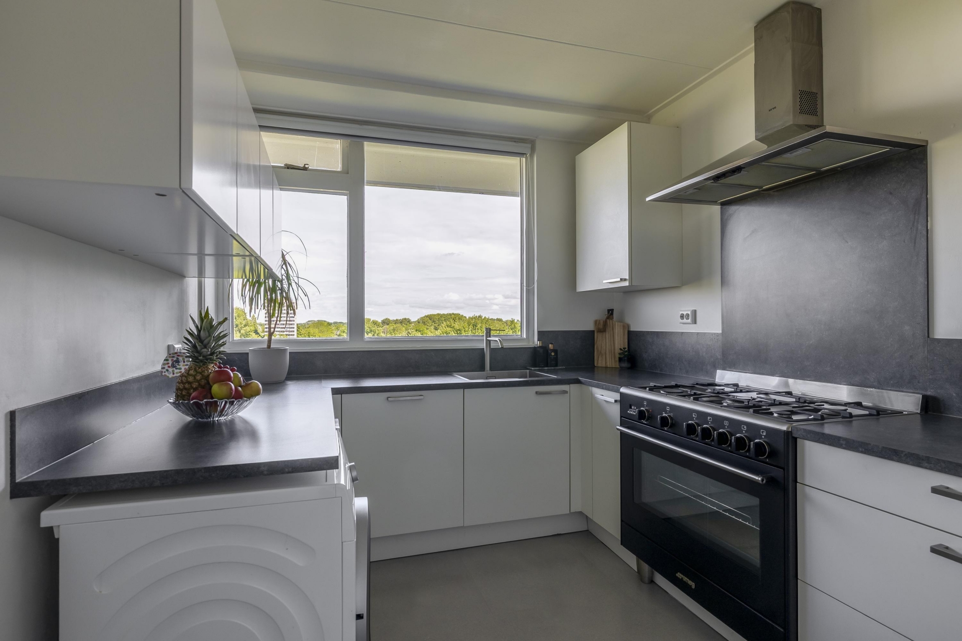 De keuken is strak en tijdloos ingericht, met veel werkruimte, witte kastfronten en een donker werkblad voor een mooi contrast. De vrijstaande oven met vijfpits gasfornuis en rvs afzuigkap springen direct in het oog. Vanuit het keukenraam kijk je vrij weg. Dankzij de slimme opstelling is er meer dan genoeg kastruimte én ruimte voor een wasmachine of wasdroger.
