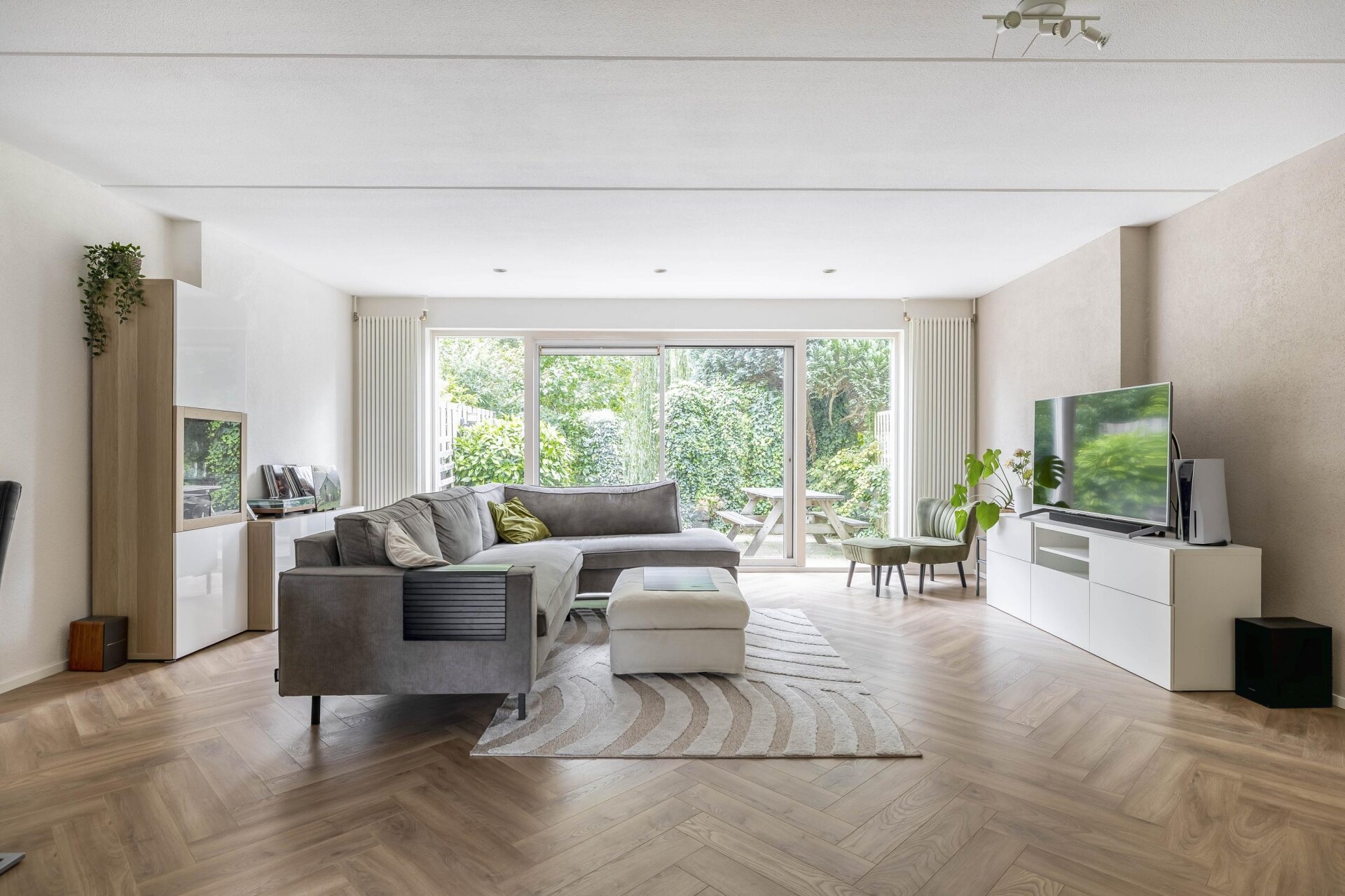 De living is opgedeeld in een ruime, uitgebouwde woonkamer (40m²) met schuifpui naar de achtertuin en een keuken (8m²).