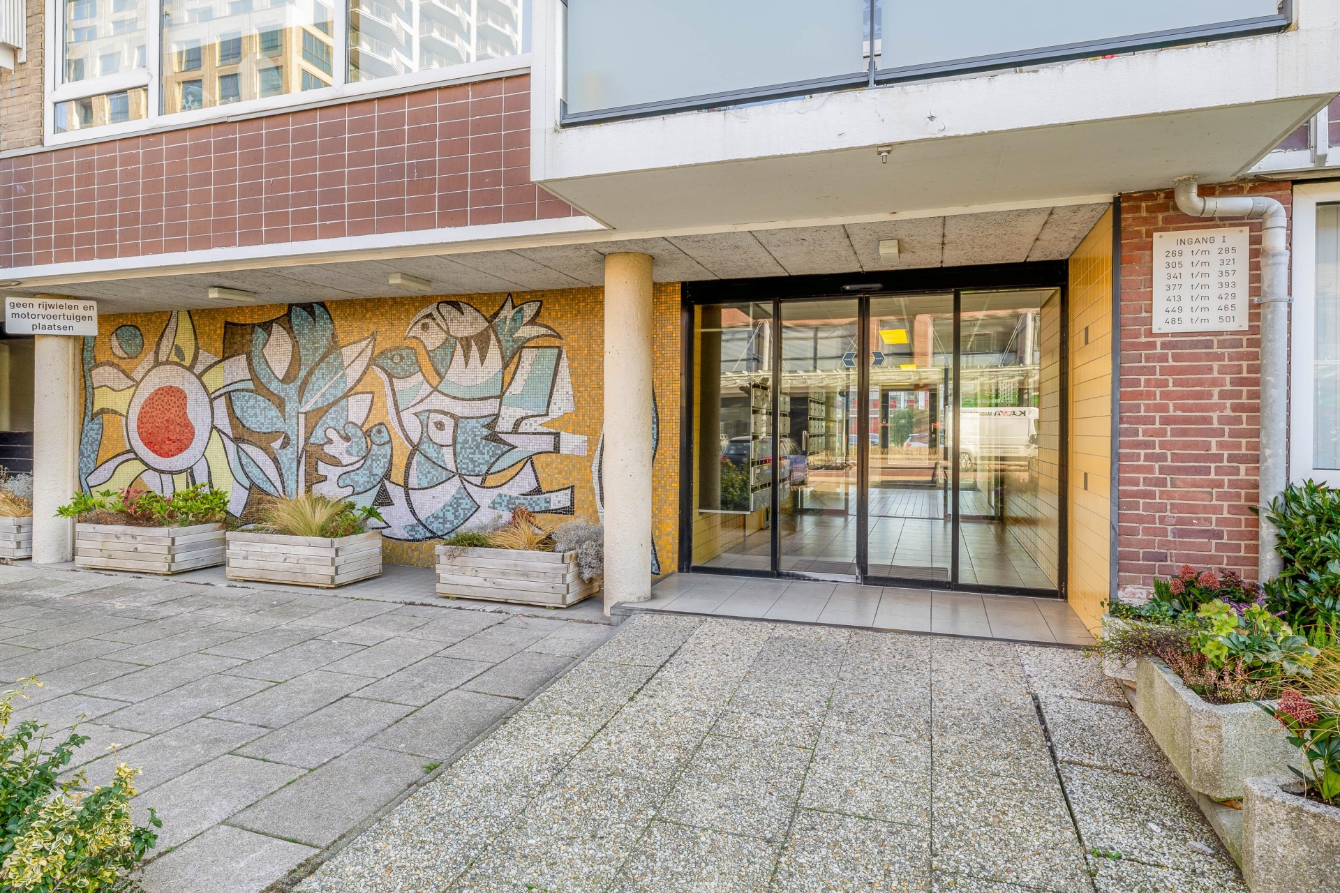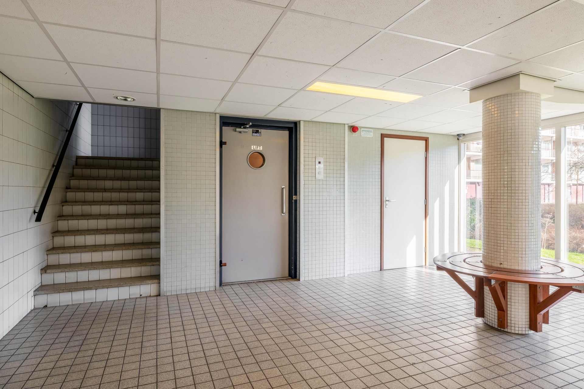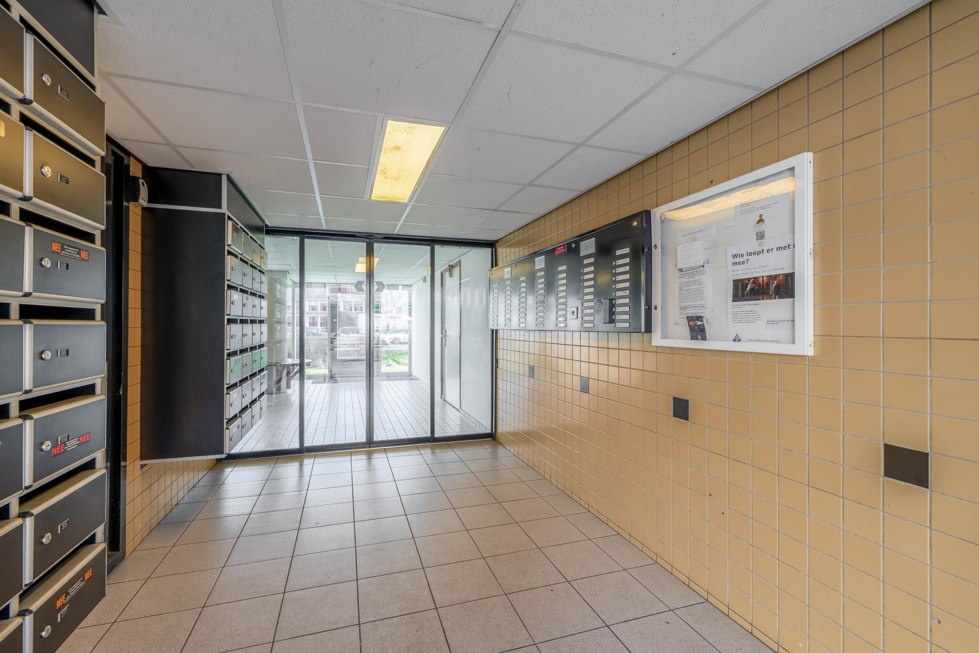 Centrale entree met brievenbussen en toegang tot de bergingen. Vanuit de hal bereikt u het trappenhuis en de liftinstallatie die toegang biedt tot de woonverdiepingen.