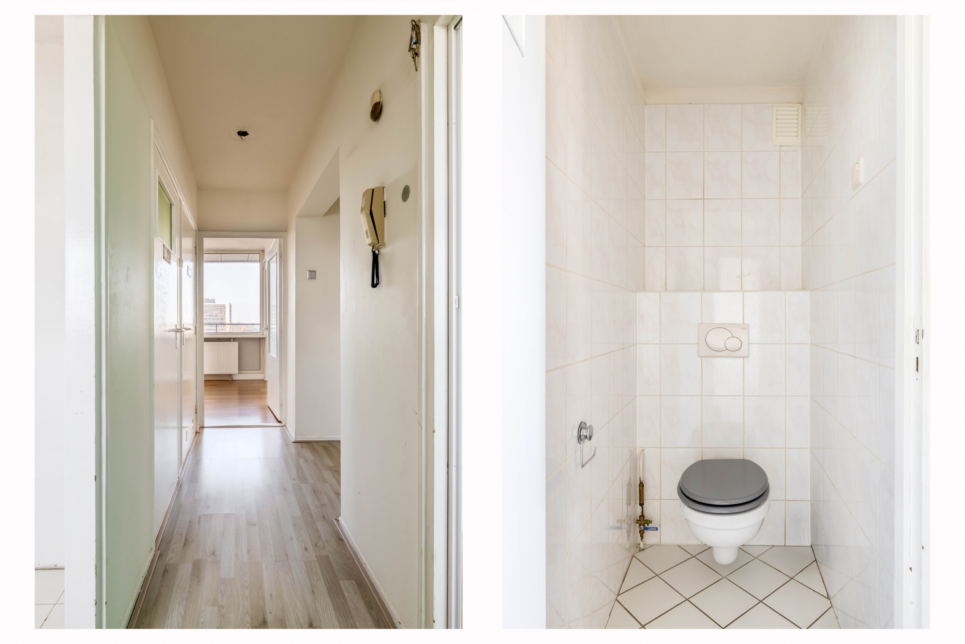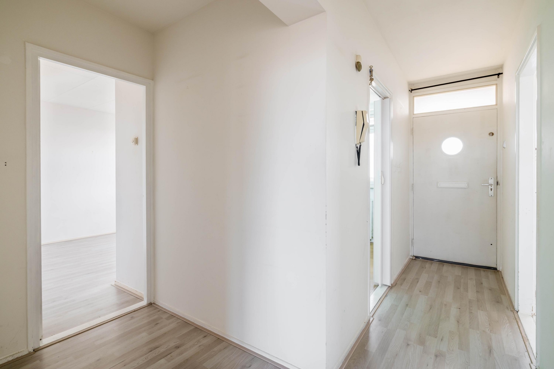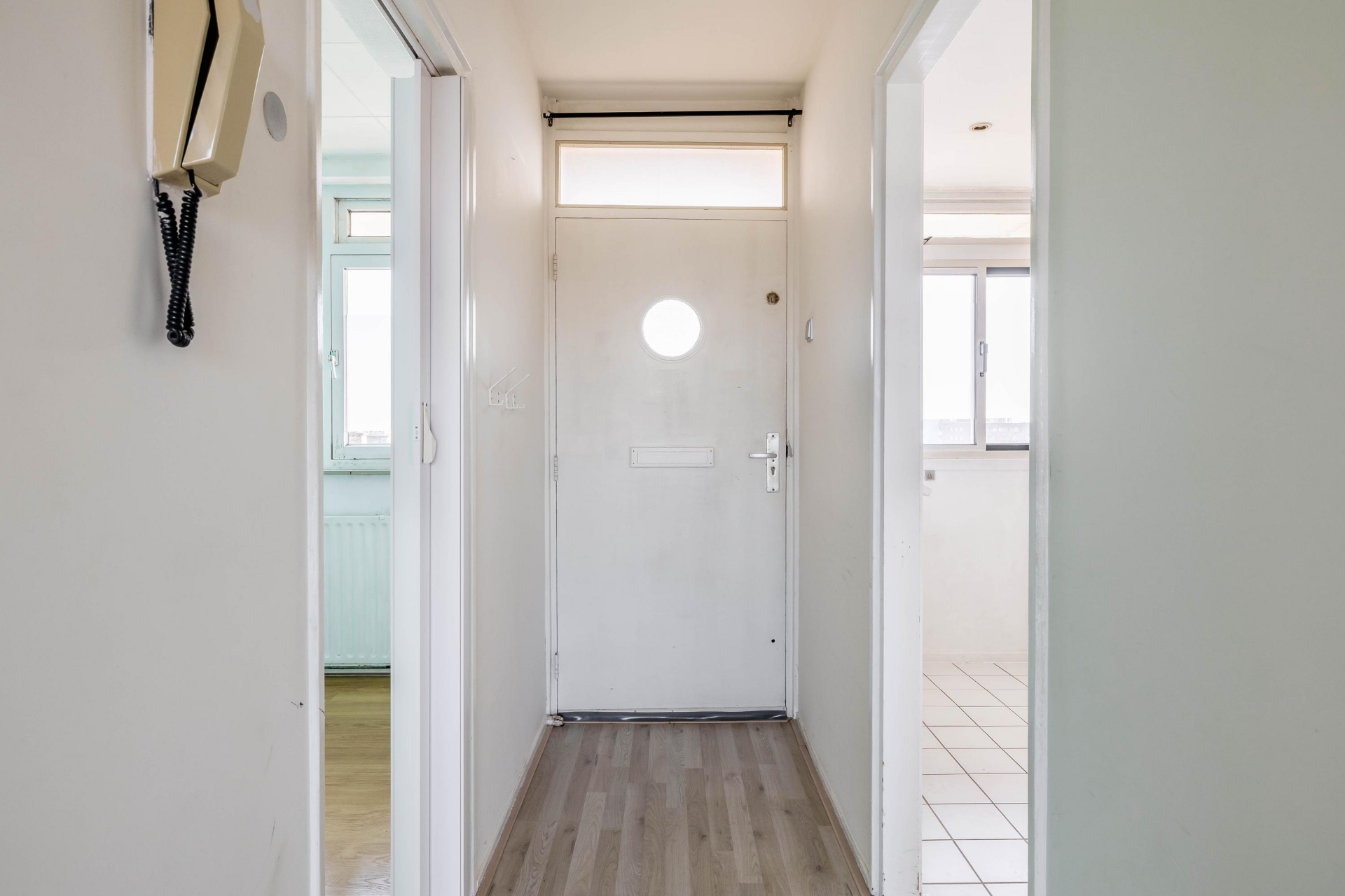 Bij aankomst op de zevende verdieping bereikt u de entree van het appartement. De hal vormt het centrale punt van de woning en biedt toegang tot vrijwel alle vertrekken.