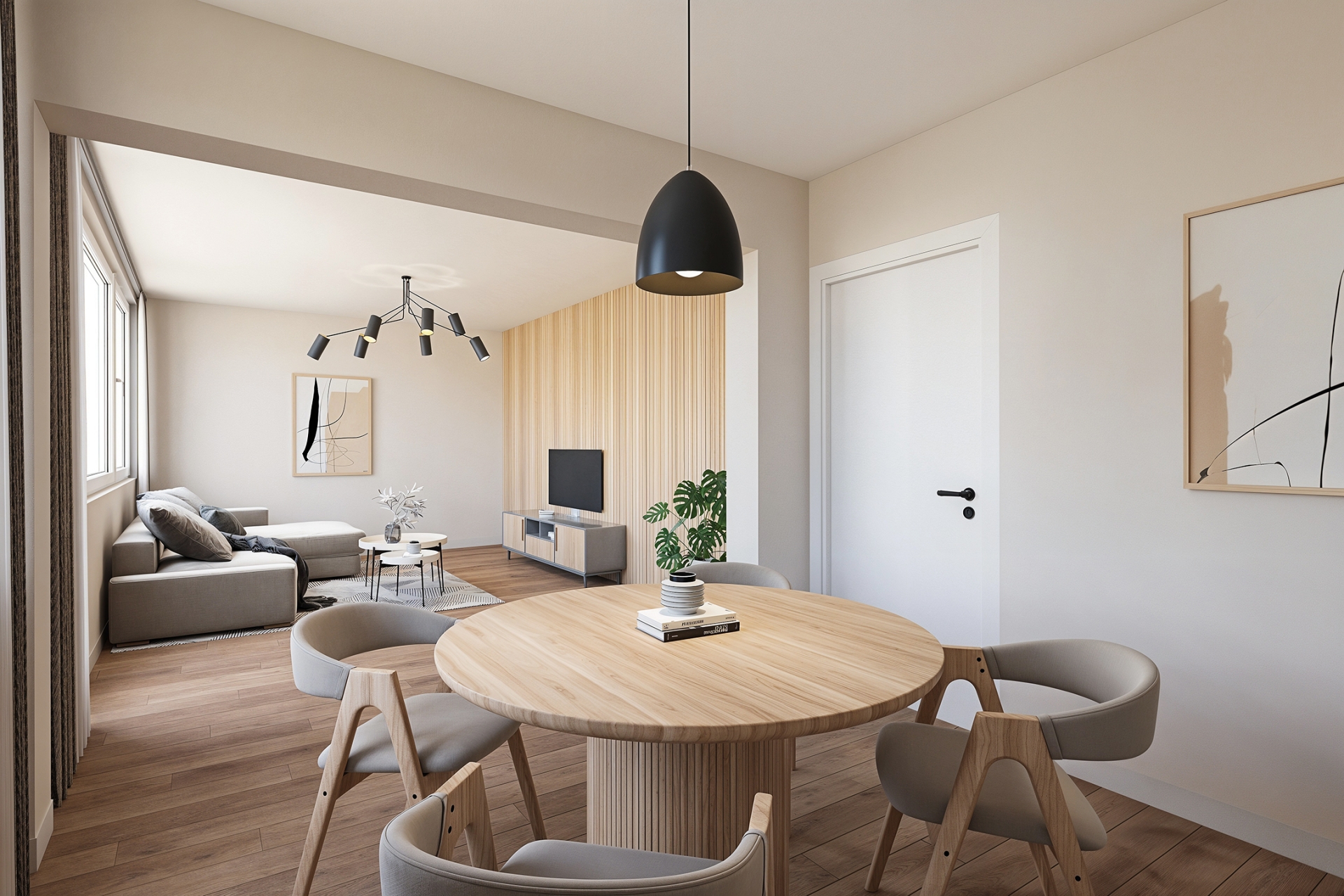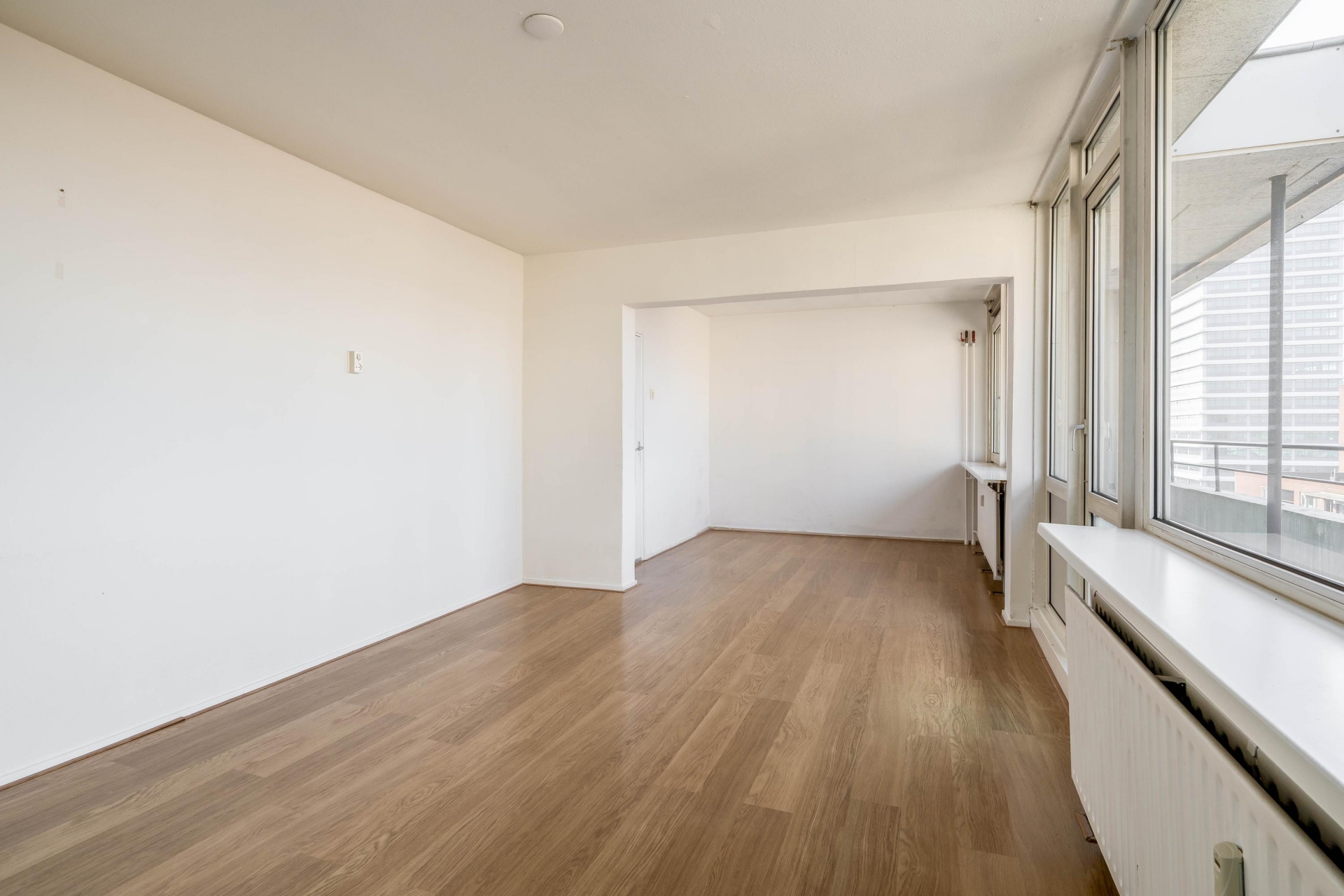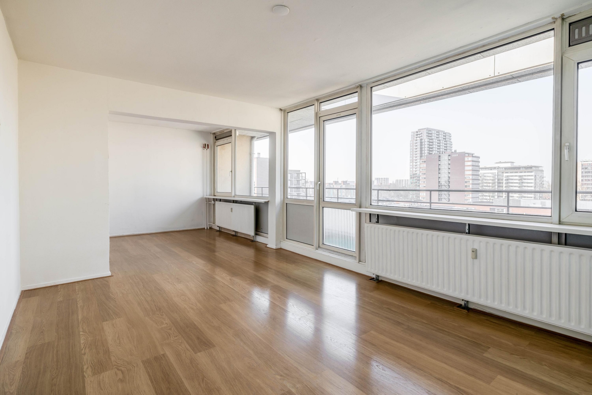 De woonkamer is licht en ruim en biedt toegang tot het balkon, waar u kunt genieten van een vrij en weids uitzicht over de omgeving.