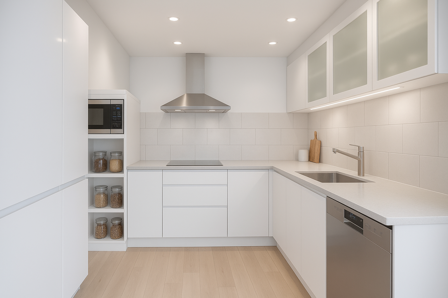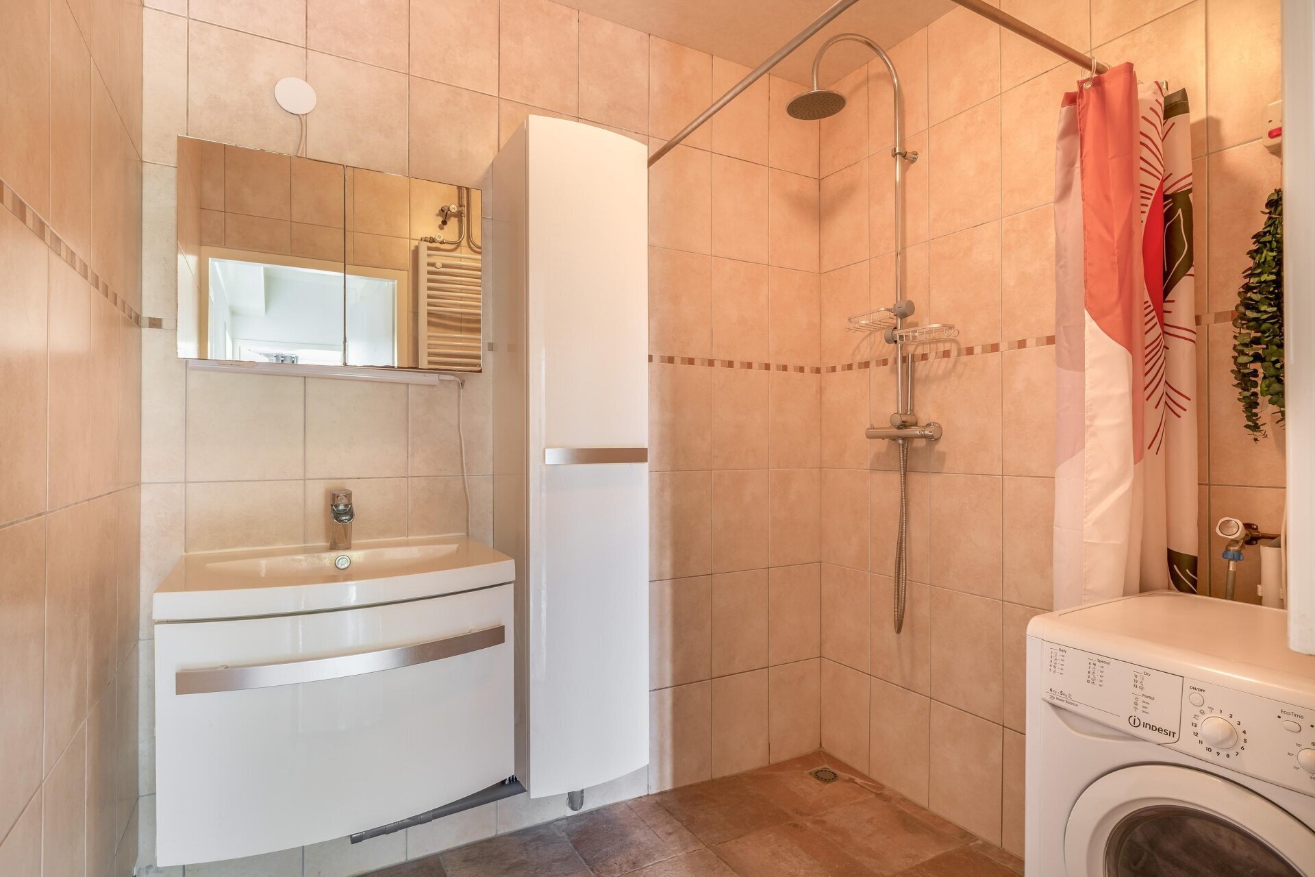 De keuken is praktisch en netjes afgewerkt, met voldoende kastruimte, ingebouwde apparatuur en een stijlvolle uitstraling dankzij de combinatie van lichte fronten en een donker werkblad. De vloer loopt mooi door vanuit de woonkamer en geeft een gevoel van eenheid aan het geheel.