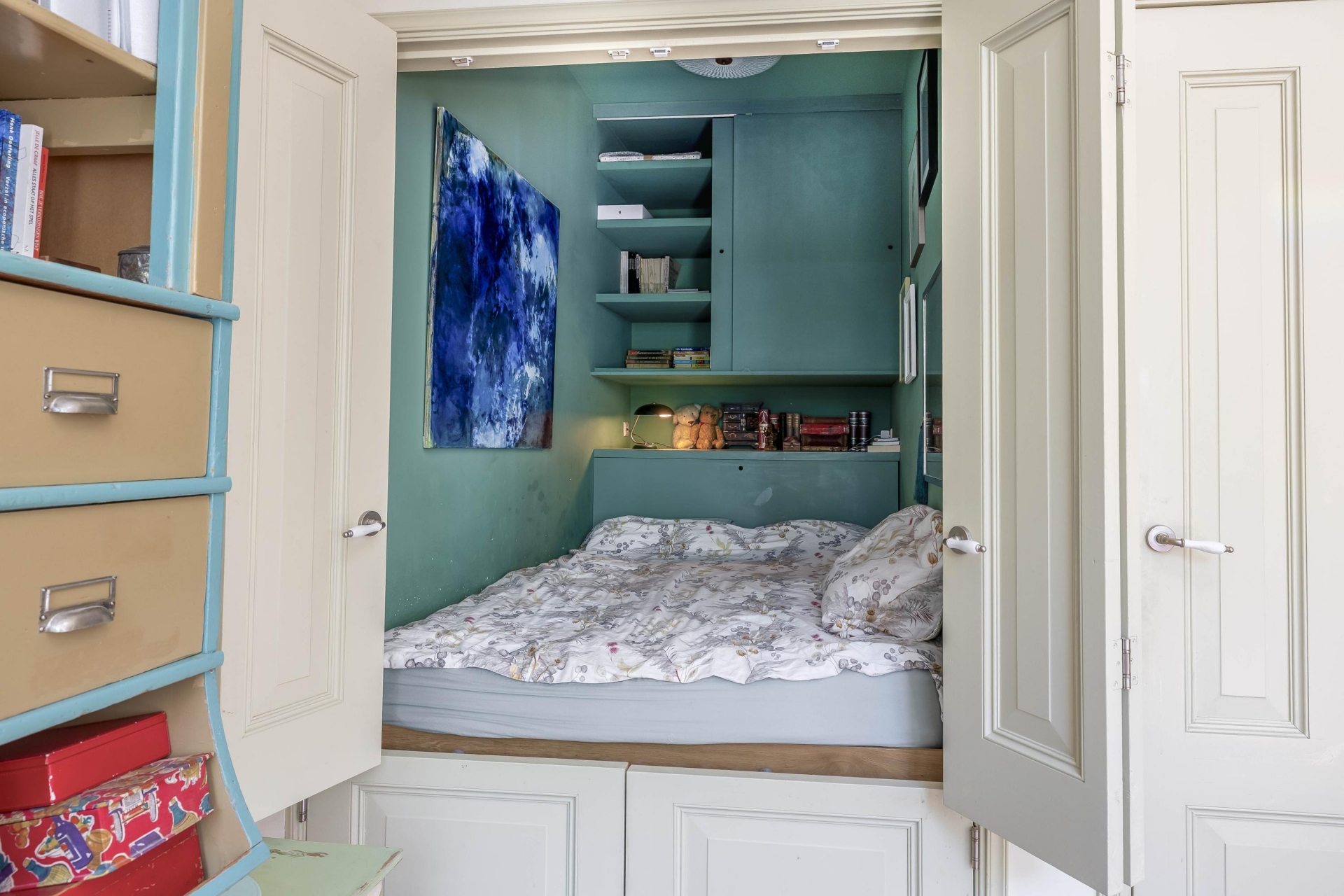 Op de eerste verdieping begint het woongedeelte, afgewerkt met een warme teakhouten vloer die direct sfeer brengt. Hier vind je een royale woonkamer met veel lichtinval, een fijne slaapkamer én een complete badkamer met ligbad. Op de tweede verdieping zet de sfeer zich door met een eiken houten vloer, een tweede badkamer én een speelse bedstee die deze verdieping echt bijzonder maakt, perfect als logeerplek of knusse slaapruimte voor een kind. De slimme verdeling van de kamers maakt het eenvoudig om de ruimtes aan te passen aan je levensfase of woonwensen. Werk je veel thuis? Dan is er ruimte genoeg voor een inspirerende werkplek. Heb je juist behoefte aan een extra slaapkamer of hobbyruimte? Ook dat is zo geregeld.