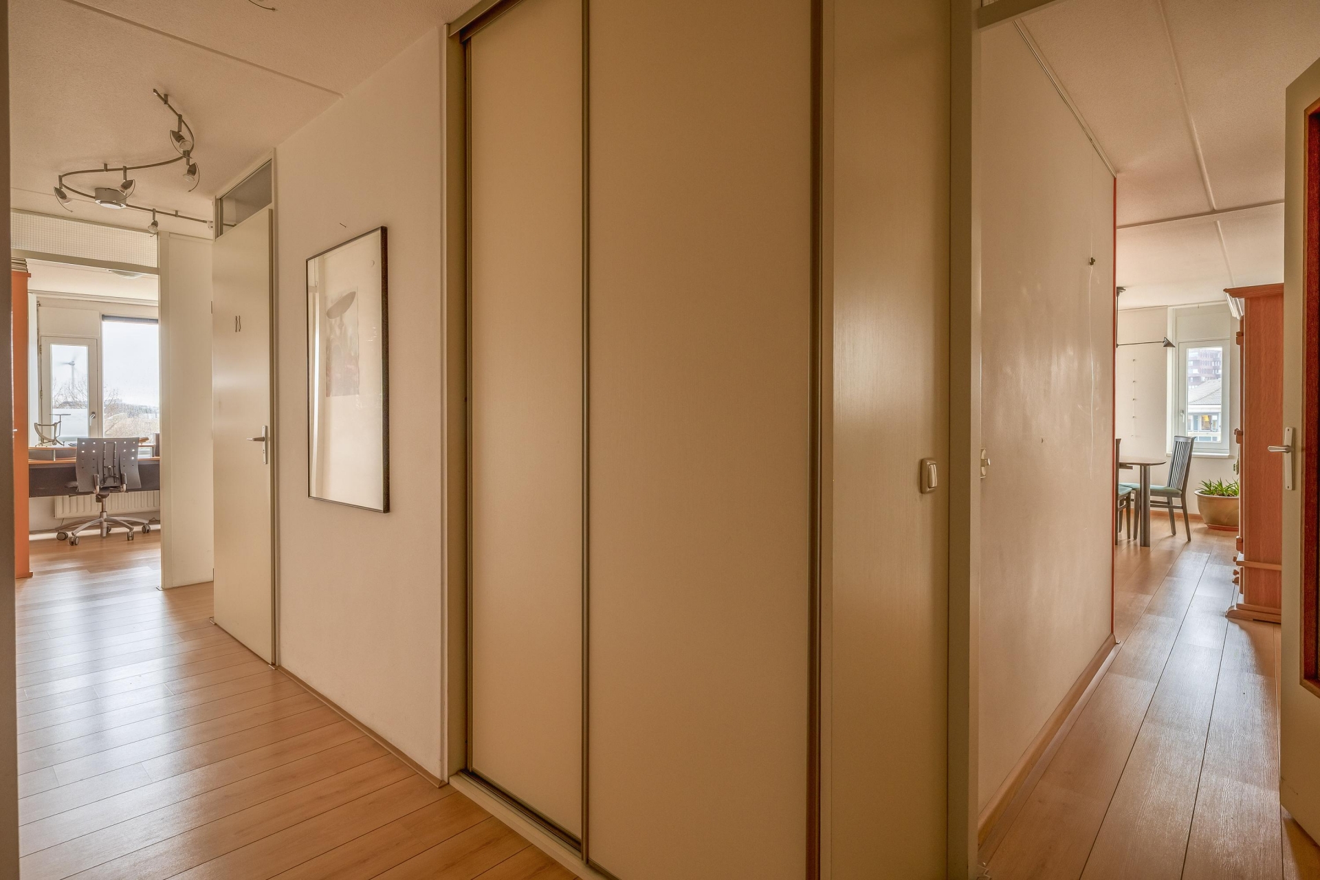 Bij binnenkomst van het appartement treft u een ruime hal met toegang tot diverse vertrekken. Aan het einde van de hal komt u uit in de ruime woonkamer met halfopen keuken. De keuken beschikt over alle benodigde inbouwapparatuur. De woonkamer heeft een oppervlakte van circa 30 m² en is voorzien van veel raampartijen voor de nodige daglichttoetreding. Middels een grote schuifpui is er toegang tot het balkon, welke is gelegen op het zonnige zuidwesten. Het uitzicht hiervan is de ware eyecatcher van het appartement. Gegarandeerd dat dit vrije uitzicht nooit zal vervelen. Liever een plekje in de schaduw? Dat kan met behulp van het aanwezige zonnescherm.