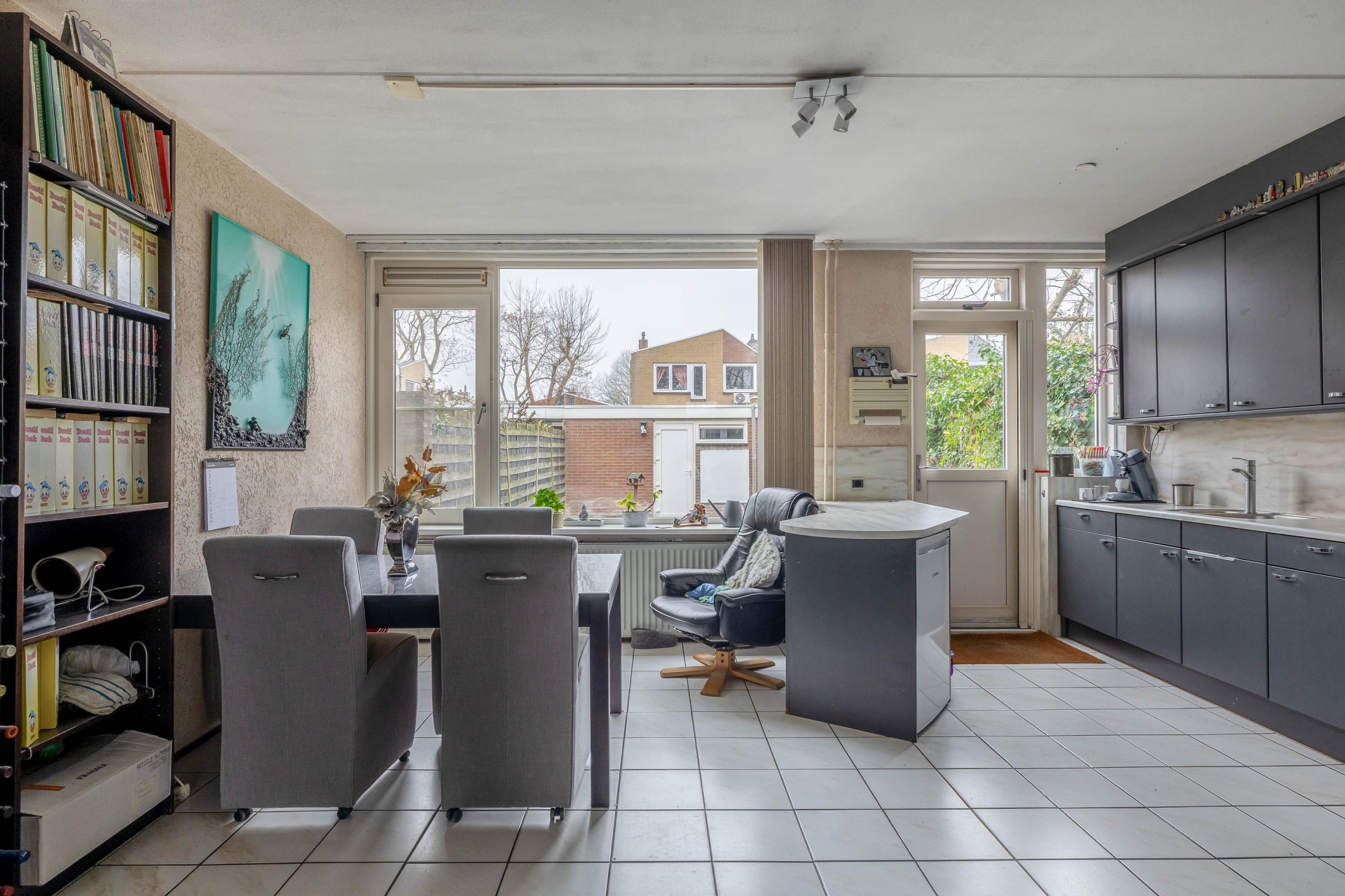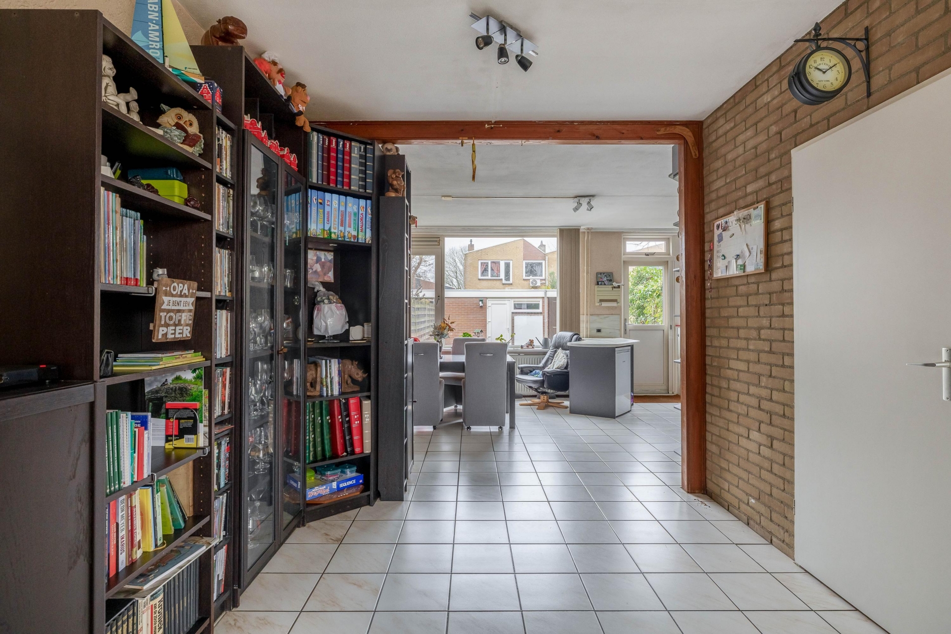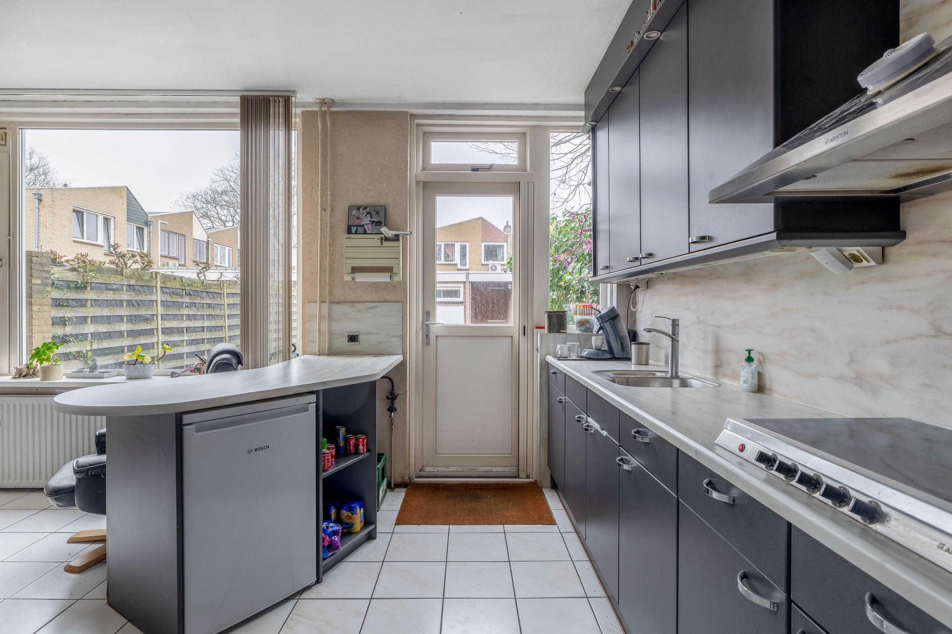 Zodra je binnenkomt, valt de lengte en openheid van de begane grond direct op. De woonkamer en eetkamer lopen mooi in elkaar over, met grote raampartijen aan zowel de voor- als achterzijde. De tegelvloer draagt bij aan een onderhoudsvriendelijke uitstraling, en dankzij de doorzonindeling valt het daglicht royaal naar binnen. De eethoek aan de tuinzijde sluit naadloos aan op de open keuken, wat zorgt voor een gezellige leefruimte waarin je makkelijk contact houdt met elkaar of je nu zit te eten, koken of ontspannen.