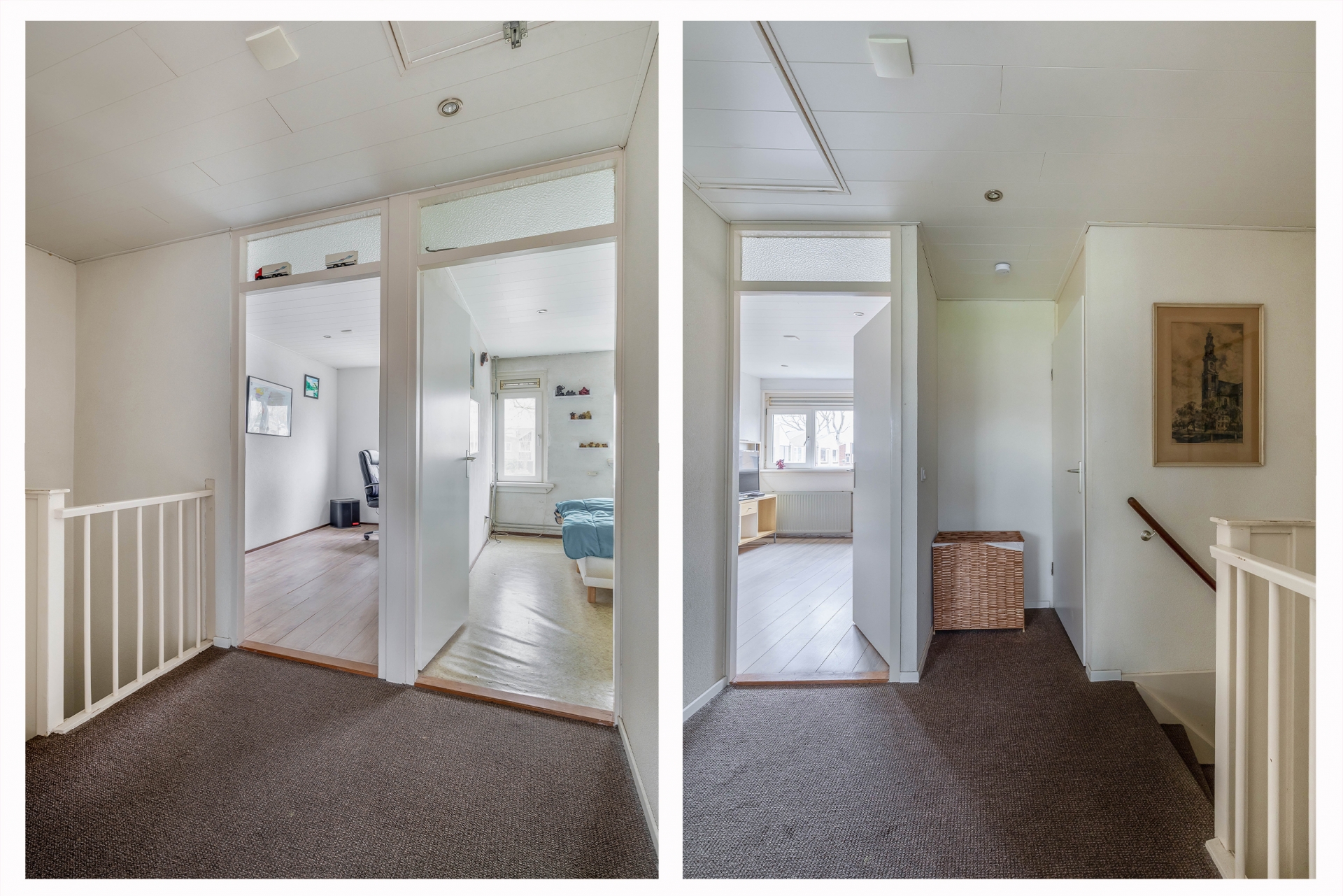 Op de eerste verdieping zijn drie slaapkamers aanwezig, verdeeld over de voor- en achterzijde van het huis. De grootste kamer ligt aan de achterzijde en biedt volop ruimte voor een tweepersoonsbed en een grote kledingkast. Oorspronkelijk waren dit twee aparte kamers; deze zijn samengevoegd tot één royale hoofdslaapkamer, maar kunnen indien gewenst eenvoudig weer worden gesplitst om een extra slaapkamer te creëren. De overige twee kamers zijn ideaal als kinderkamer, werkkamer of logeerkamer. De badkamer is slim ingericht met een douchecabine, wastafelmeubel, toilet én de opstelling voor wasmachine en droger. Alles praktisch bij elkaar.