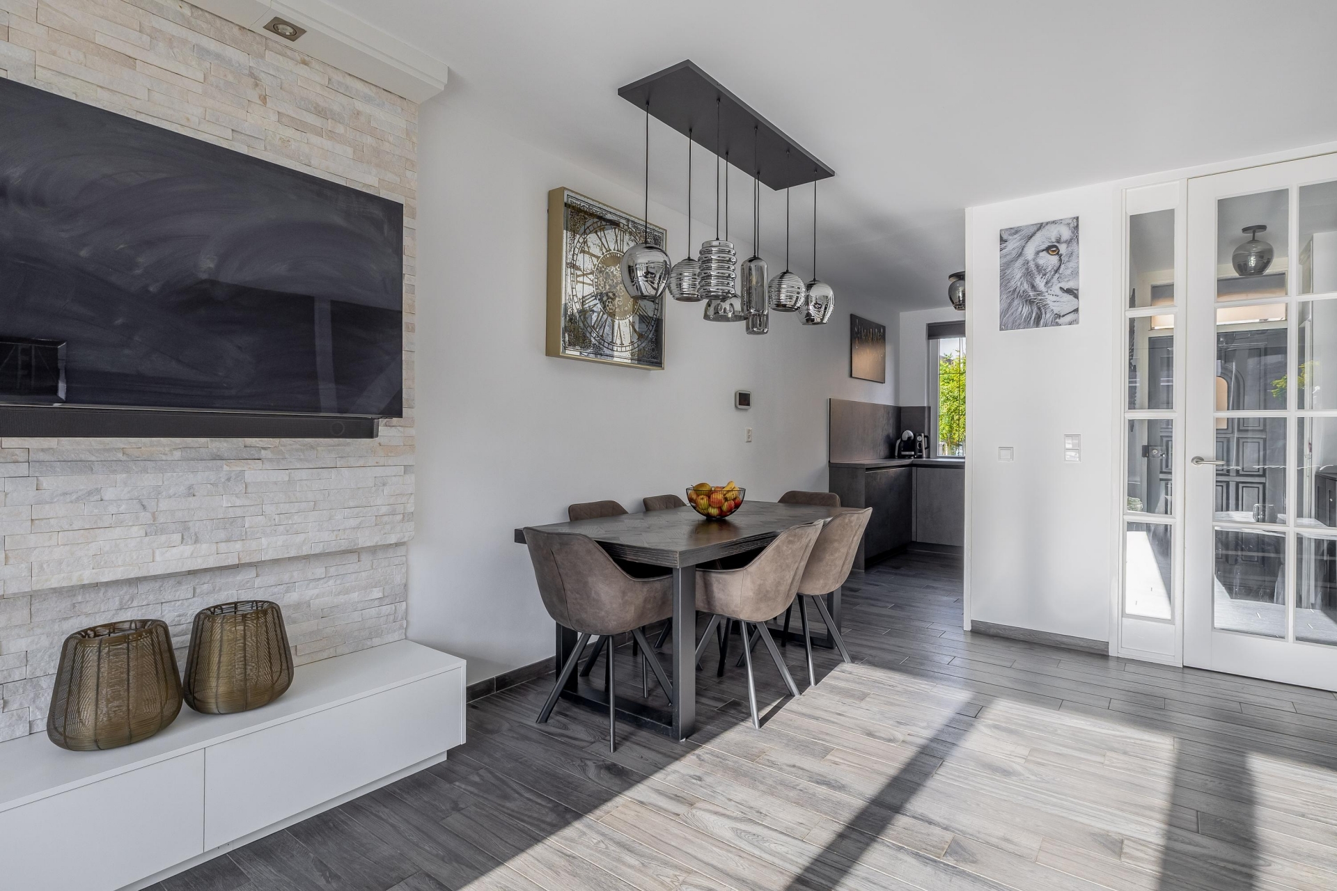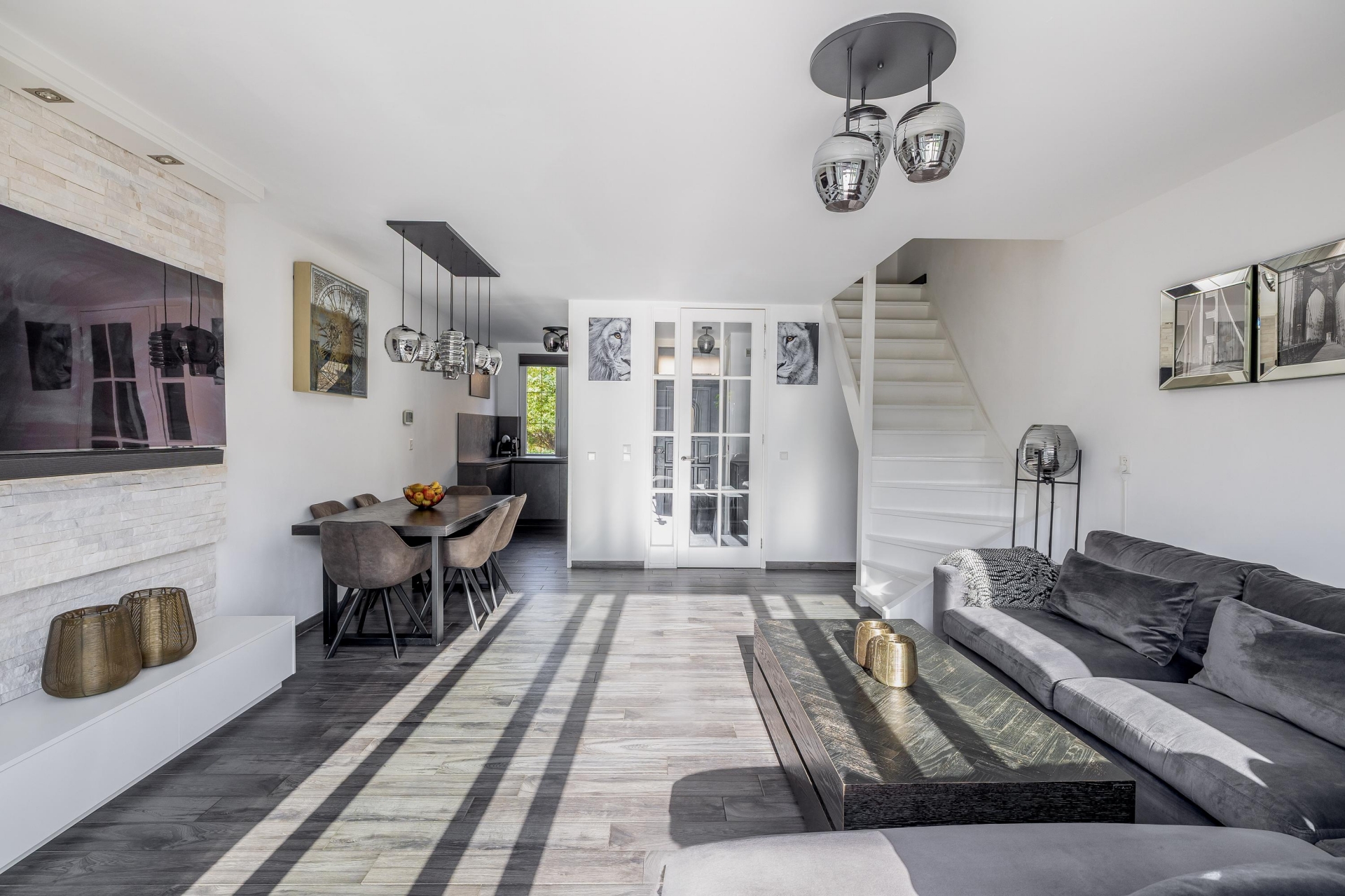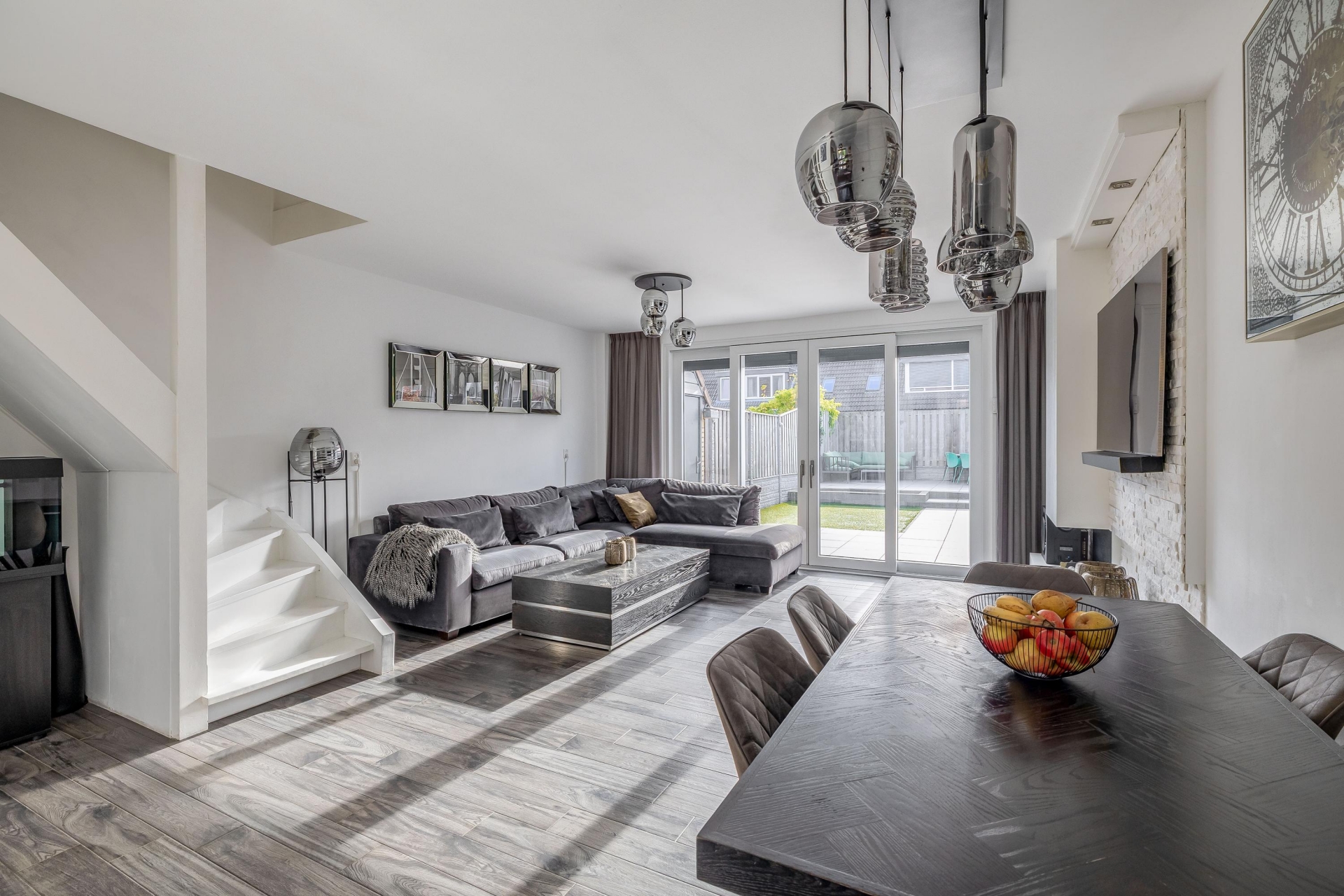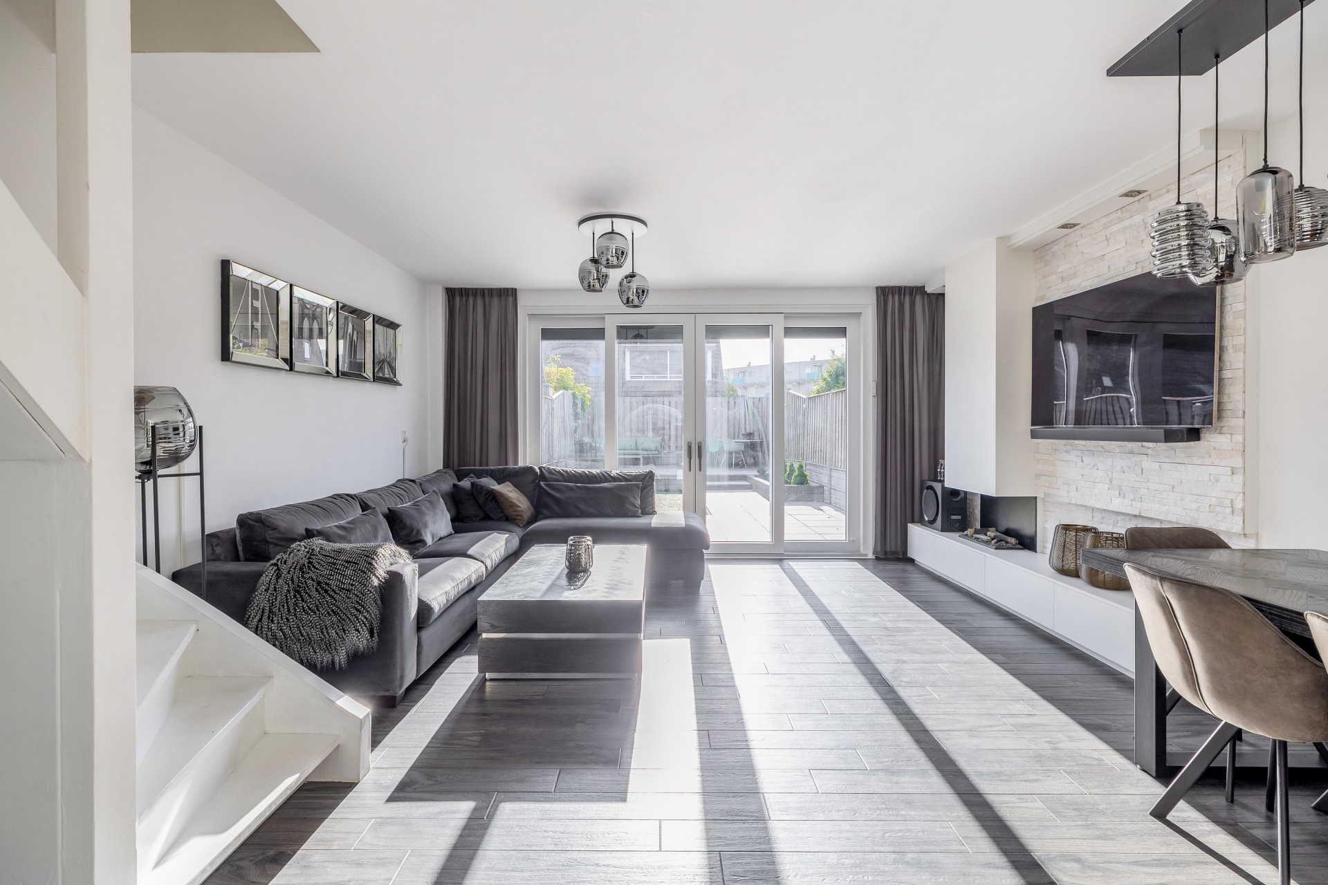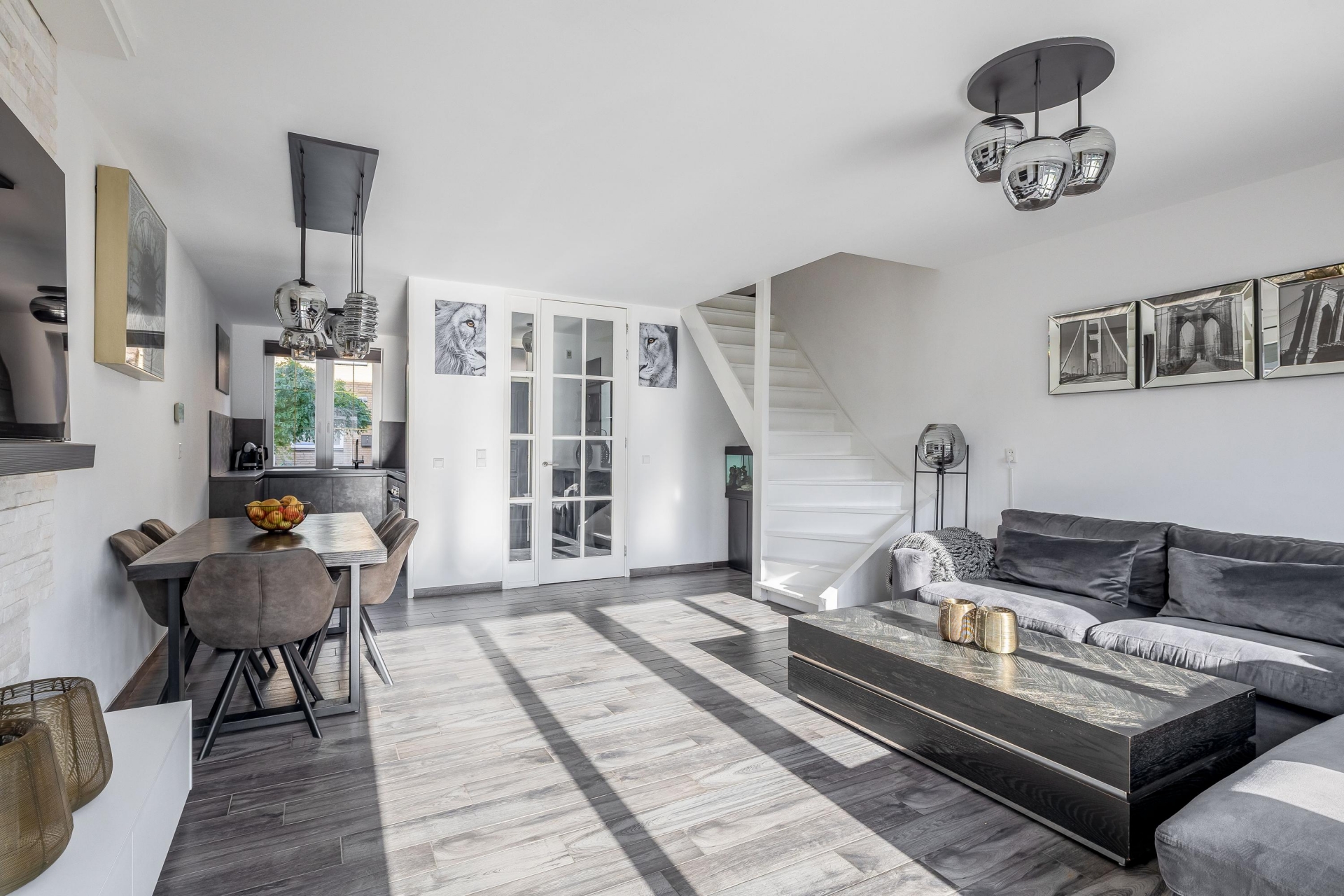 De woonkamer is dankzij de grote raampartijen en de kunststof dubbele schuifpui aan de achterzijde heerlijk licht en biedt een fijne sfeer om in te wonen. De afwerking is strak en modern, met een neutrale kleurstelling en een praktische indeling. Aan de voorzijde bevindt zich de keuken, vernieuwd in 2022, uitgevoerd in een moderne stijl met betonlook en voorzien van diverse inbouwapparatuur zoals een inductiekookplaat, combi-oven, vaatwasser en koel-/vriescombinatie. De keuken en woonkamer staan in halfopen verbinding met elkaar en vormen samen een prettige leefruimte met veel licht en comfort.