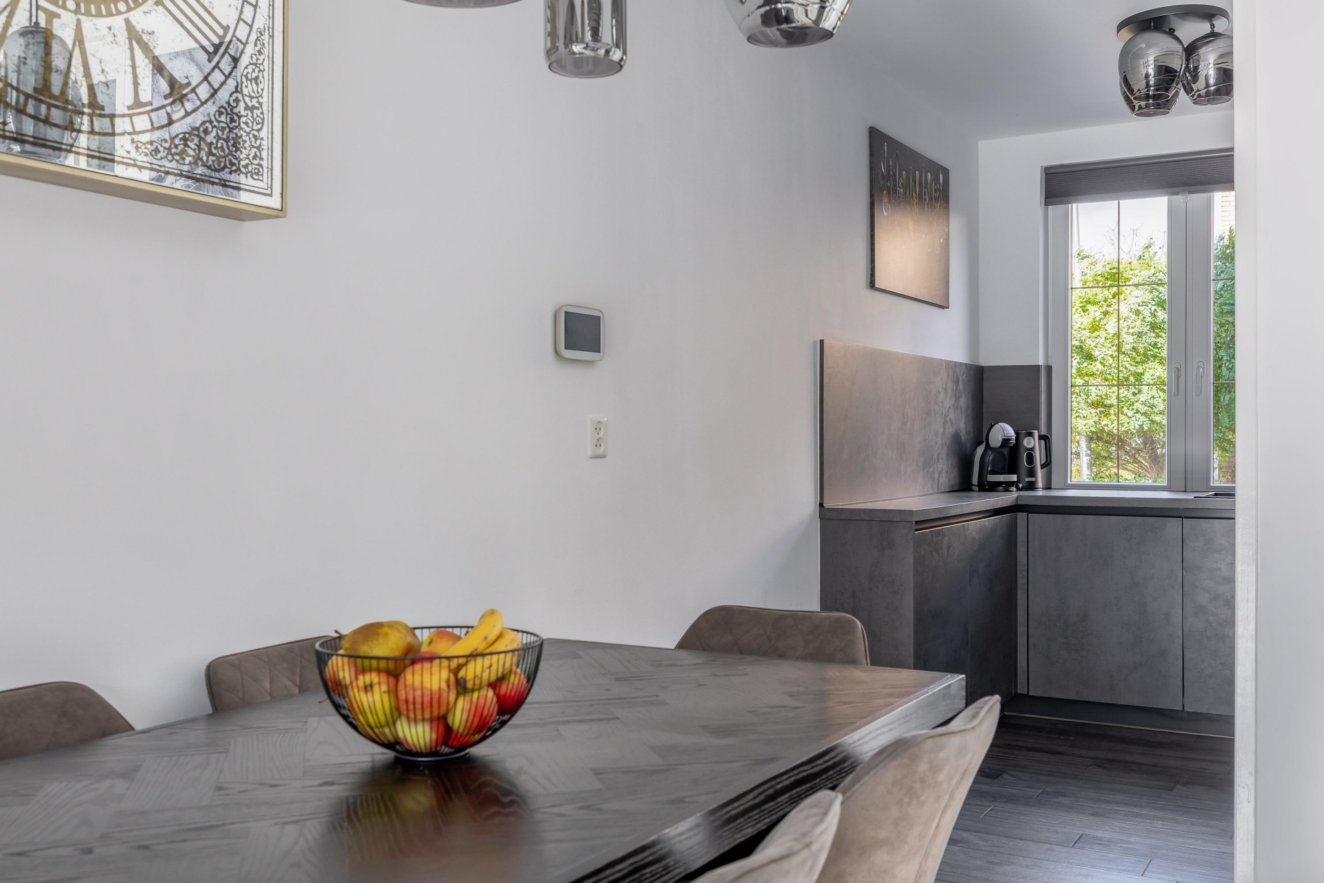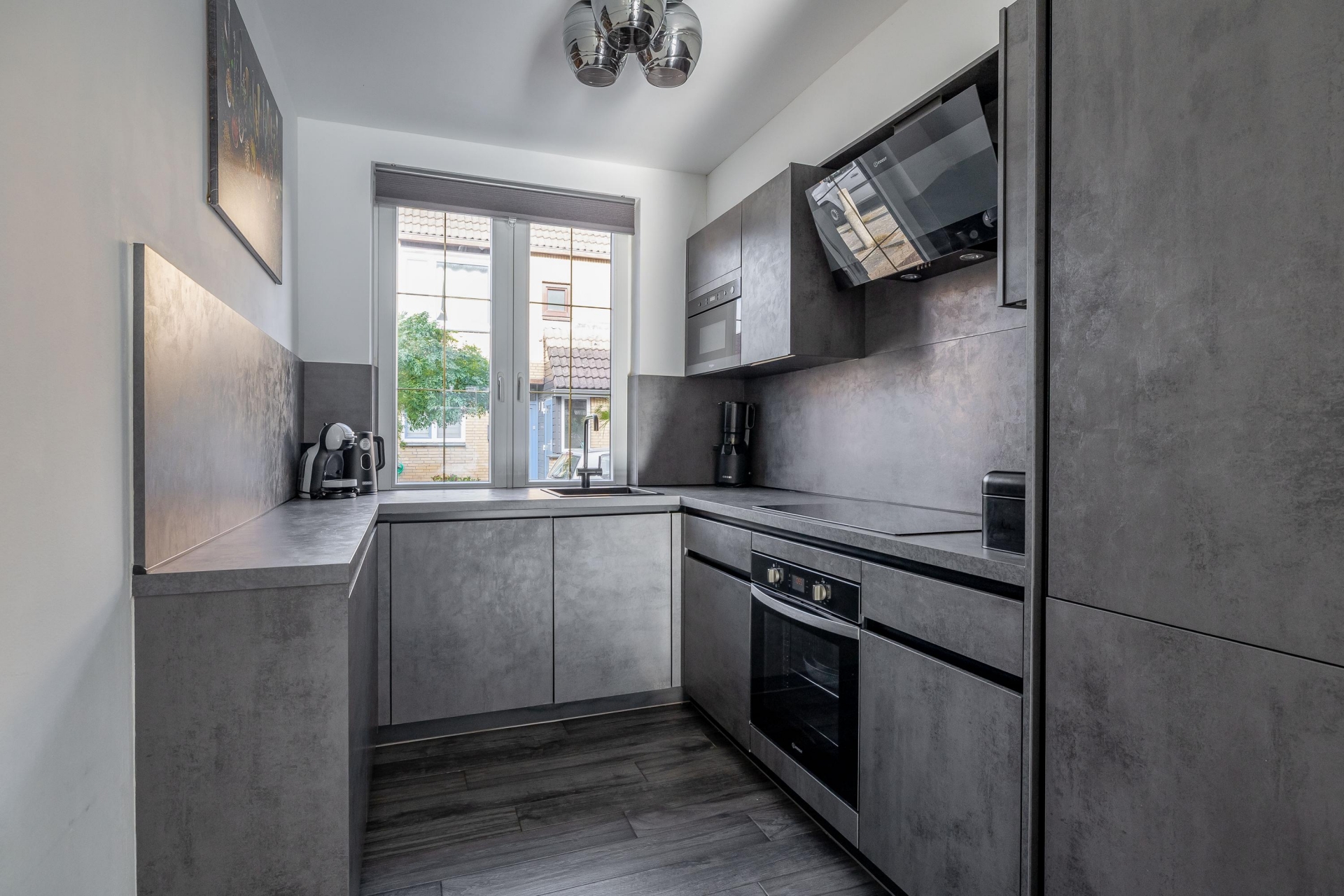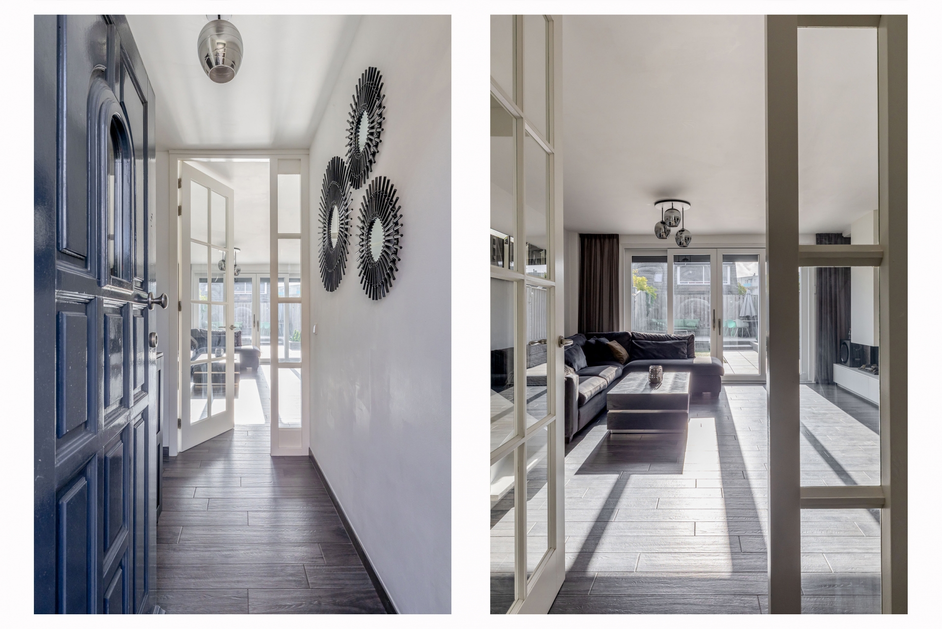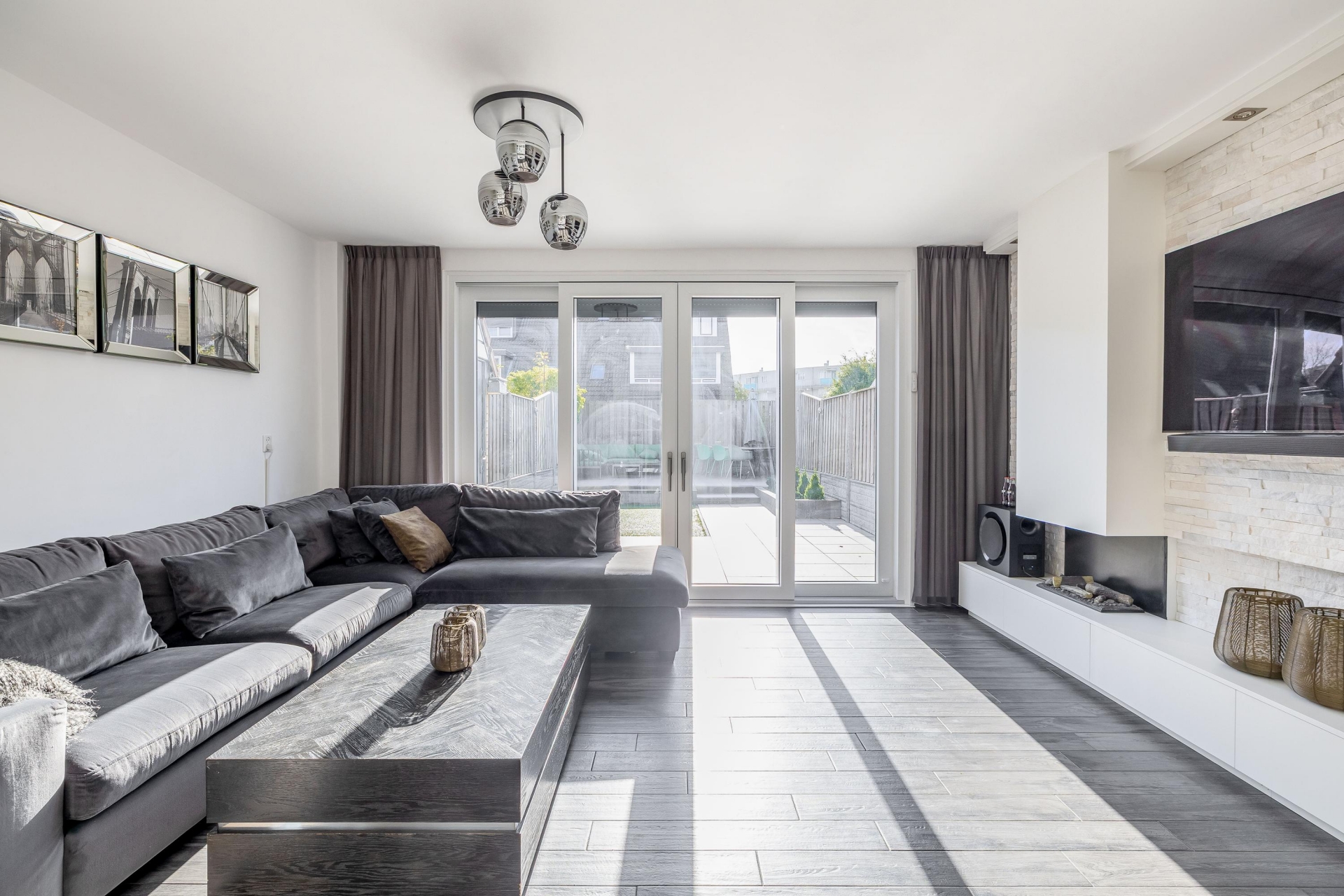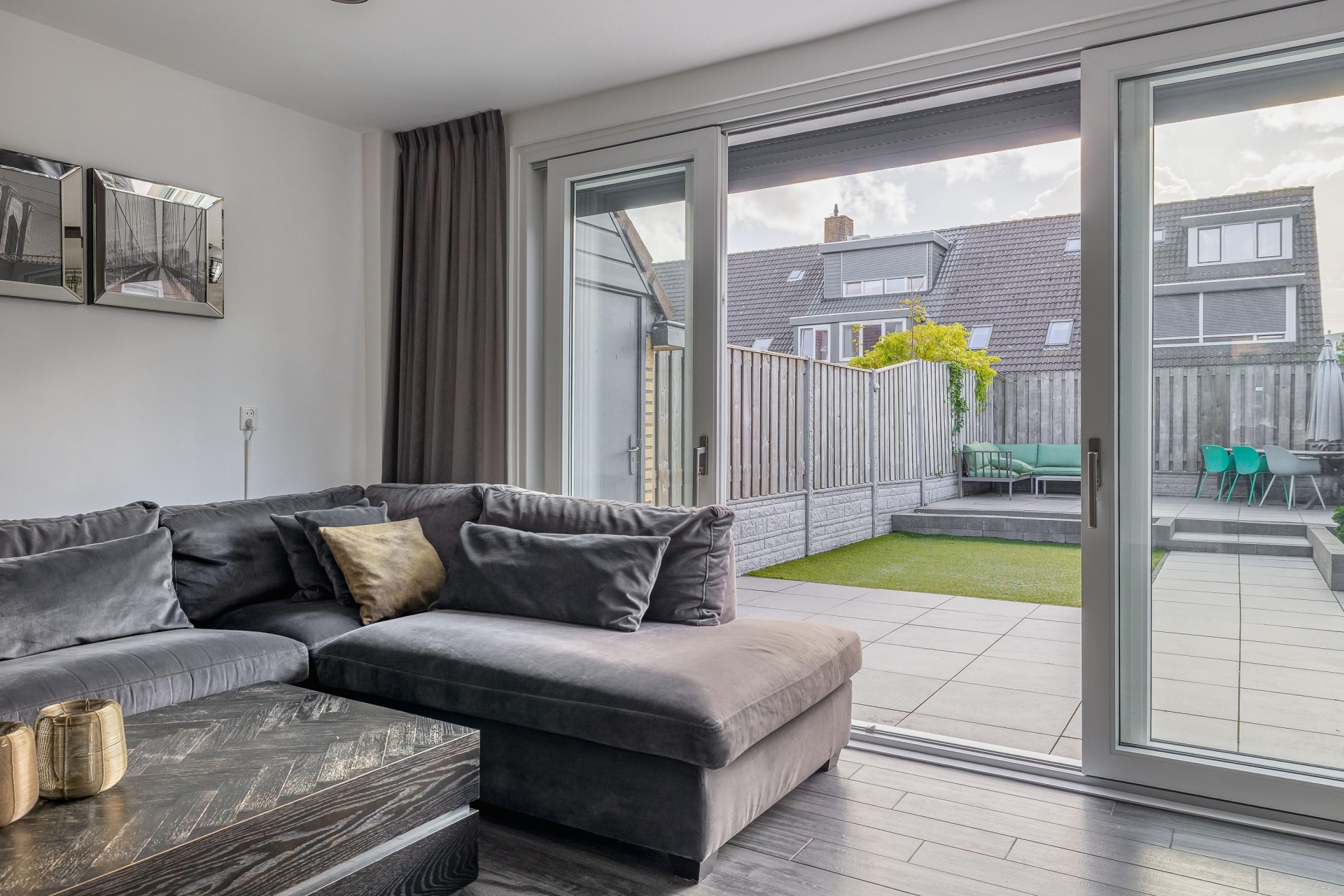 De woonkamer is dankzij de grote raampartijen en de kunststof dubbele schuifpui aan de achterzijde heerlijk licht en biedt een fijne sfeer om in te wonen. De afwerking is strak en modern, met een neutrale kleurstelling en een praktische indeling. Aan de voorzijde bevindt zich de keuken, vernieuwd in 2022, uitgevoerd in een moderne stijl met betonlook en voorzien van diverse inbouwapparatuur zoals een inductiekookplaat, combi-oven, vaatwasser en koel-/vriescombinatie. De keuken en woonkamer staan in halfopen verbinding met elkaar en vormen samen een prettige leefruimte met veel licht en comfort.