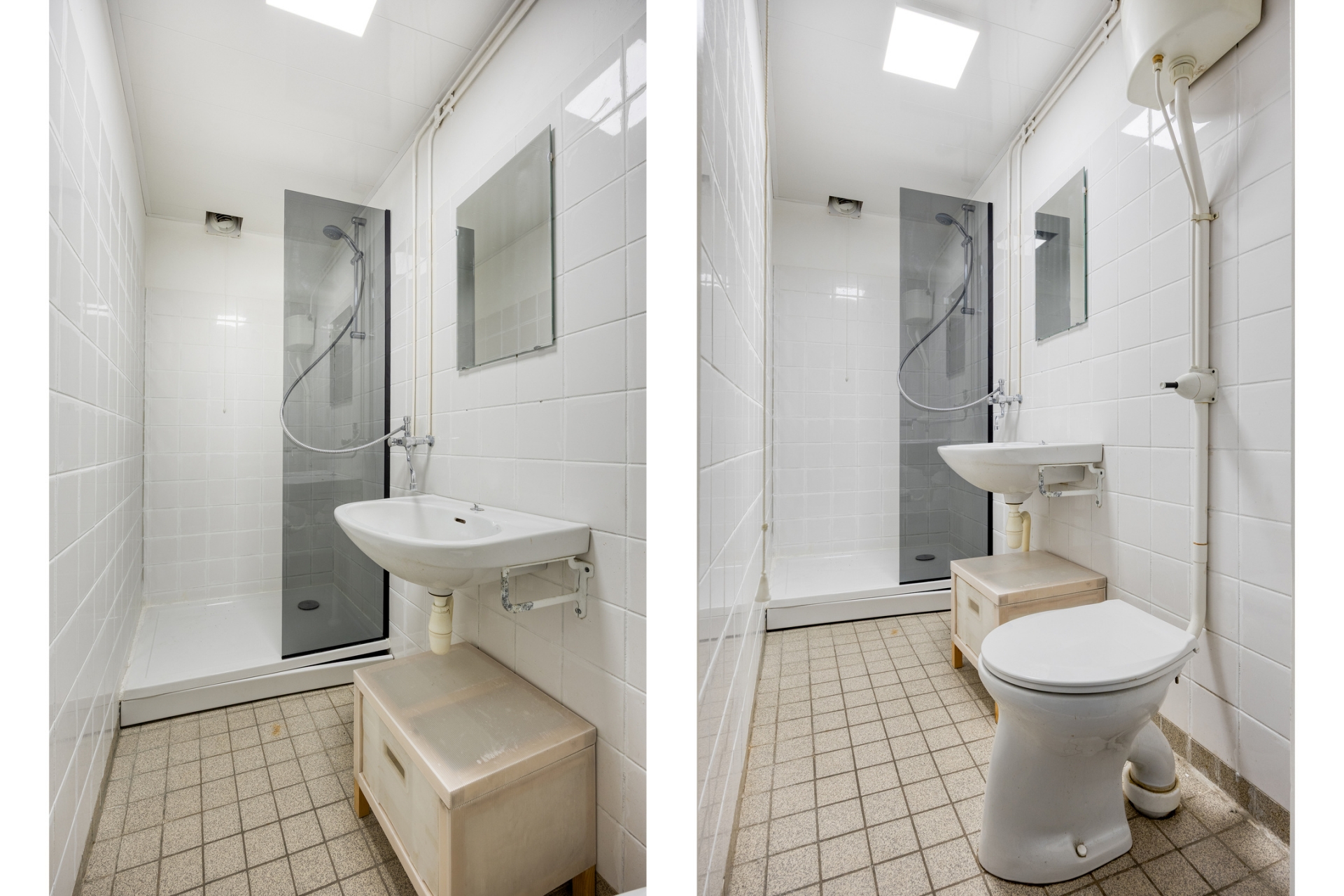 Aan de zijkant van de woonruimte is een afgescheiden slaapgedeelte, wat zorgt voor een praktische indeling van de studio. De badkamer is netjes en functioneel, voorzien van douche, toilet en wastafel, en uitgevoerd in lichte kleurstelling.