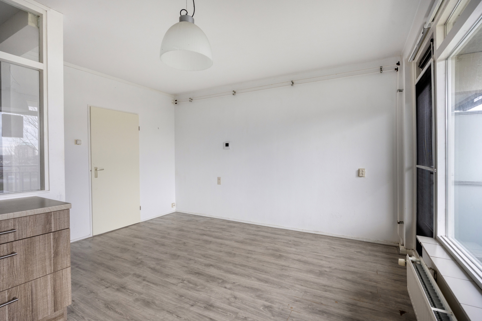 De woonkamer is heerlijk licht dankzij de grote raampartijen en de gunstige ligging op het zuidwesten. Er is voldoende ruimte voor een gezellige zithoek en eethoek, met direct toegang tot het balkon. Hier geniet je in de middag en avond van de zon én het uitzicht over het park met waterpartij. De open keuken is compact en netjes afgewerkt, met voldoende kastruimte.