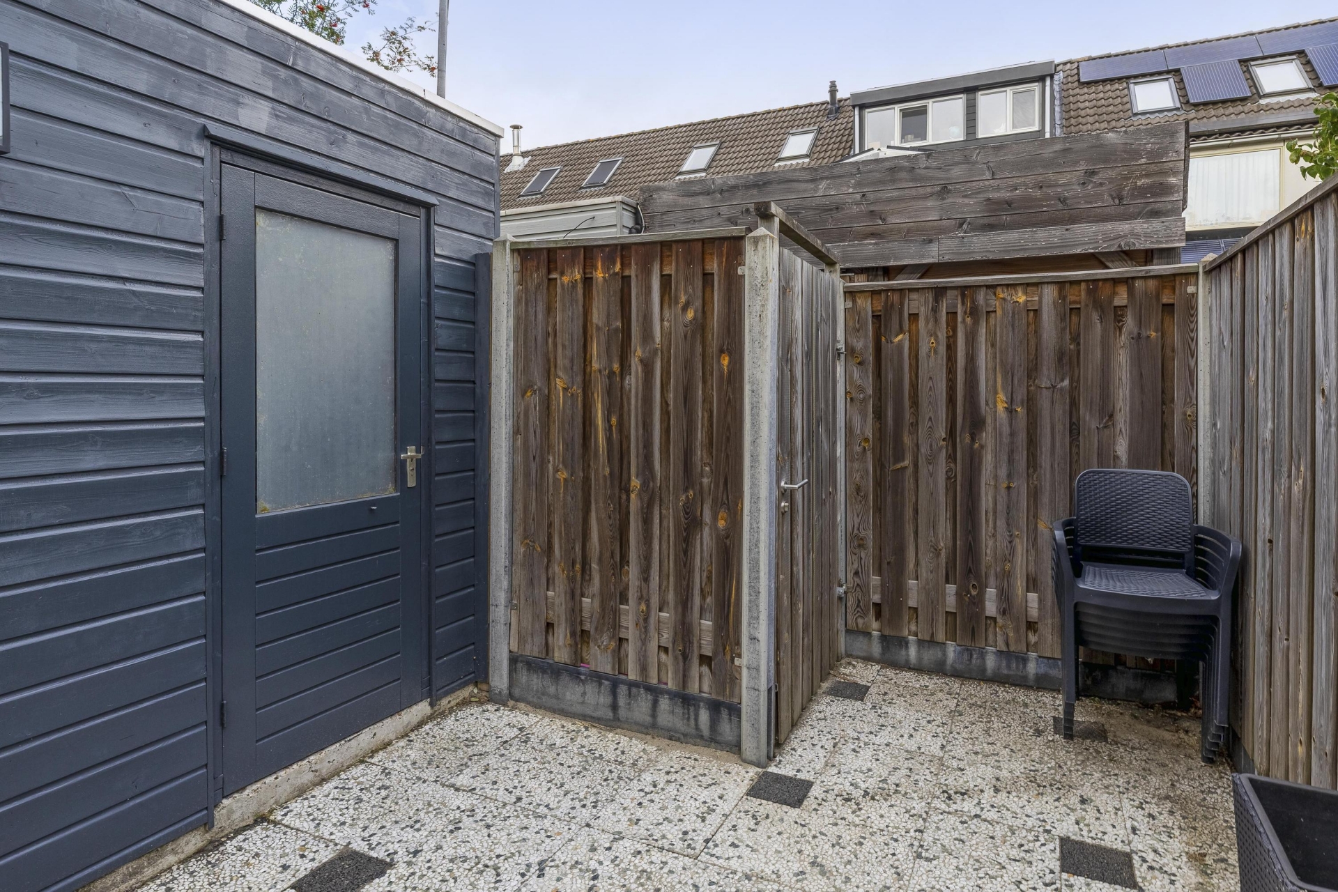 - Zonnige achtertuin op het noorden (circa 5,5 meter breed en 10 meter diep) met berging. Verder voorzien van een buitenkraan en achterom;