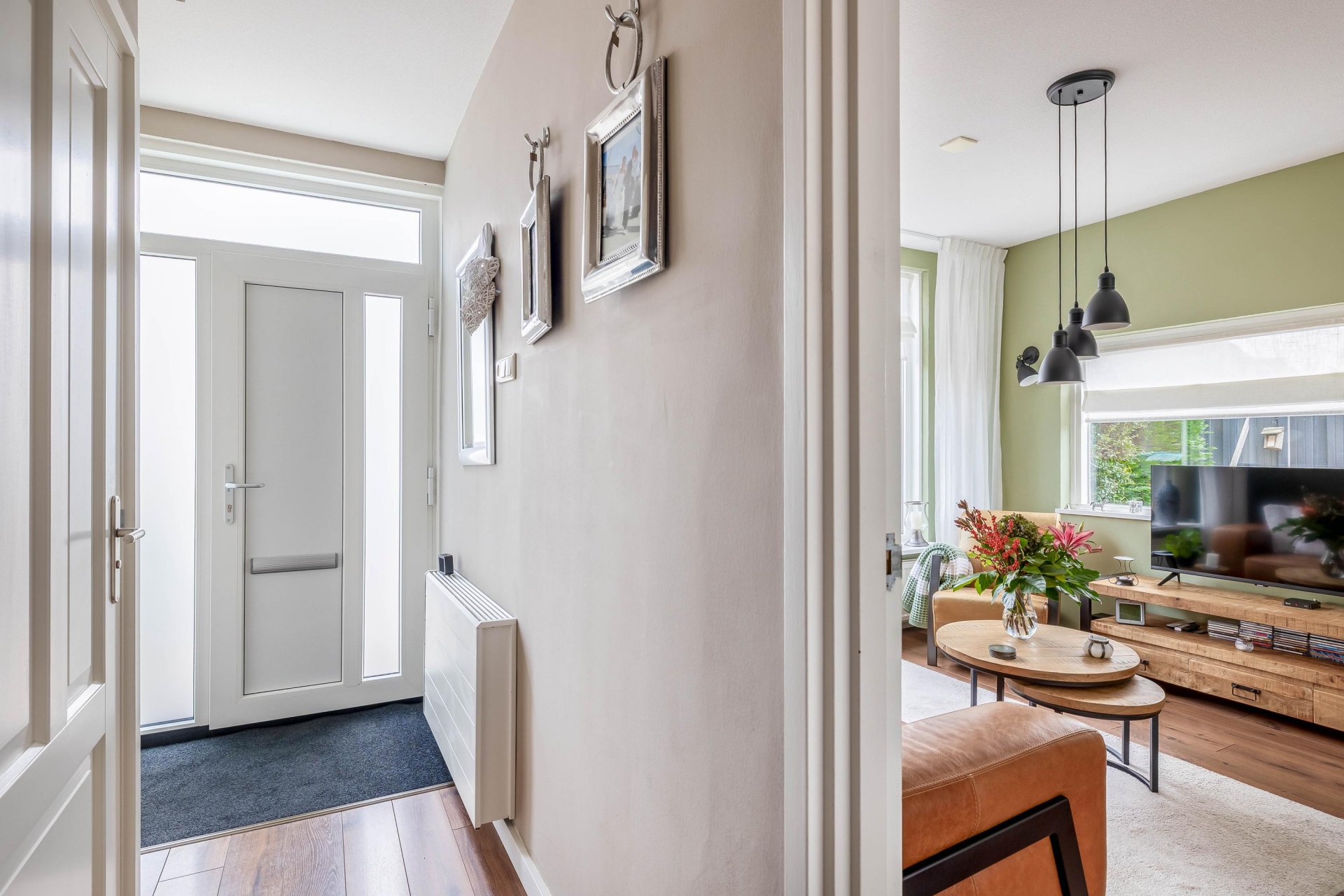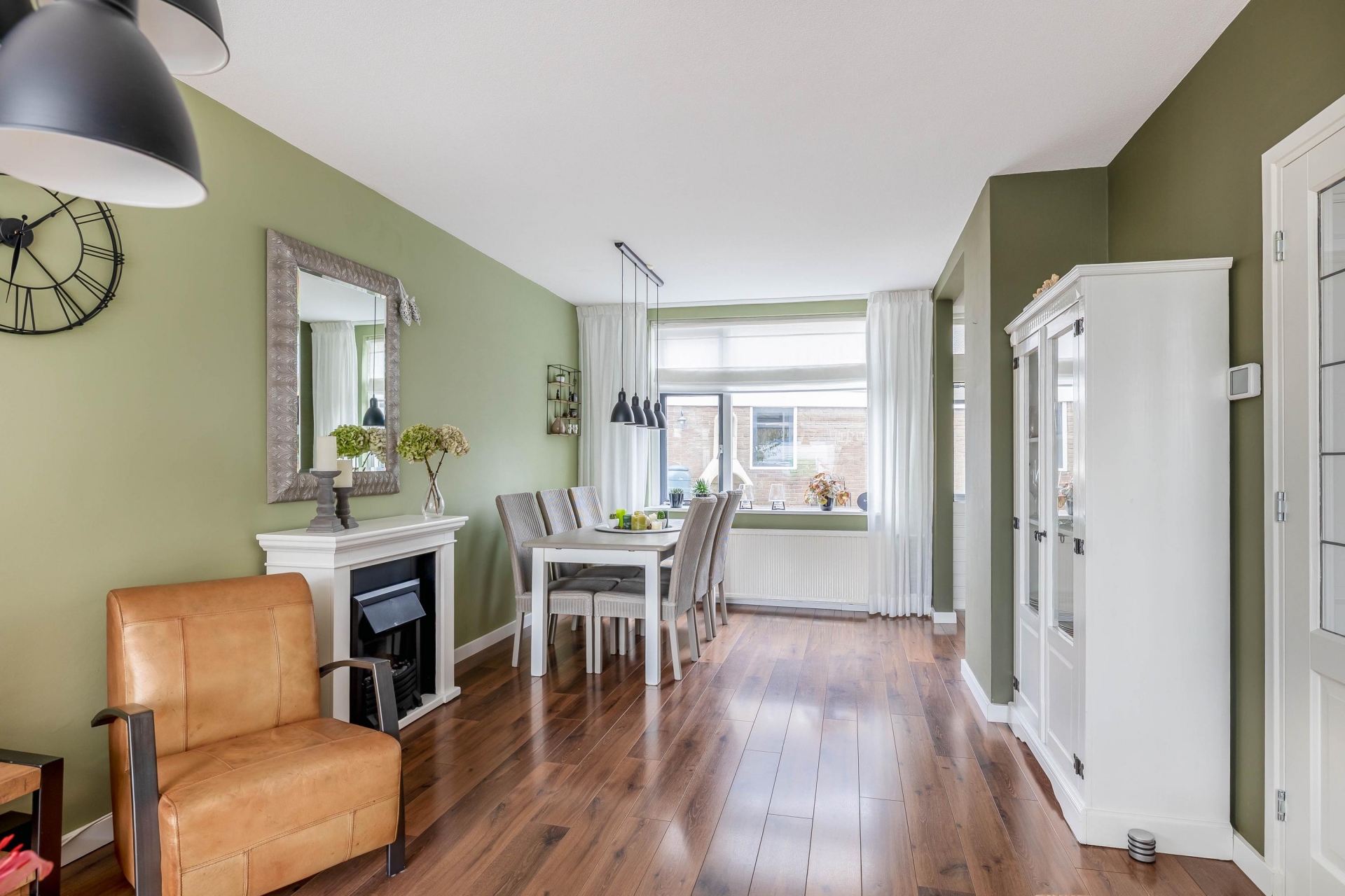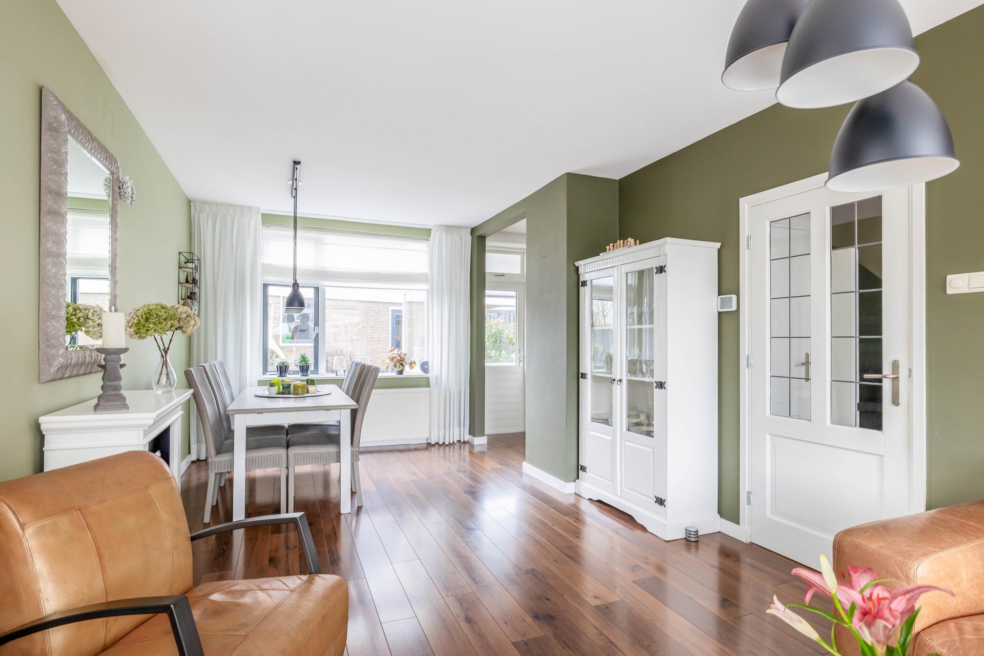 Binnenstappen in dit huis voelt meteen goed. De woonkamer is heerlijk licht door het grote raam aan de voorzijde en de hoekligging zorgt voor extra daglicht en een vrij zicht op de straat. De combinatie van warme kleuren, houten vloer en strak afgewerkte wanden geeft een uitnodigende en moderne sfeer. De zithoek aan de voorzijde is perfect om tot rust te komen, terwijl er aan de achterzijde voldoende ruimte is voor een grote eettafel. Hier zit je met gemak met het hele gezin of met vrienden te eten of borrelen.