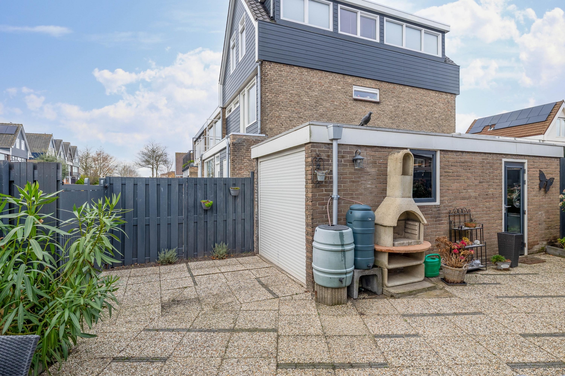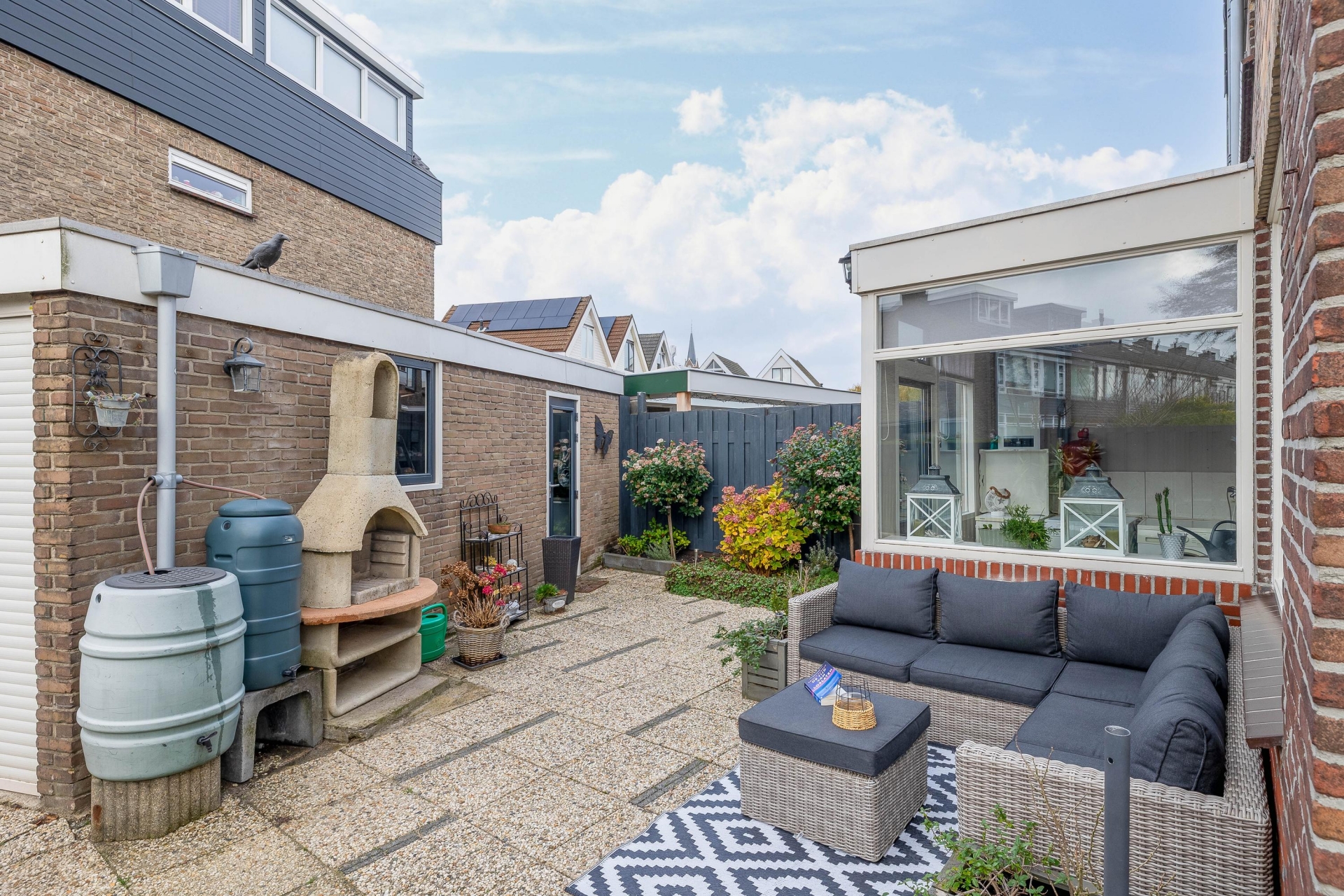 De tuin ligt op het zuidwesten, wat betekent dat je vooral in de ochtend en vroege middag kunt genieten van de zon – ideaal voor een rustig ontbijtje of een ontspannen lunch buiten. De tuin is netjes aangelegd met sierbestrating, borders en ruimte voor meerdere zitplekken. Of je nu kiest voor een loungeset of een grote buitentafel: hier heb je alle ruimte om buiten te leven. Een stenen berging en achterom maken het geheel compleet en praktisch.