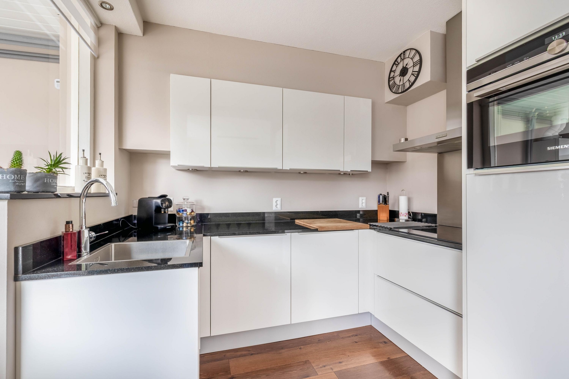 Aansluitend aan de eethoek vind je de nette keuken, voorzien van alle wenselijke inbouwapparatuur. Ook hier is de afwerking verzorgd: licht, fris en praktisch in gebruik.