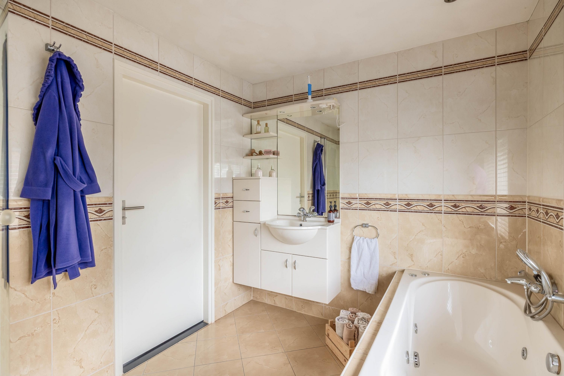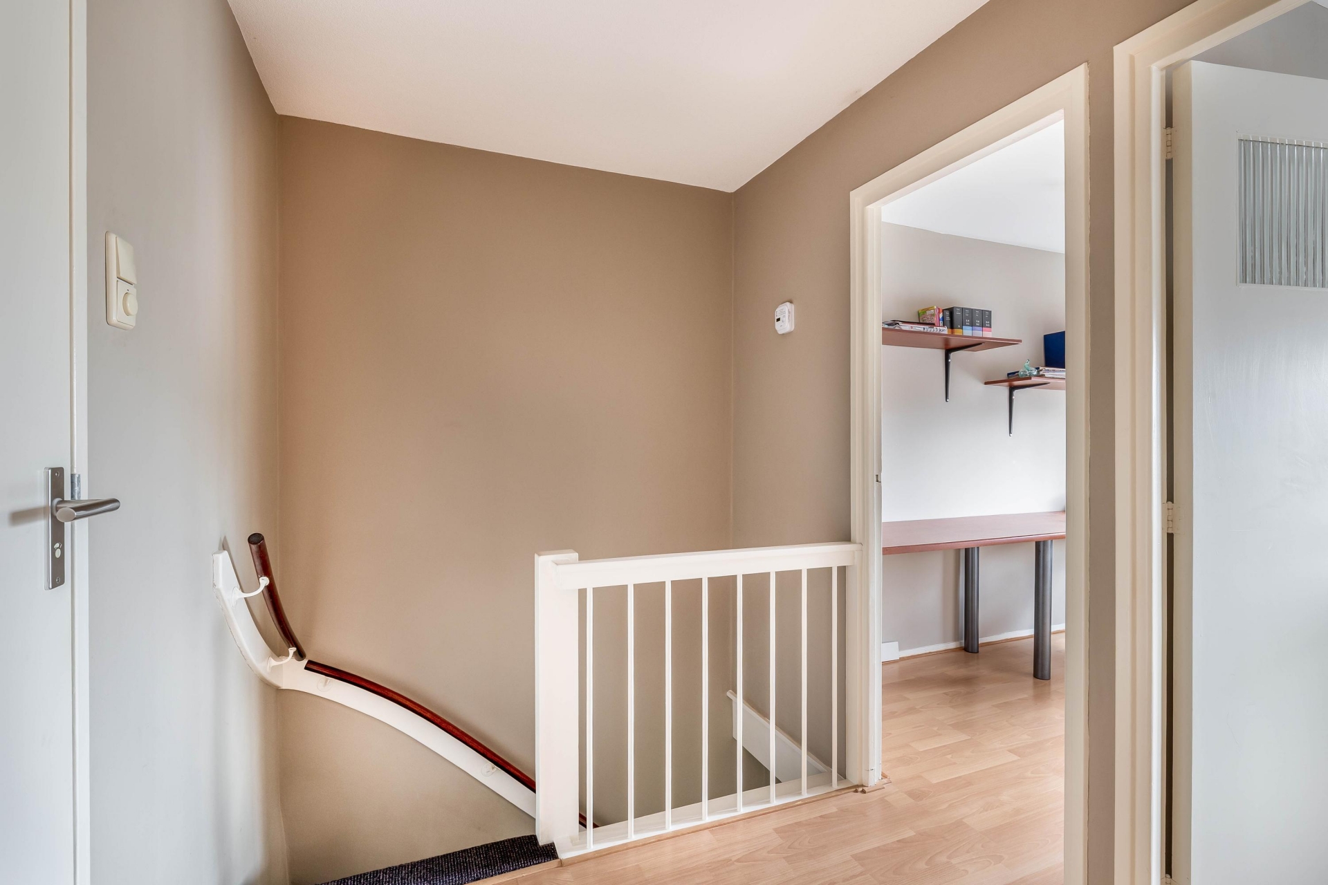 Op de eerste verdieping zijn drie slaapkamers te vinden, waarvan de grootste aan de voorzijde ligt. Deze kamer is ruim genoeg voor een tweepersoonsbed en een grote kledingkast. De andere twee kamers zijn perfect als kinderkamer, logeerkamer of thuiskantoor. De badkamer is keurig en functioneel, met douche, wastafel, ligbad en een tweede toilet.
