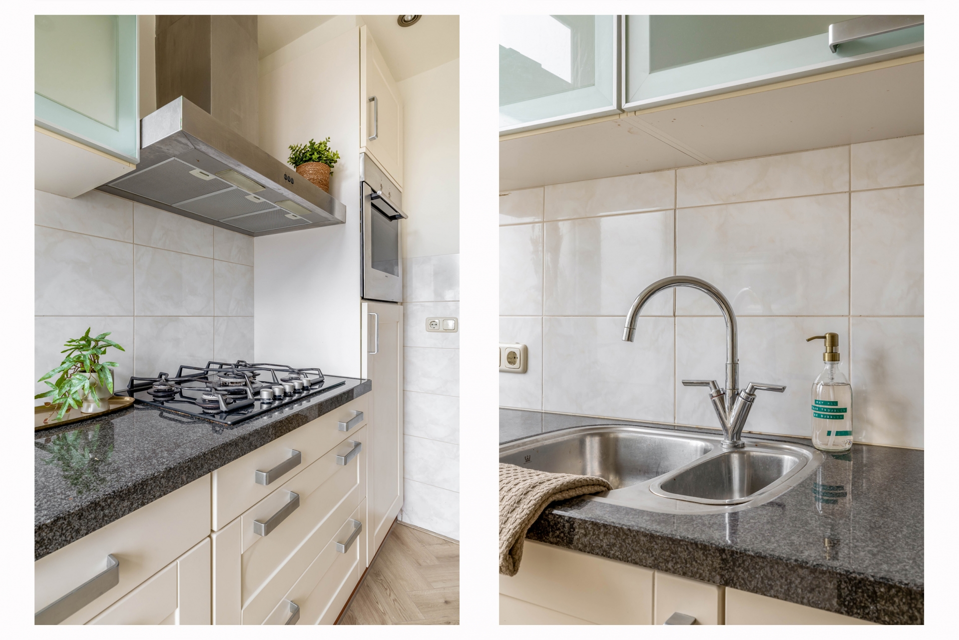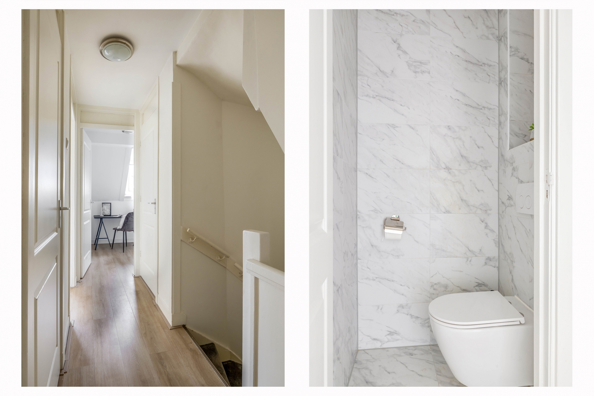 Op de eerste woonlaag vindt u een lichte woonkamer met grote raampartijen, gescheiden van de eetkamer door prachtige houten schuifdeuren met glas-in-lood. De halfopen keuken is voorzien van diverse inbouwapparatuur en biedt directe toegang tot het eerste balkon aan de achterzijde. Deze gehele verdieping is afgewerkt met een stijlvolle visgraat laminaatvloer.
