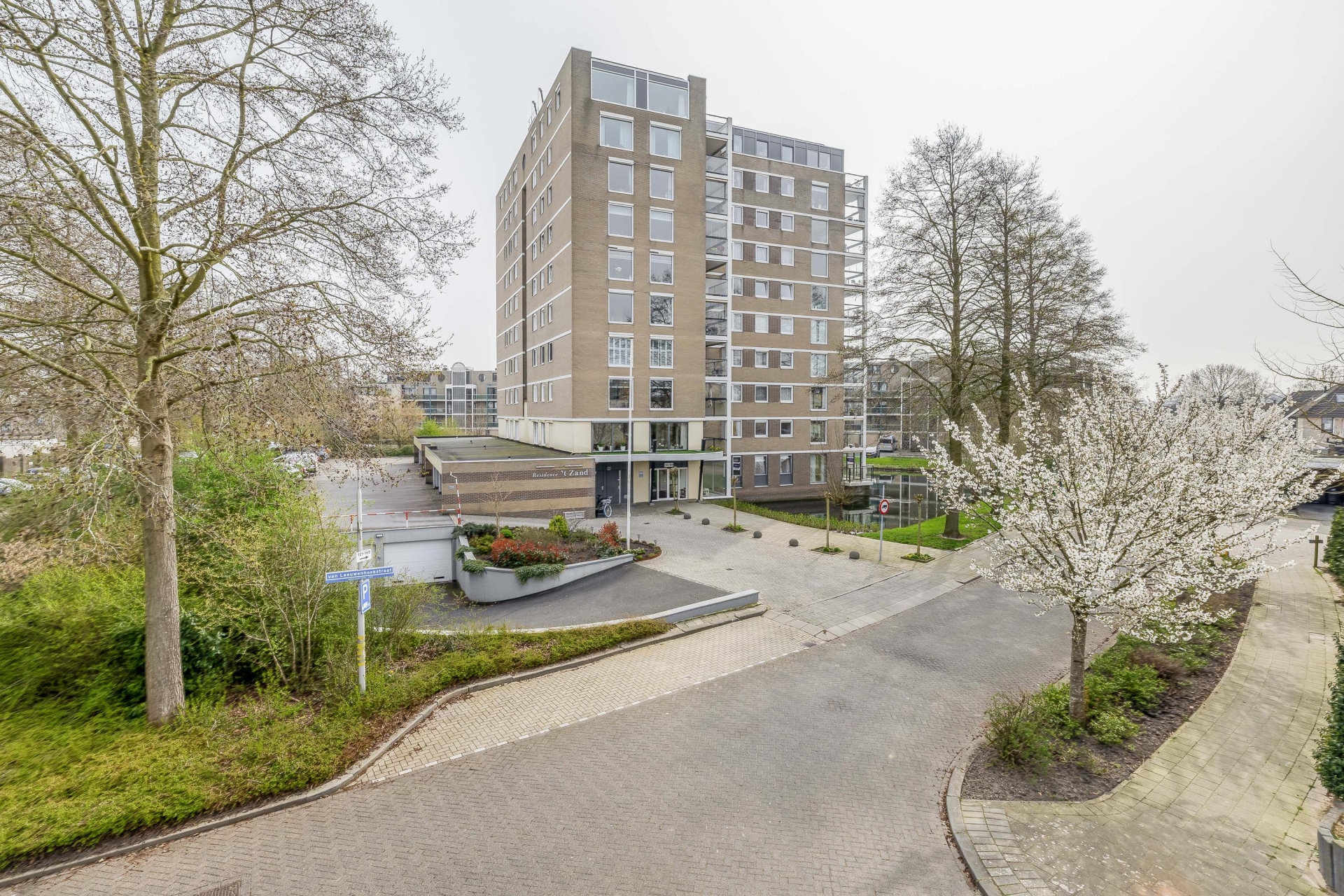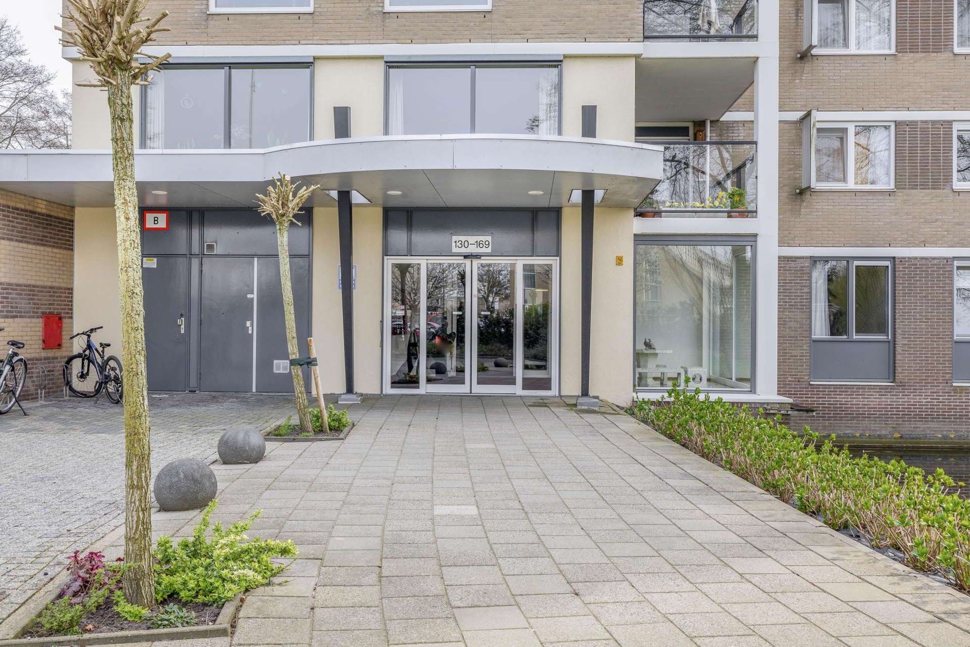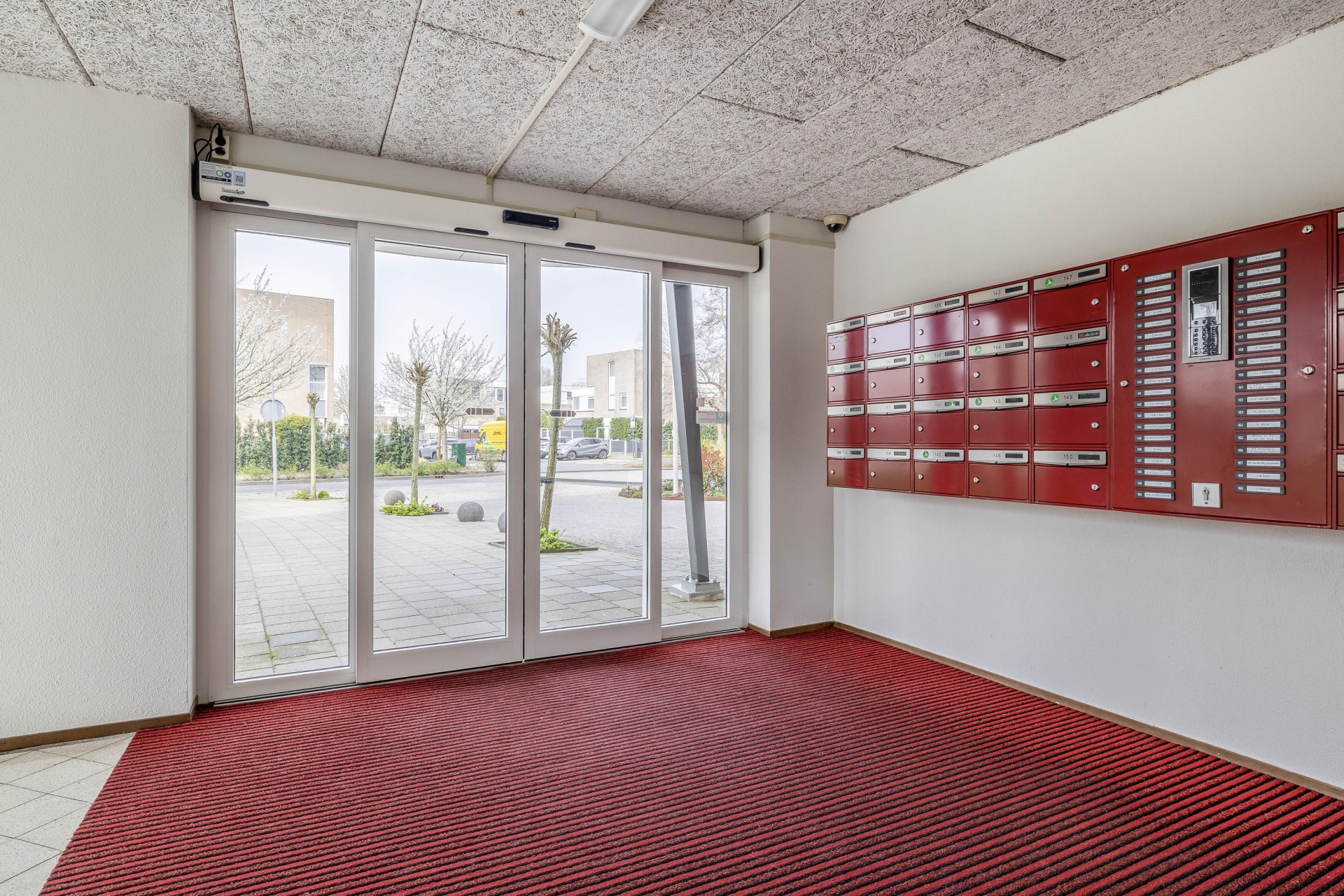 Het complex is verzorgd en biedt toegang tot de appartementen via een centrale entree. Vanuit hier bereik je de woning en de bijbehorende voorzieningen, waaronder de garage.
