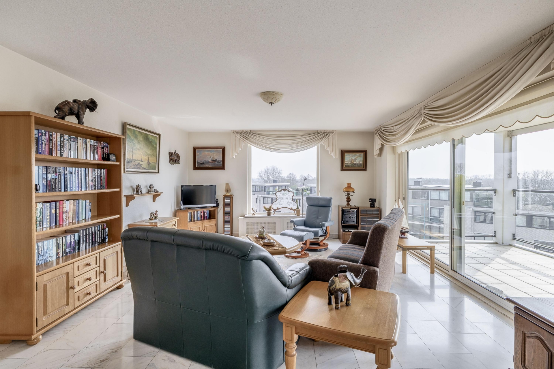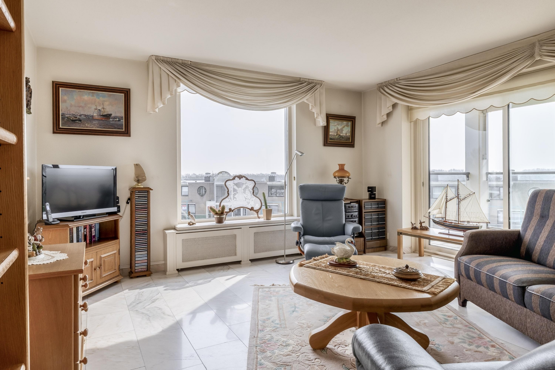 De woonkamer is ruim opgezet en vormt het hart van het appartement. Dankzij de grote raampartijen en de schuifpui is er veel lichtinval en een vrij uitzicht over Ridderkerk.
