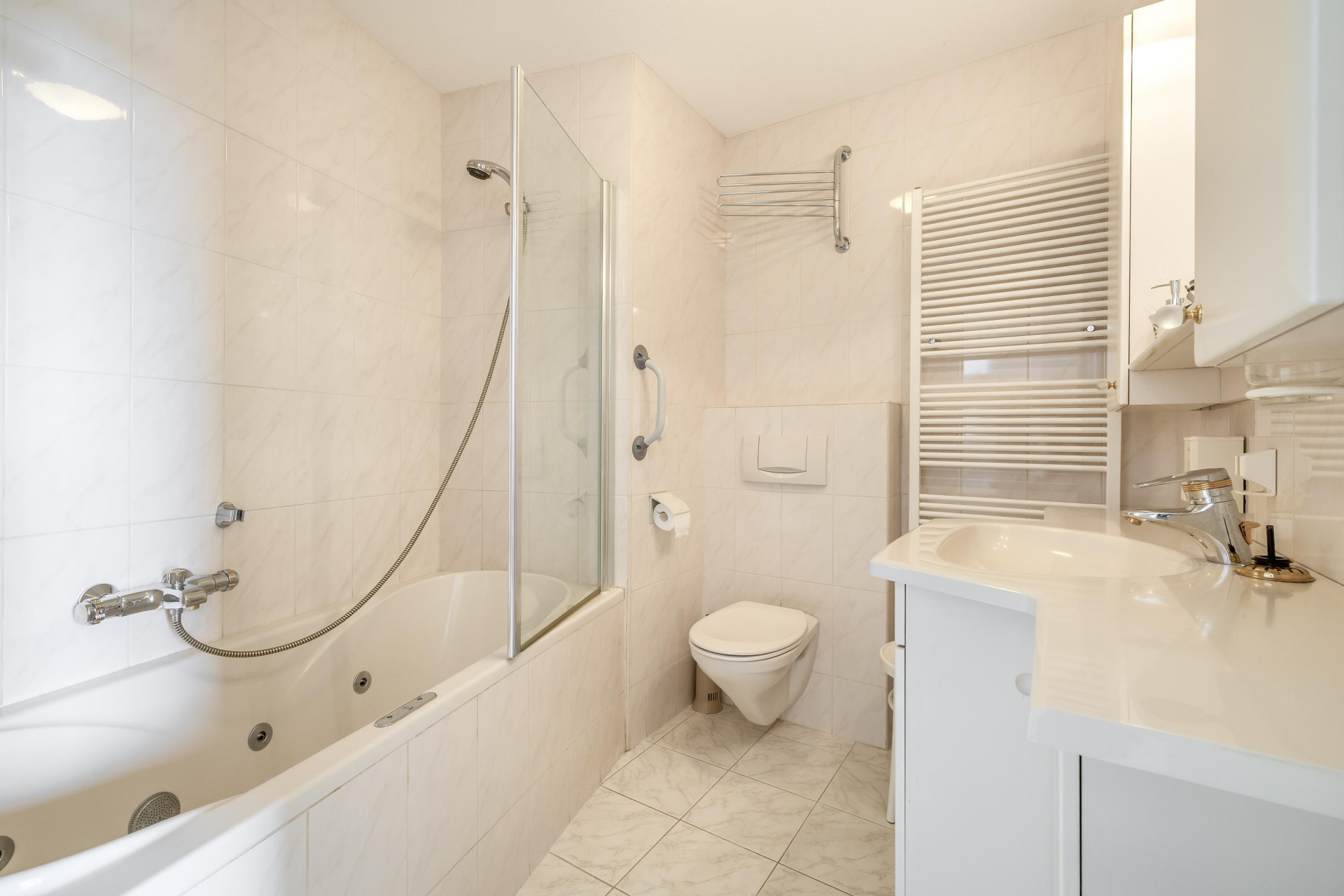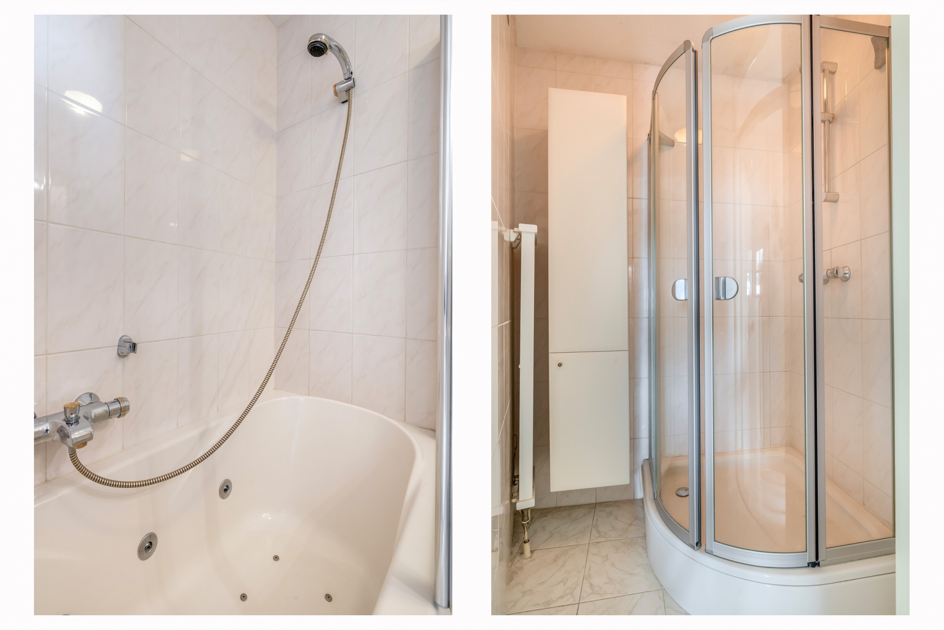 De badkamer in de grote slaapkamer is voorzien van een ligbad, wastafel en toilet. Daarnaast is er een extra doucheruimte aanwezig, wat zorgt voor extra comfort in het dagelijks gebruik.