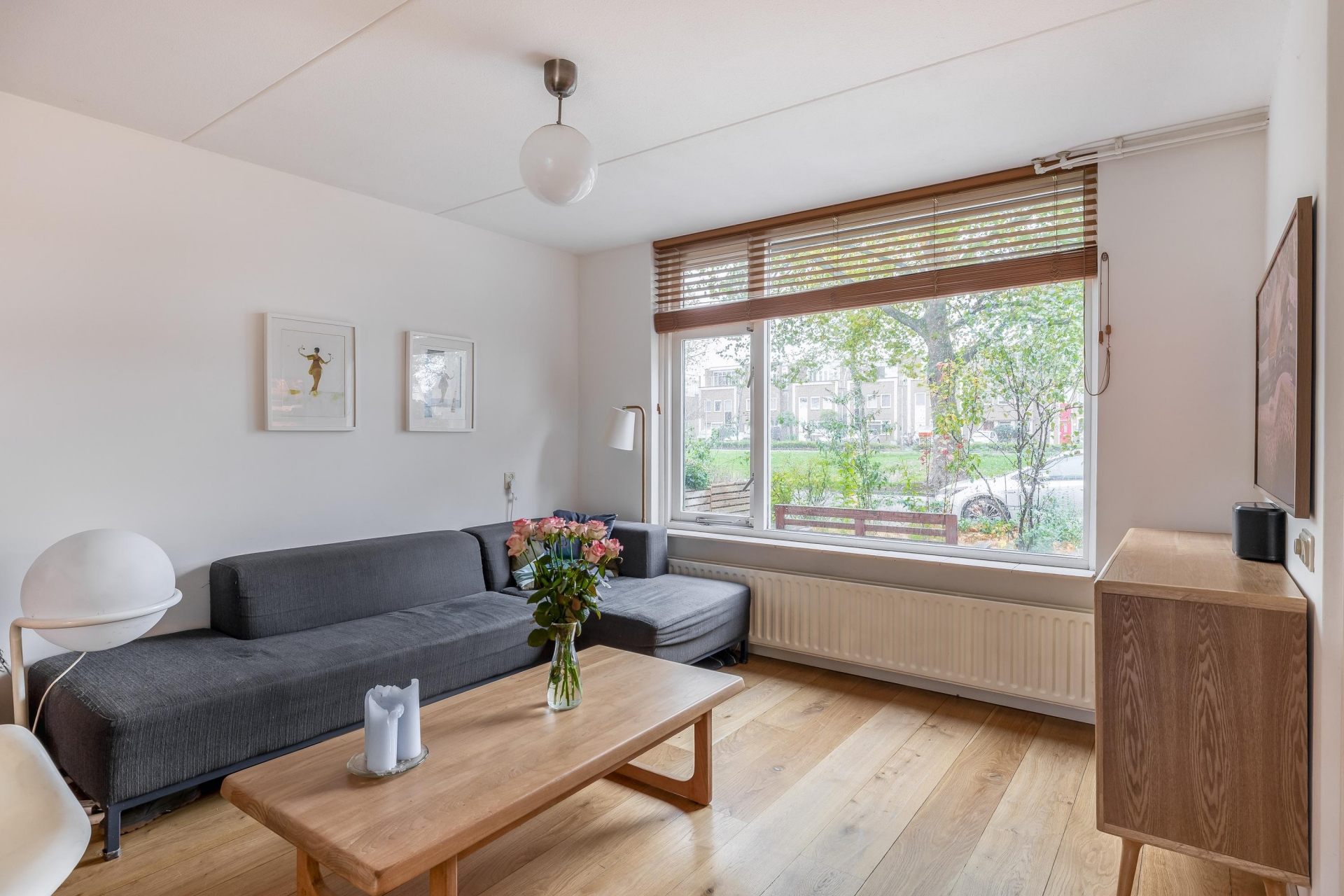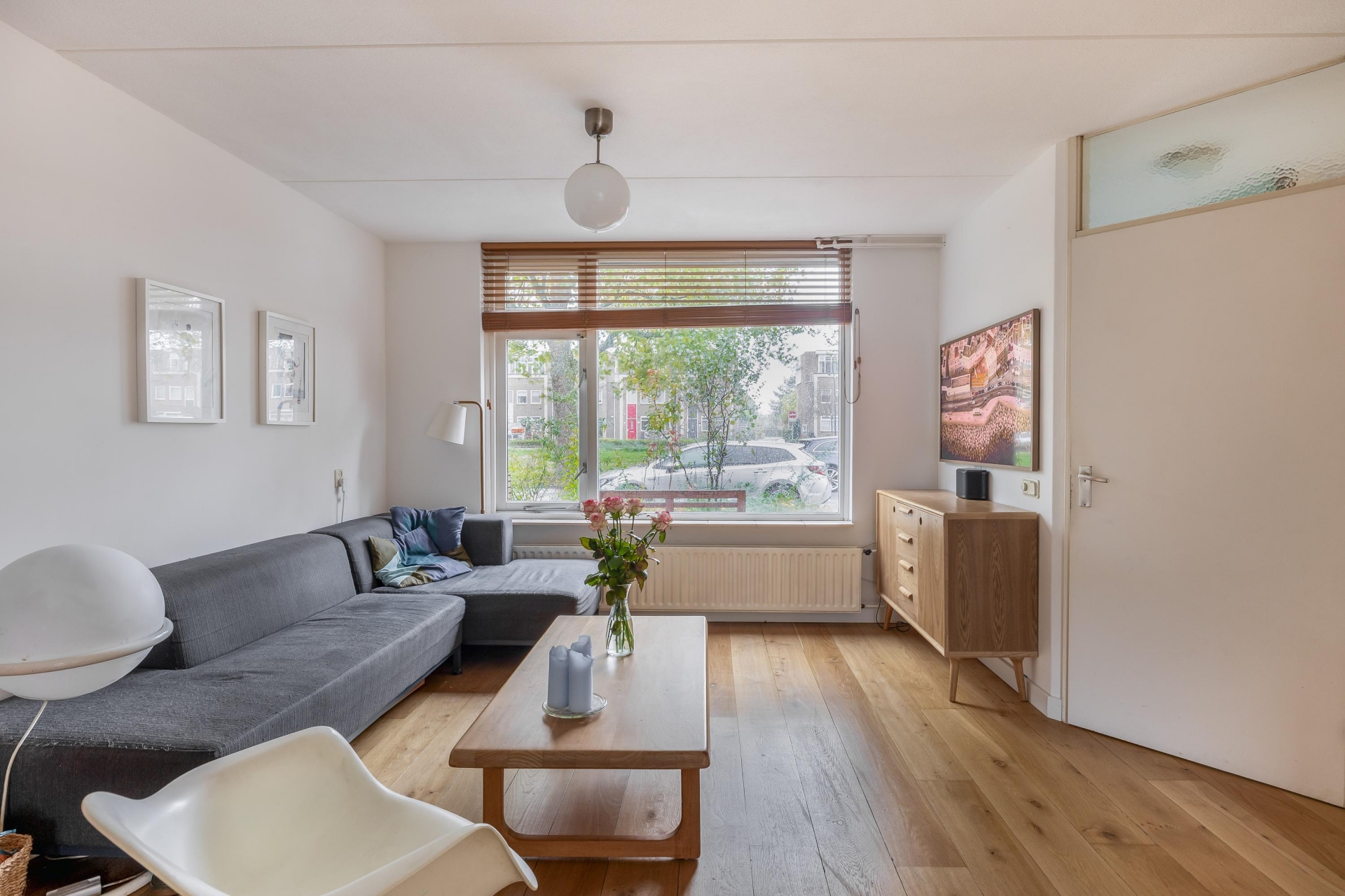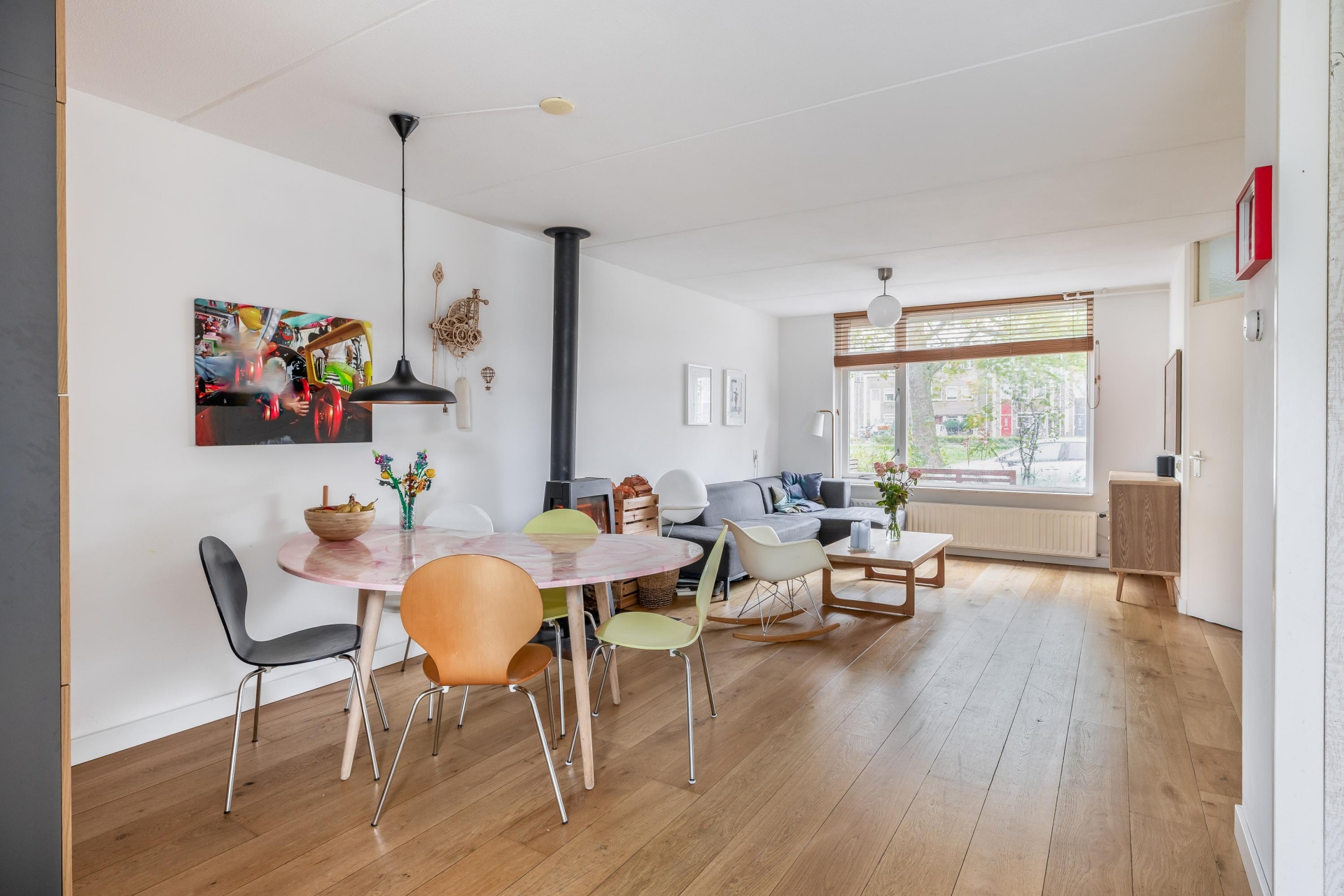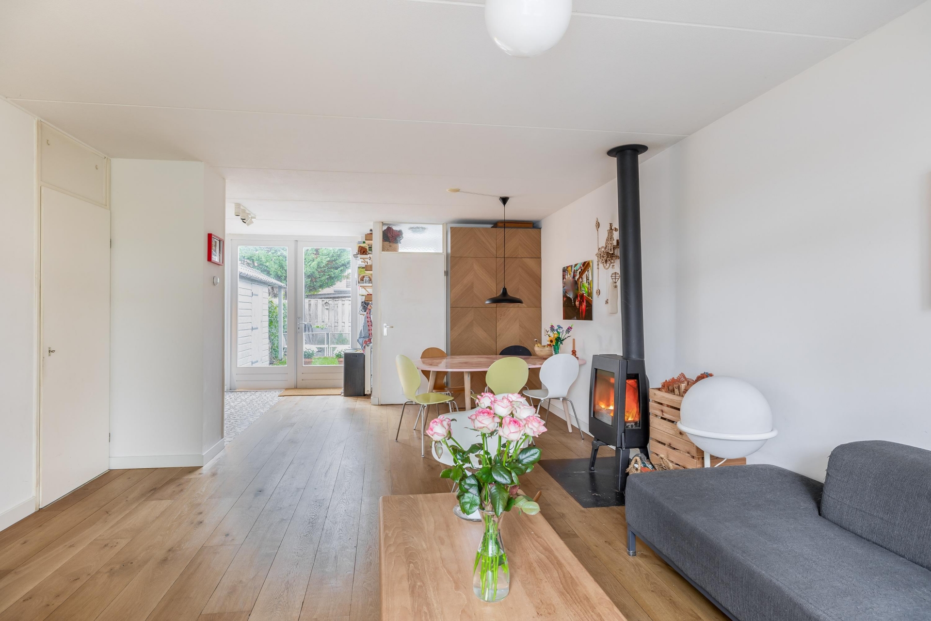 De woonkamer is licht en verzorgd, met strak afgewerkte wanden, een massiefhouten vloer en openslaande deuren naar de tuin. Aan de voorzijde is er vrij zicht op het groen in de straat. De houtkachel zorgt voor extra warmte en sfeer tijdens de koudere dagen.