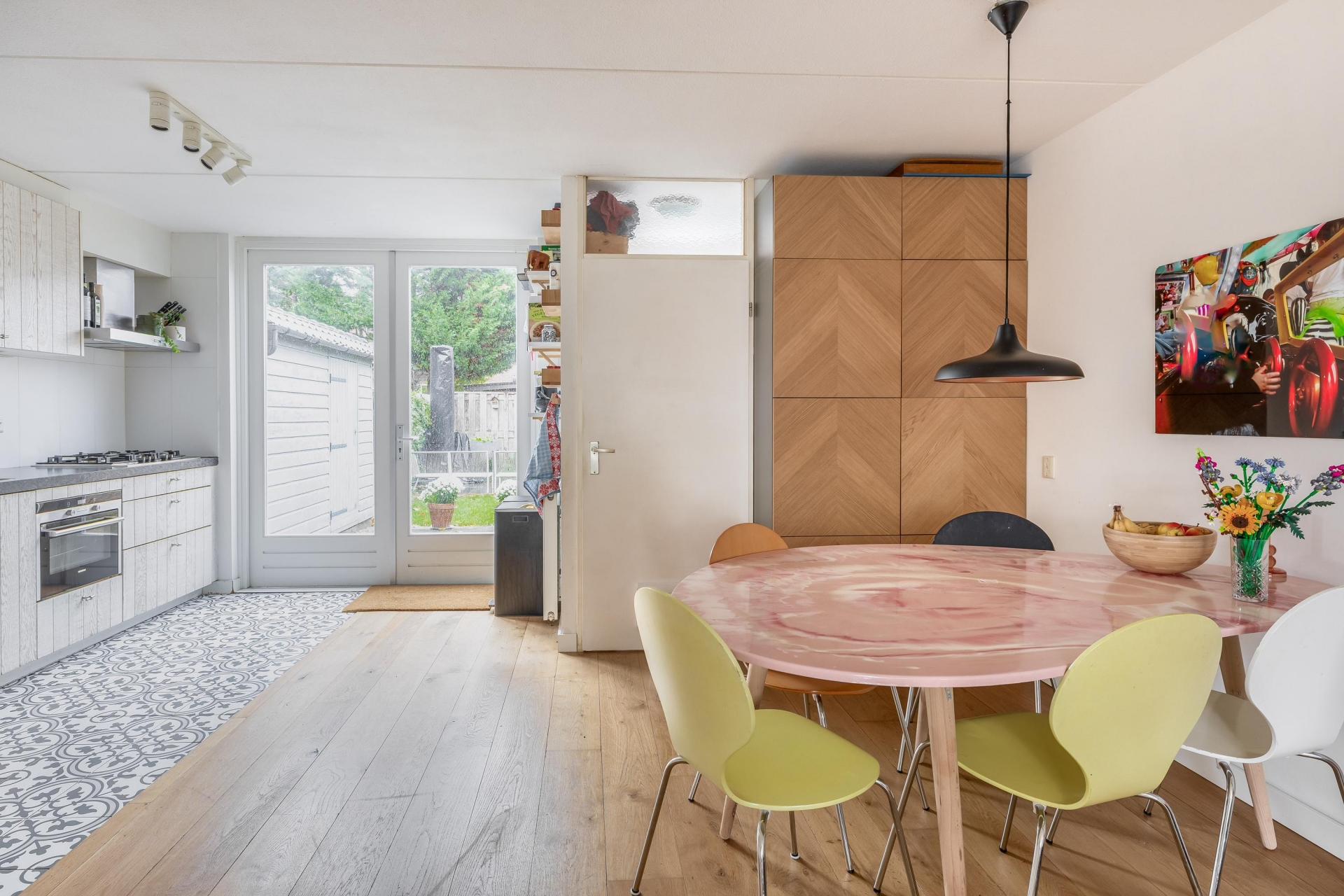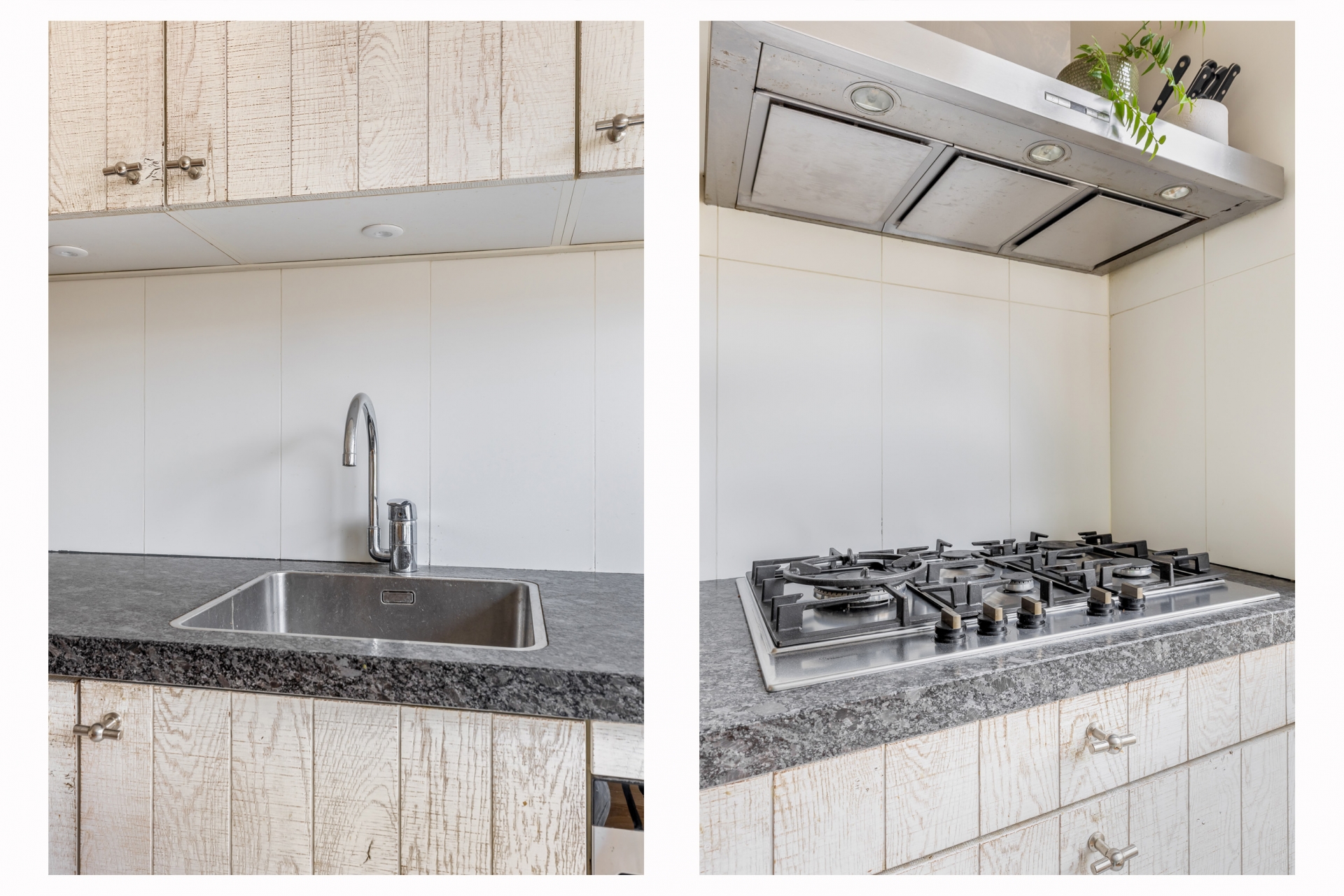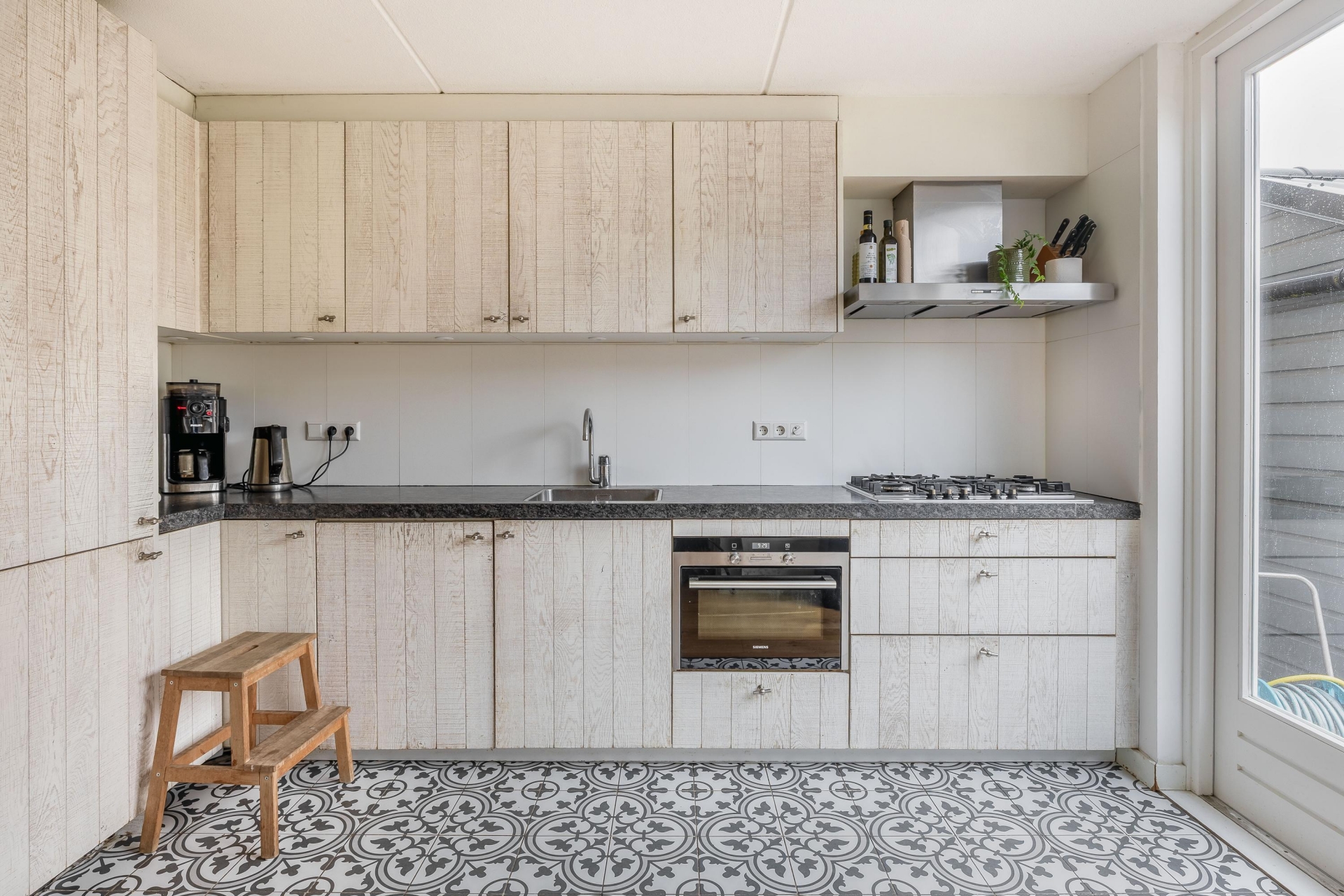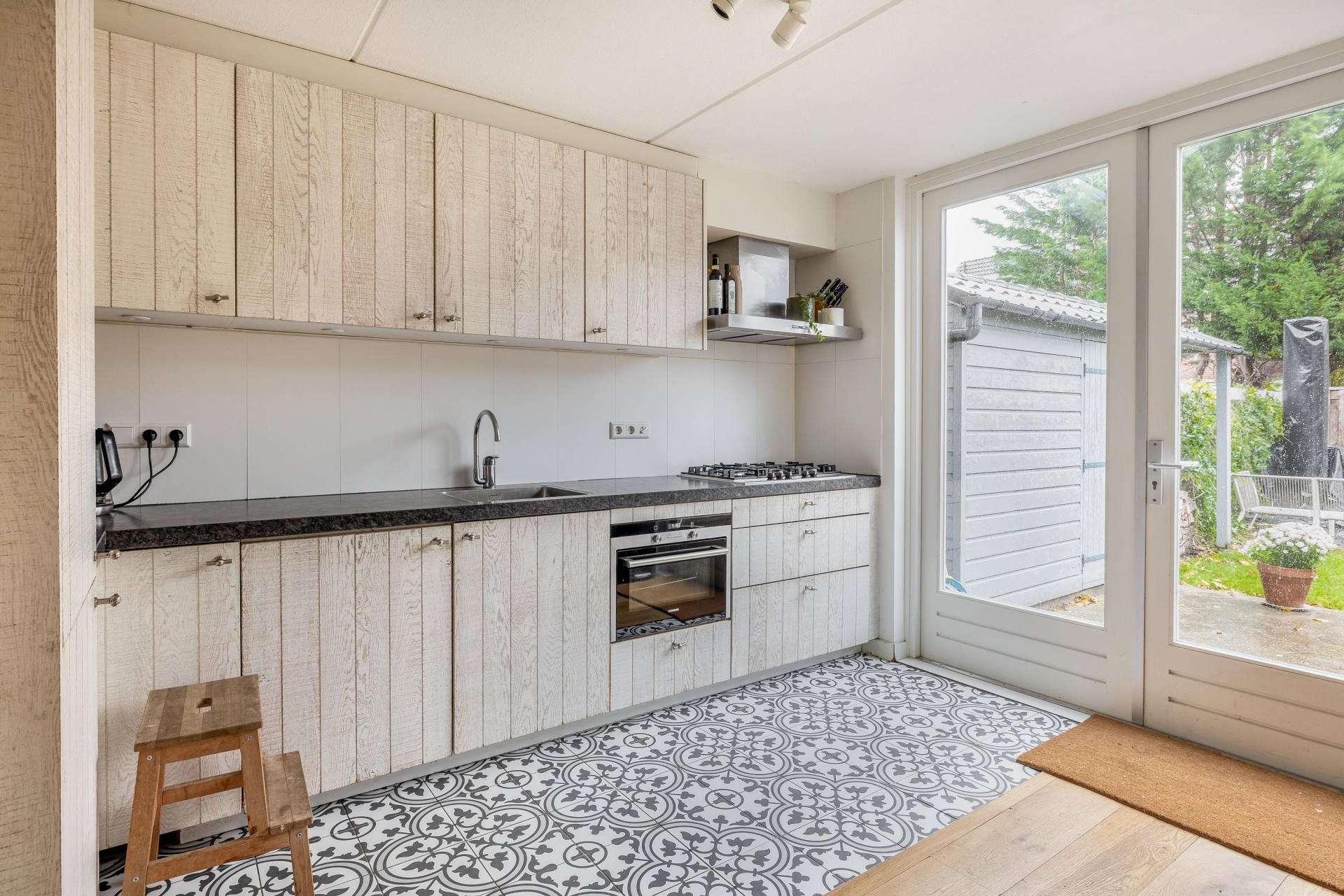 De keuken kijkt uit op de tuin. De open keuken biedt voldoende werk- en bergruimte: een fijne plek om te koken. Via de openslaande deuren sta je direct in de tuin om buiten te eten op zomerse dagen. De vloer met motieftegel geeft de ruimte een eigen karakter.