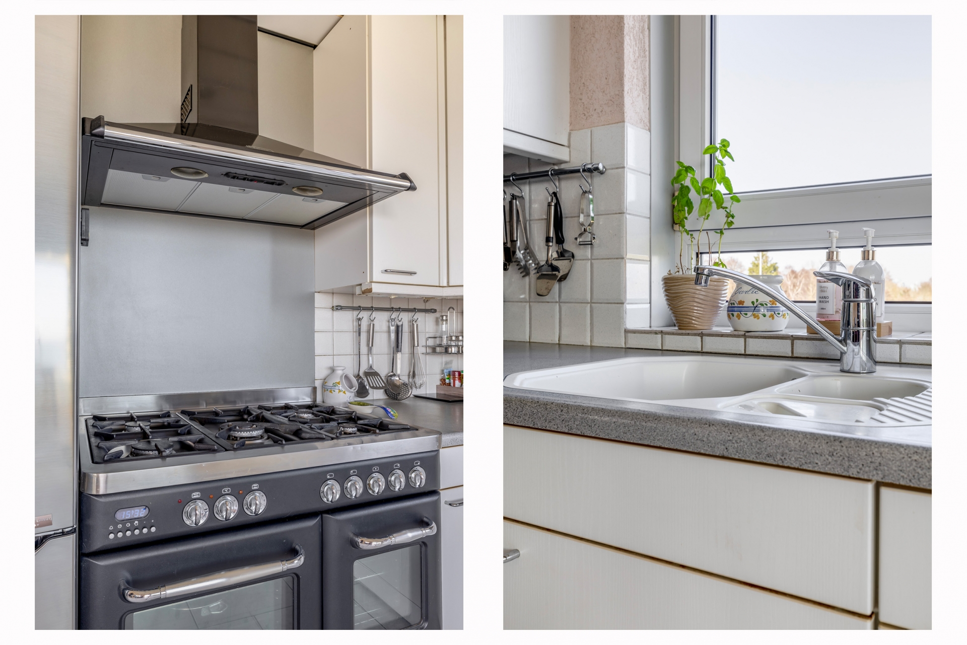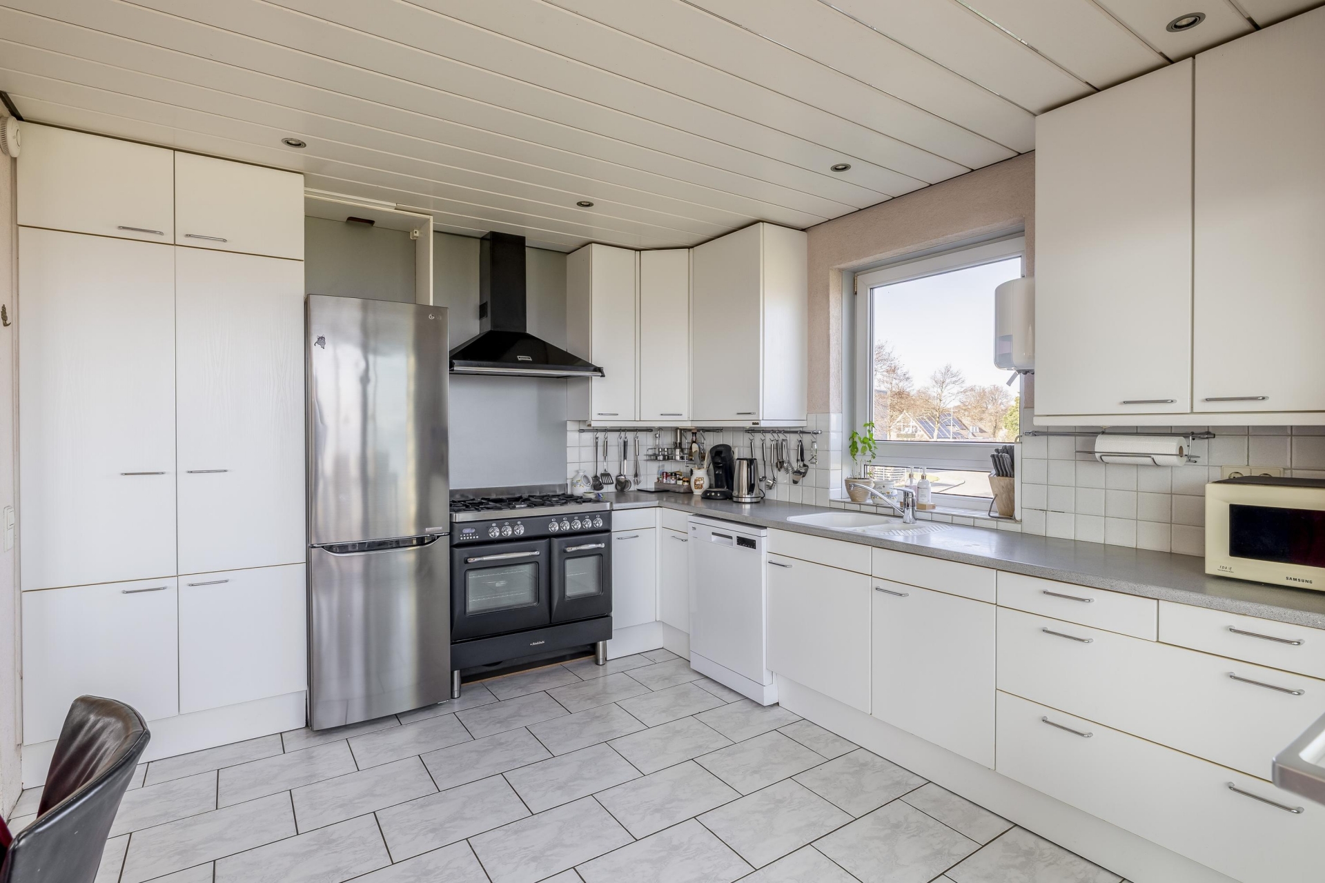 De keuken is praktisch ingericht en biedt voldoende werkruimte en opbergruimte. Vanuit de keuken loop je direct door naar de serre, een fijne plek waar je het hele jaar door kunt genieten van het prachtige uitzicht.