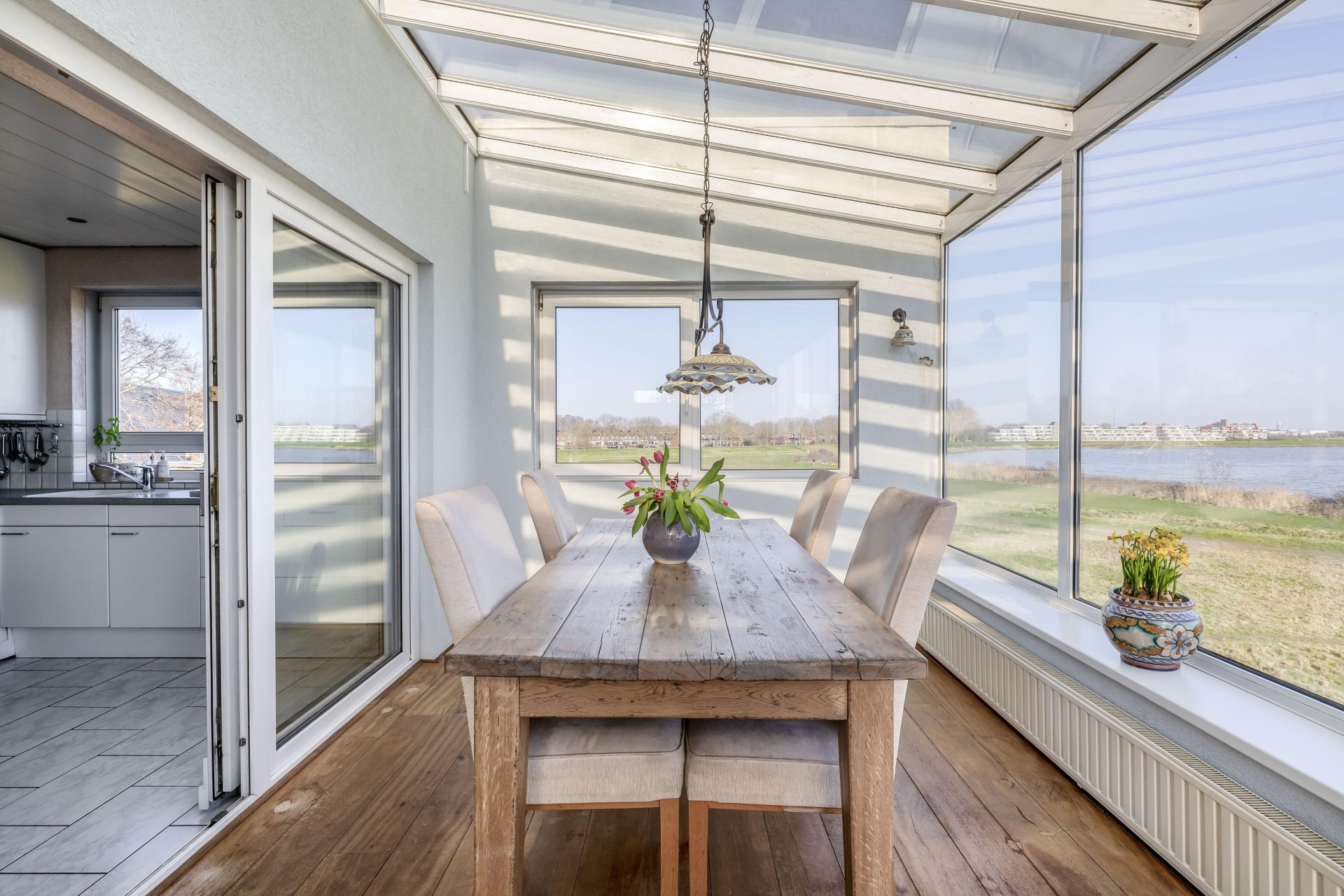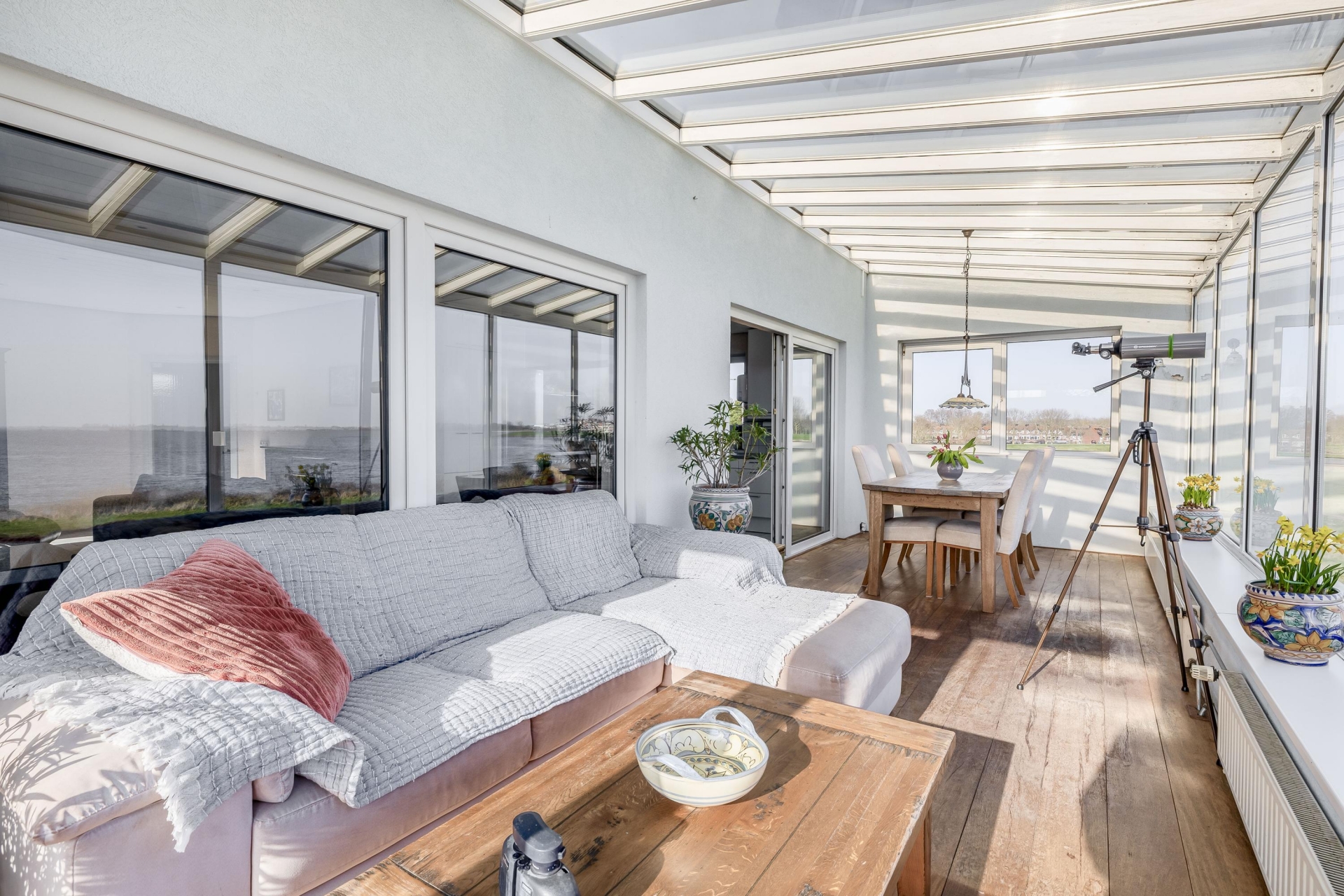 De woonkamer is ruim opgezet en heeft grote raampartijen waardoor het uitzicht op het Haringvliet continu aanwezig is. De open indeling zorgt voor een prettige leefruimte waar de zithoek, eethoek en keuken mooi in elkaar overlopen.