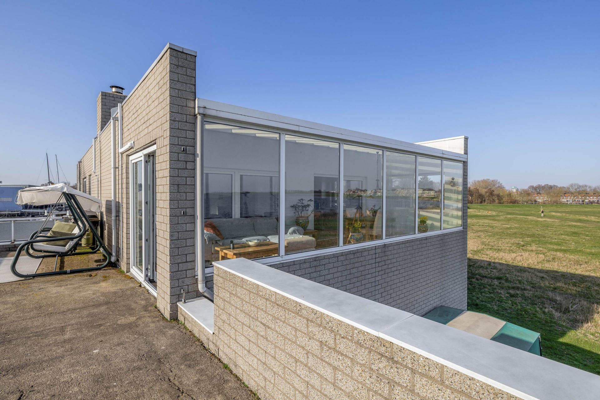 Dit is een plek waar je op zonnige dagen heerlijk kunt ontspannen, dineren met vrienden of simpelweg genieten van de rust en de pleziervaartuigen die voorbijtrekken. Door de open ligging en de ruimte rondom het huis ervaar je hier een bijzonder gevoel van vrijheid.