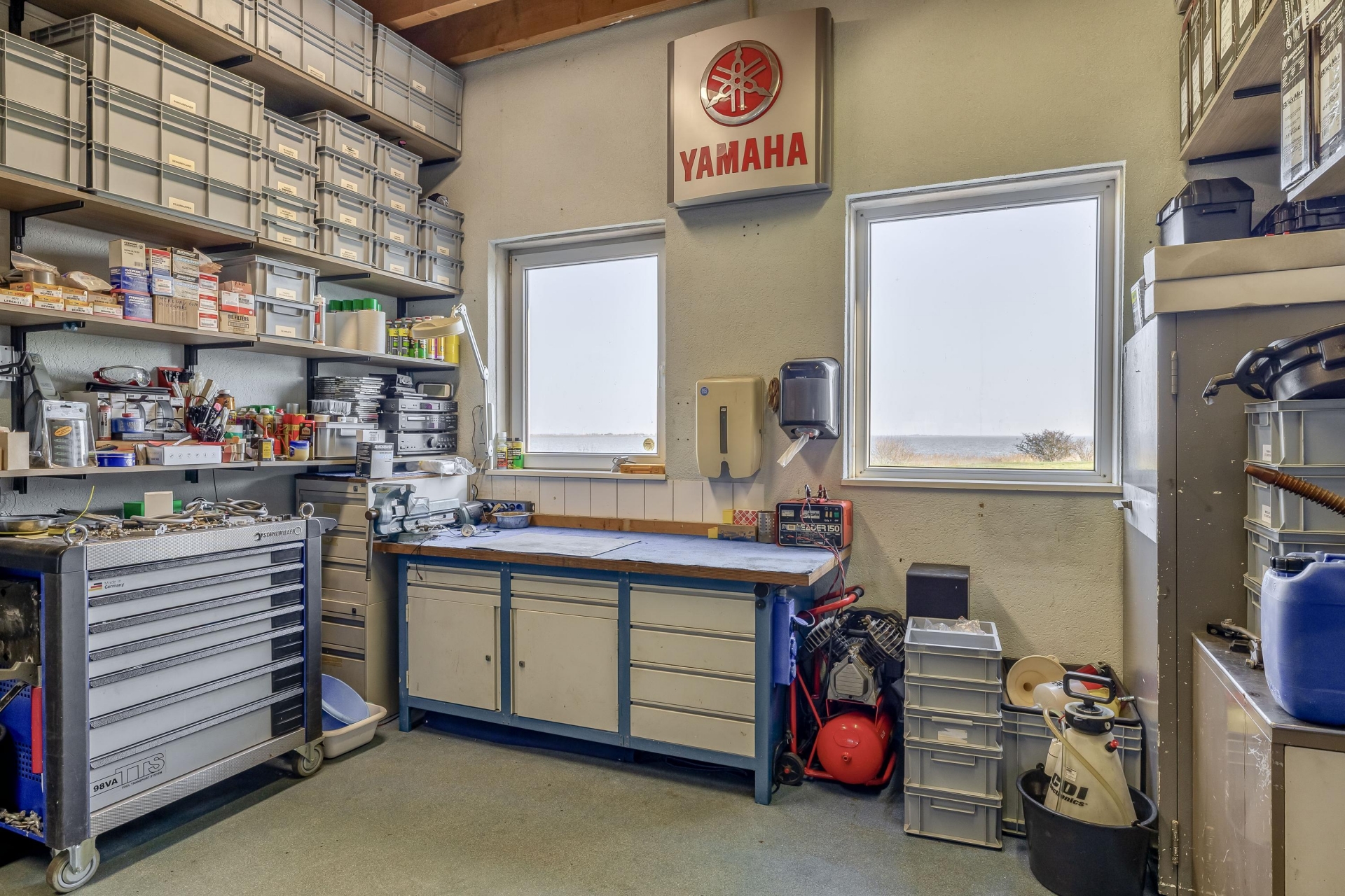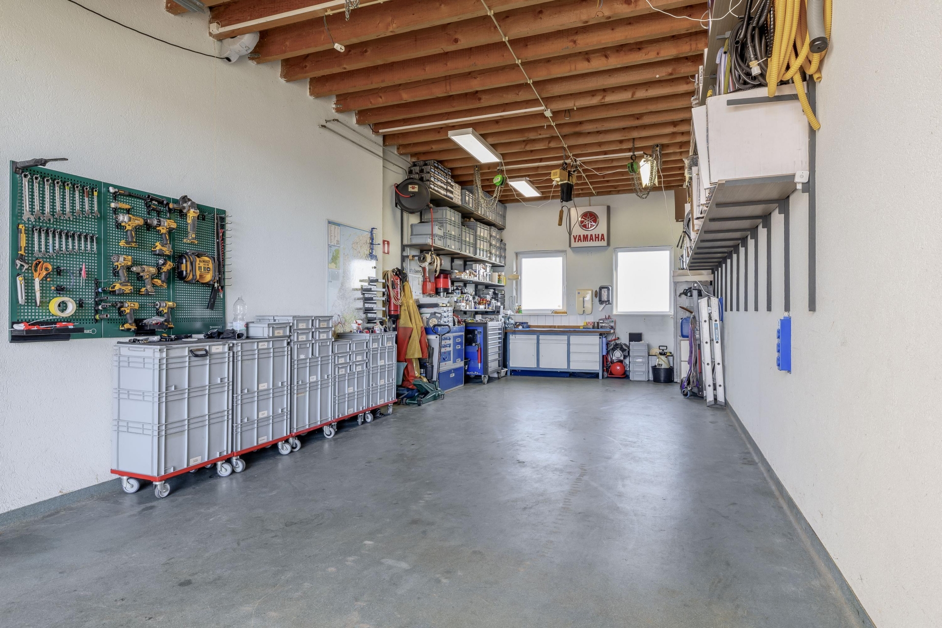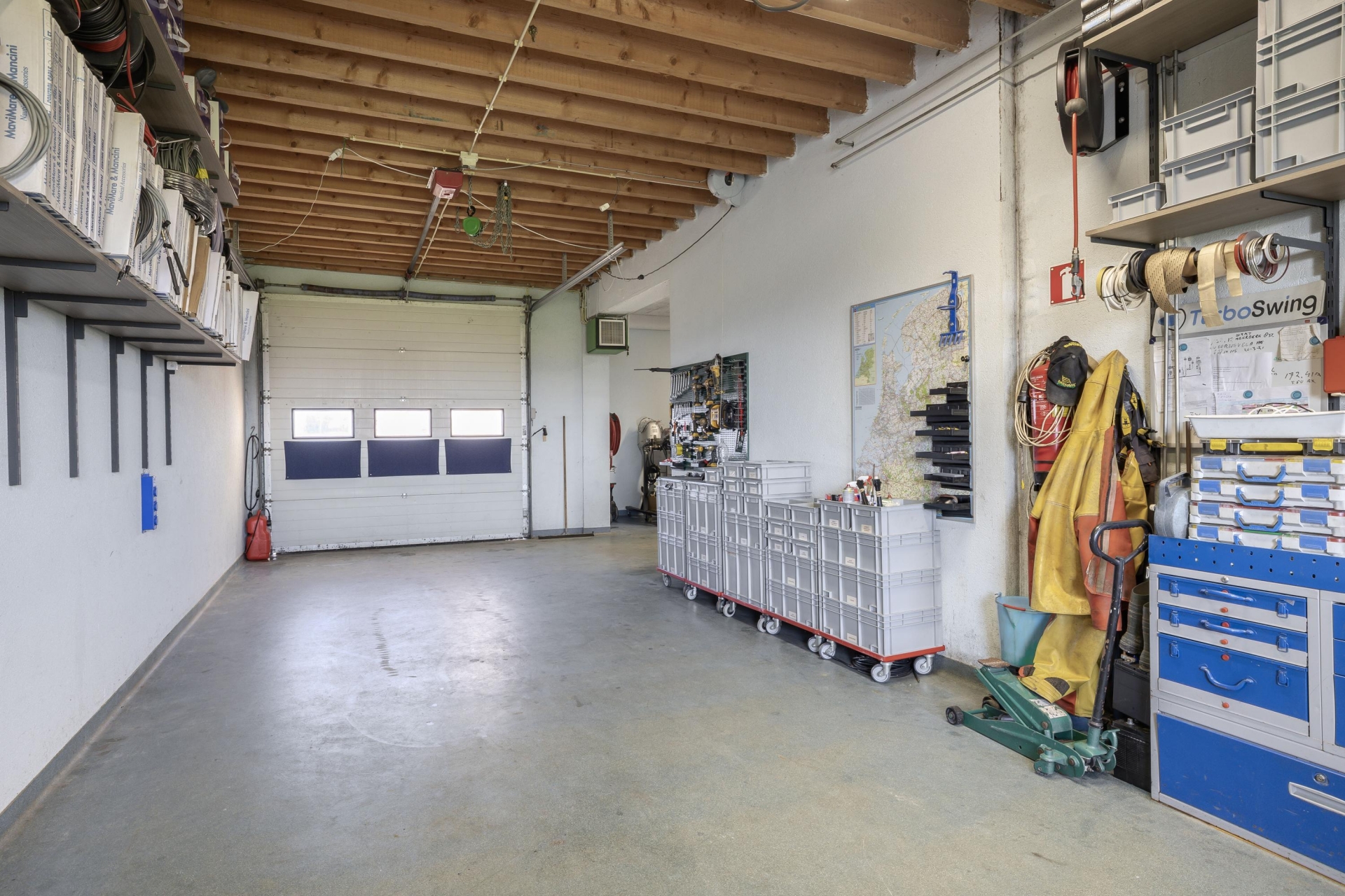 Aangrenzend bevindt zich een garage/werkplaats van circa 46 m² met een grote elektrische overheaddeur. Hierdoor is de ruimte goed toegankelijk voor voertuigen of grotere materialen. De garage is eveneens voorzien van elektra en verwarming, wat het gebruik extra comfortabel maakt.