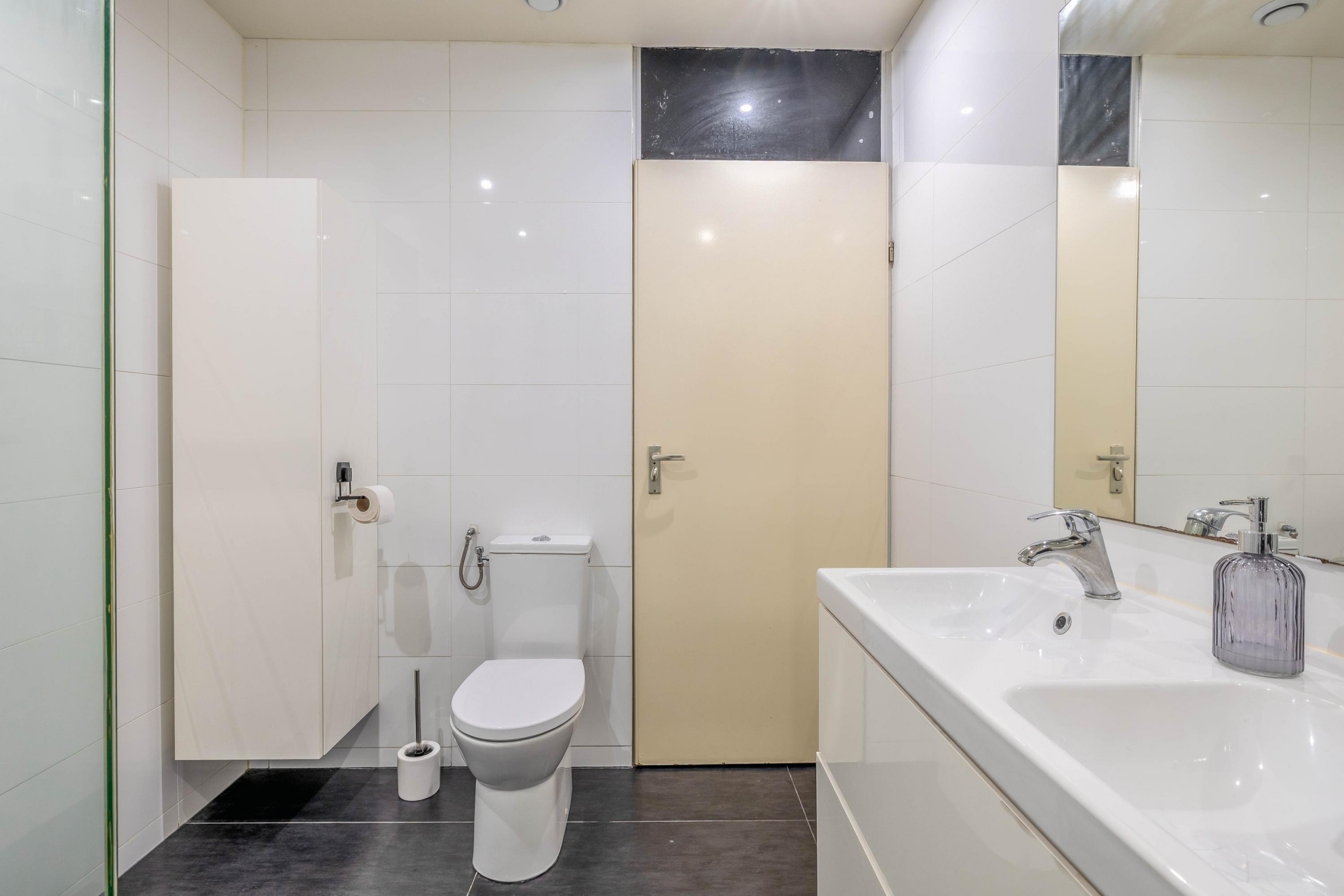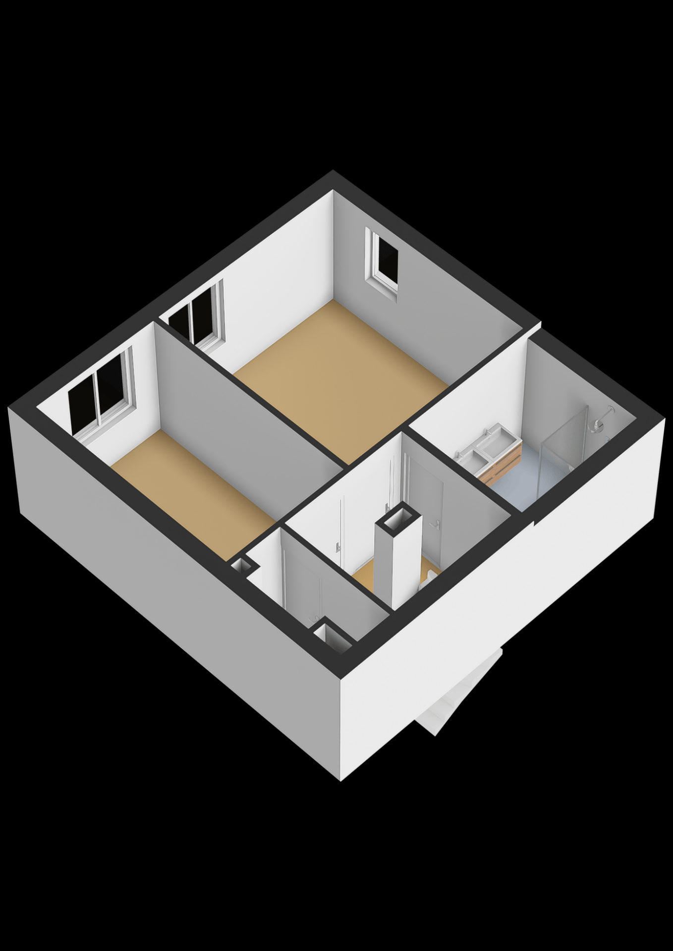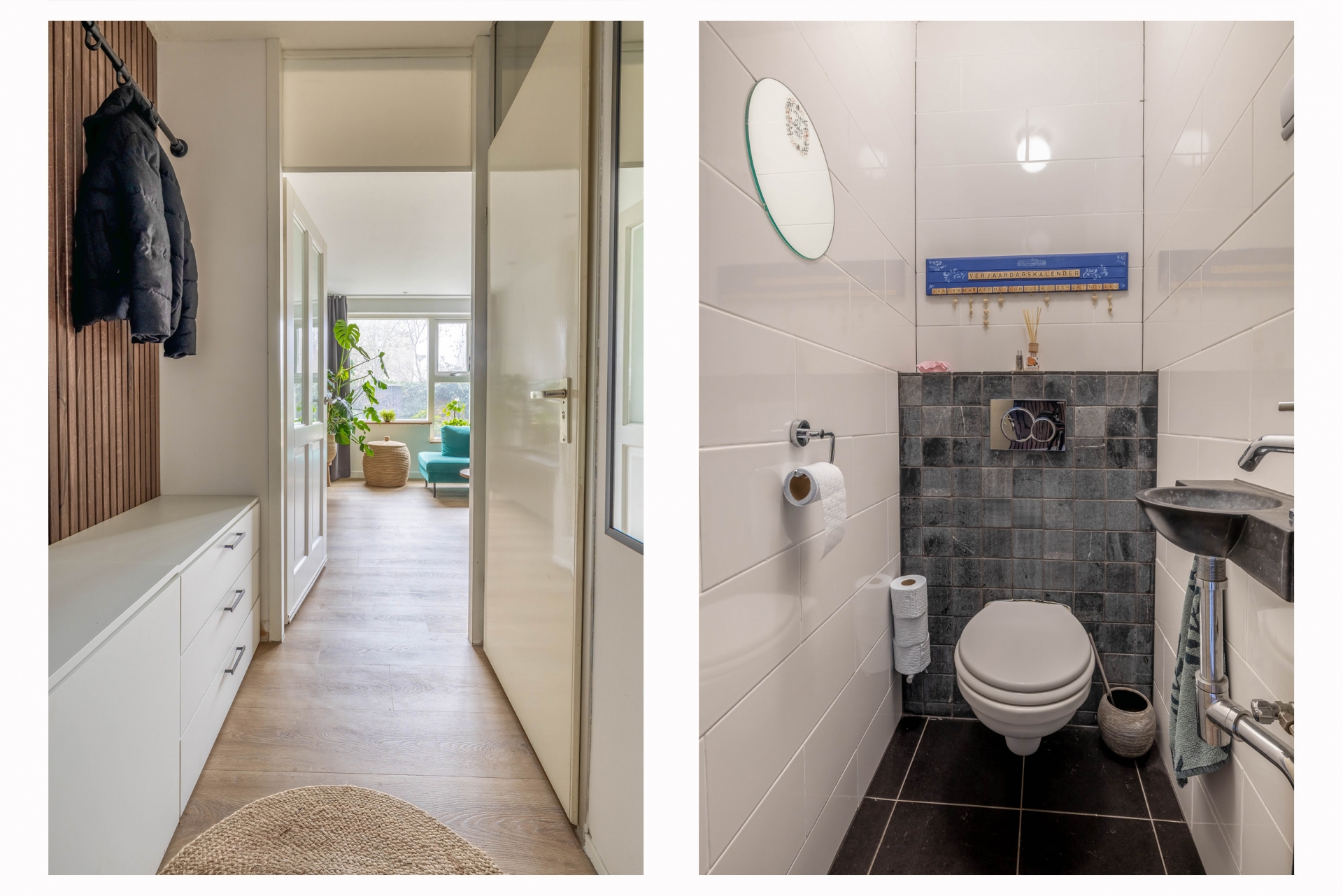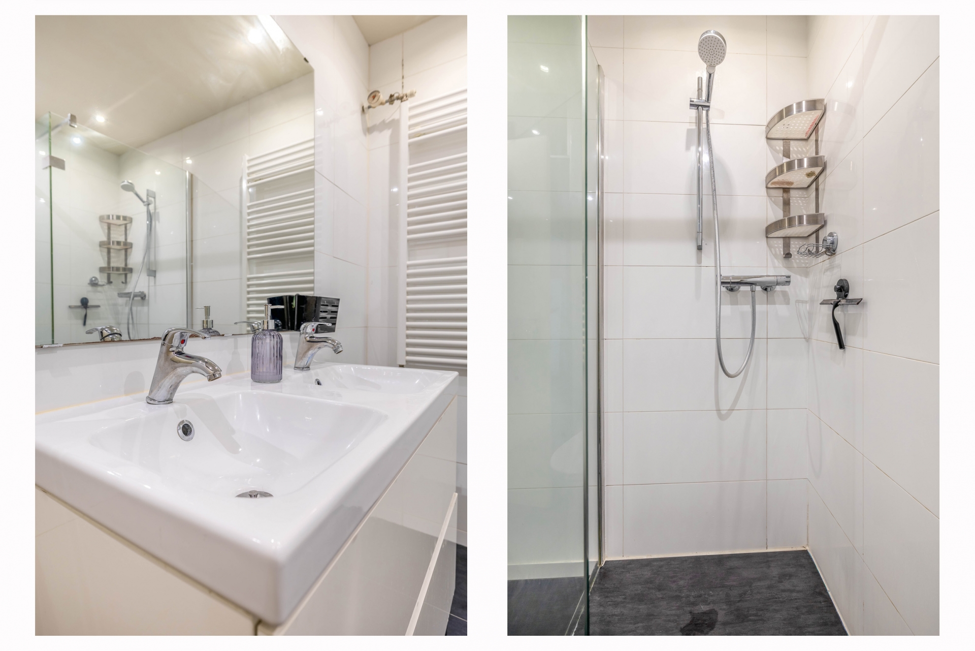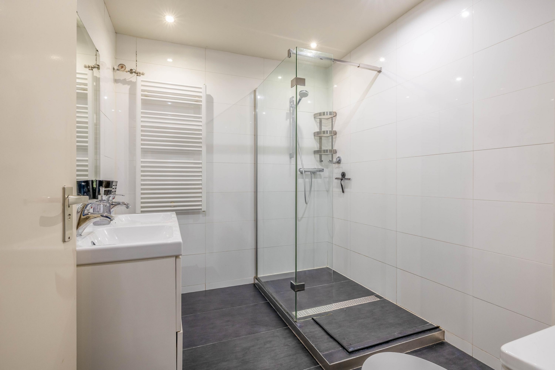 De badkamer is strak en verzorgd uitgevoerd met een ruime inloopdouche, wastafelmeubel en designradiator. De lichte wandafwerking in combinatie met de donkere vloertegels zorgt voor een frisse en tijdloze uitstraling. Alles is netjes onderhouden, waardoor je hier zonder verbouwen kunt intrekken.
