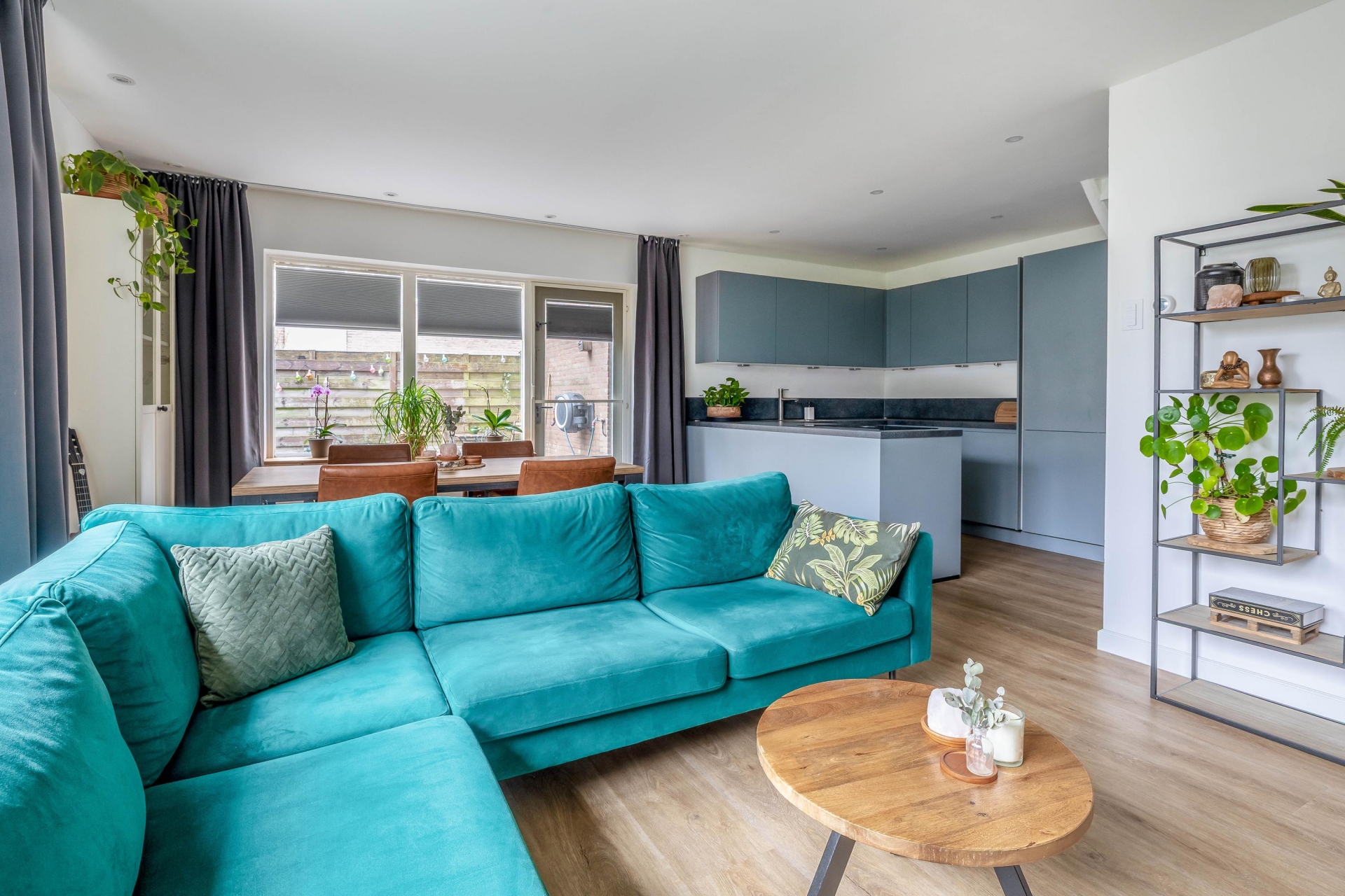 De woonkamer is een fijne leefruimte waar je met gemak een royale zithoek én een grote eettafel kwijt kunt. Wat direct opvalt is het verlaagde plafond met inbouwspots, wat zorgt voor een strakke en warme uitstraling. De vloerverwarming maakt het comfort compleet. Grote raampartijen aan de tuinzijde zorgen voor veel daglicht en een prettige verbinding met buiten. Dit is echt zo’n plek waar iedereen samenkomt of juist zijn eigen hoekje vindt.