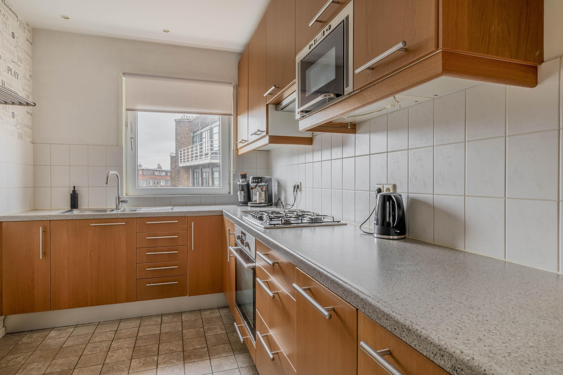 De aangrenzende keuken is opgesteld in een praktische L-vorm en voorzien van inbouwapparatuur zoals een oven, magnetron, gaskookplaat en een koel-vriescombinatie. Er is voldoende kastruimte en ook een vaatwasser is eenvoudig te realiseren. In de hal bevindt zich een apart toilet met mechanische ventilatie én extra kastruimte met wasmachineaansluiting. Alles praktisch en netjes weggewerkt.