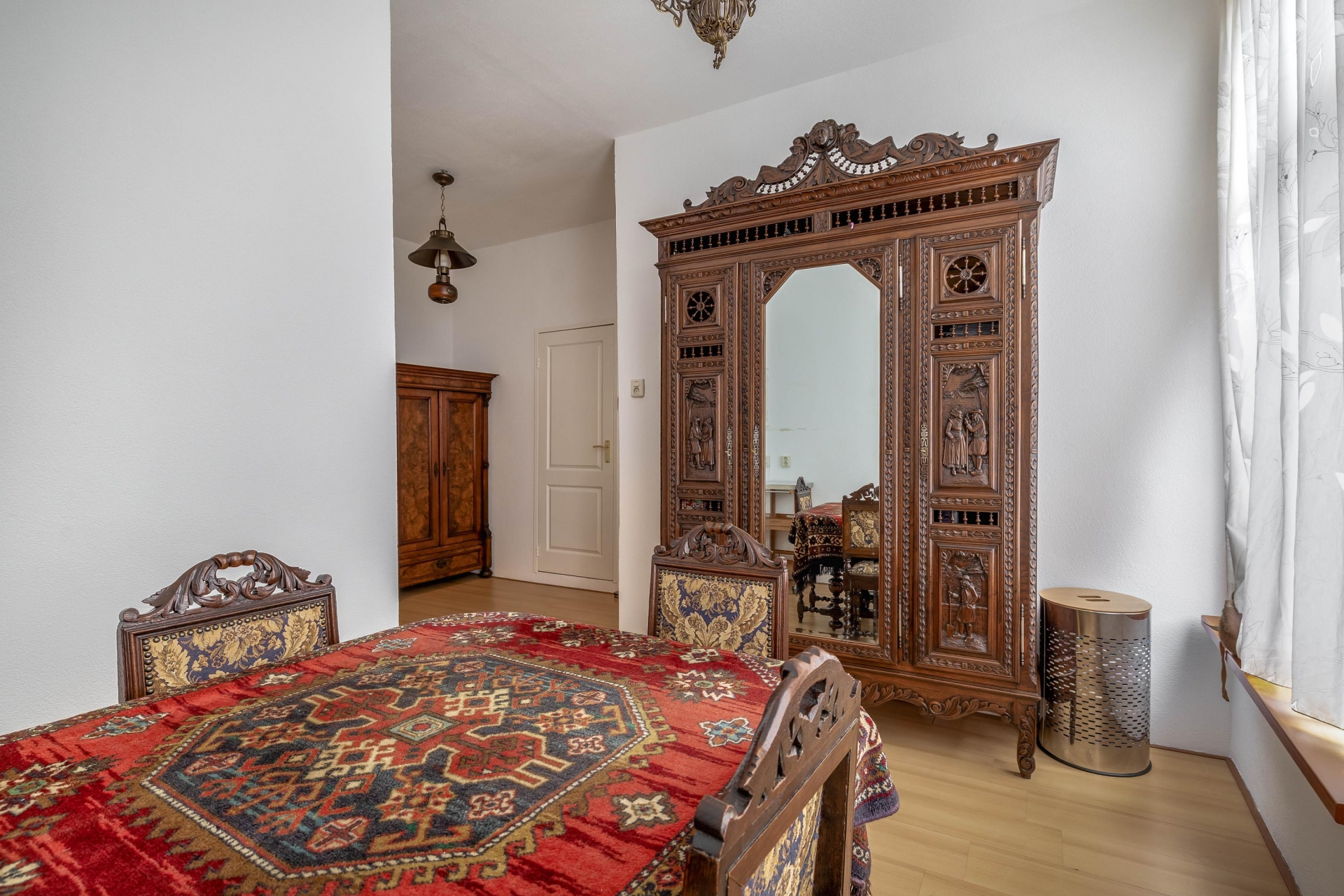 De woning straalt historie uit, met prachtige hoge plafonds, houten balken en klassieke raampartijen die het daglicht royaal binnenlaten. De woonkamer aan de voorzijde is sfeervol ingericht met originele details zoals de fraaie toog, houten kozijnen en brede raampartijen. Hier is de tijd op een mooie manier stil blijven staan, maar met voldoende ruimte om het geheel naar eigen smaak en comfort te moderniseren.