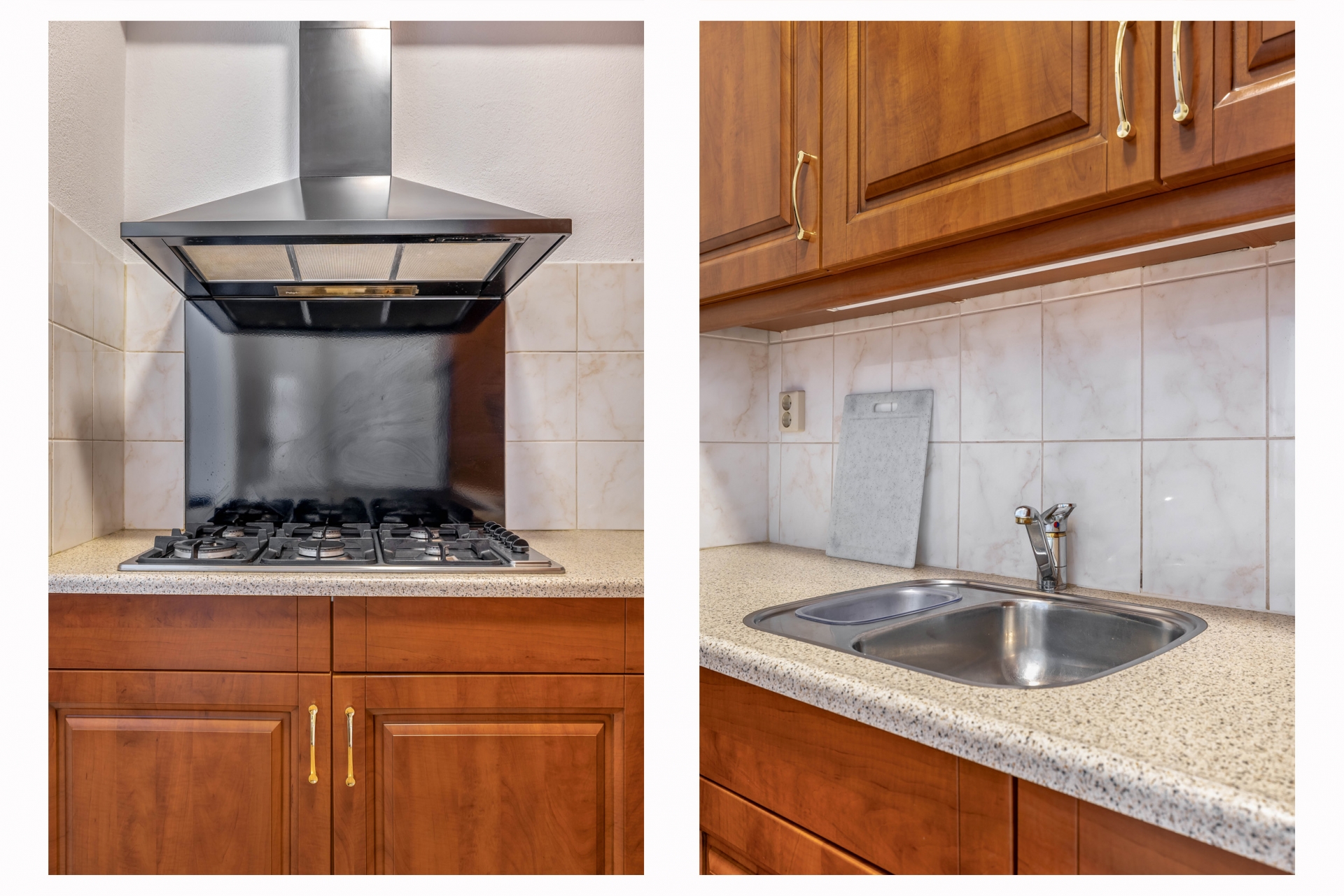 Achter de woonkamer bevindt zich de aparte keuken, voorzien van een klassieke houten keukenopstelling met veel kastruimte en diverse inbouwapparatuur. De keuken is functioneel en verzorgd, en sluit goed aan op de authentieke uitstraling van het huis. Vanuit de eetkamer heb je ook toegang tot de badkamer, die eenvoudig is uitgevoerd en voorzien van een douche, wastafel en toilet.