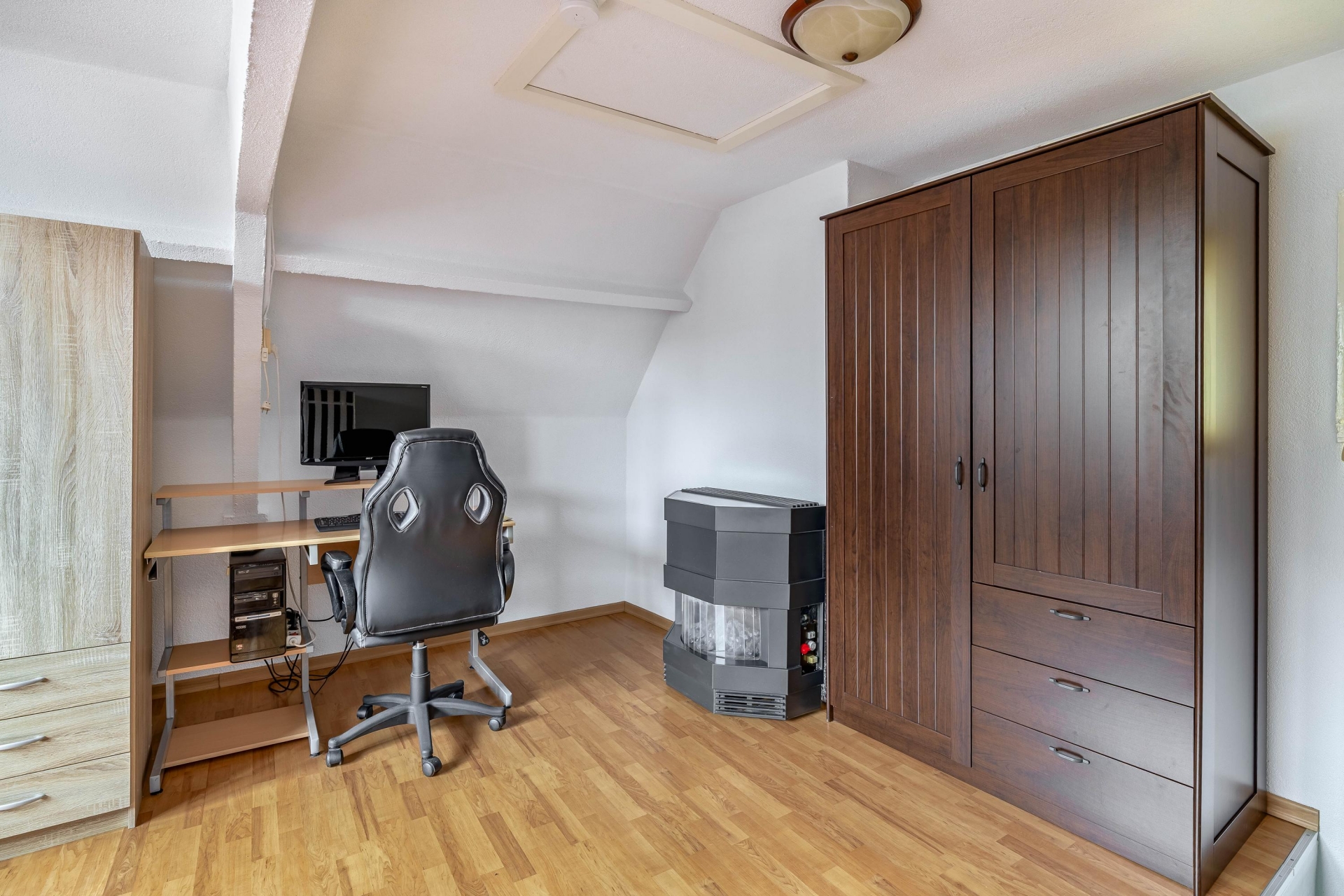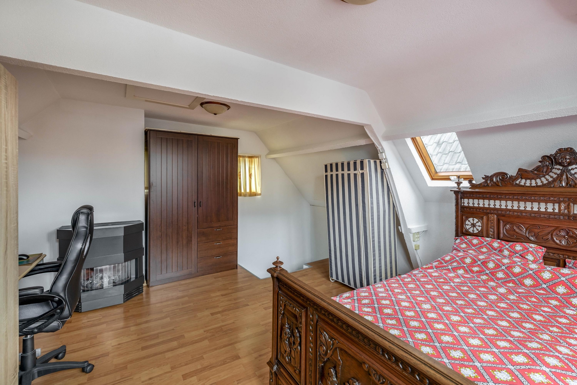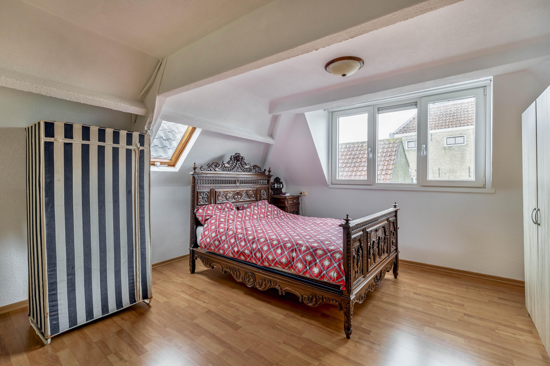 Op de eerste verdieping vind je een woon- of slaapkamer gelegen aan de voorzijde van de woning. De tweede verdieping is een volwaardige extra woonlaag, momenteel in gebruik als royale slaapkamer met dakramen en vaste trapopgang. Deze ruimte kun je natuurlijk ook inzetten als werkplek, studio of hobbyruimte. Tot slot is er nog een luik naar de vlizozolder, ideaal voor het opbergen van seizoensspullen en koffers.